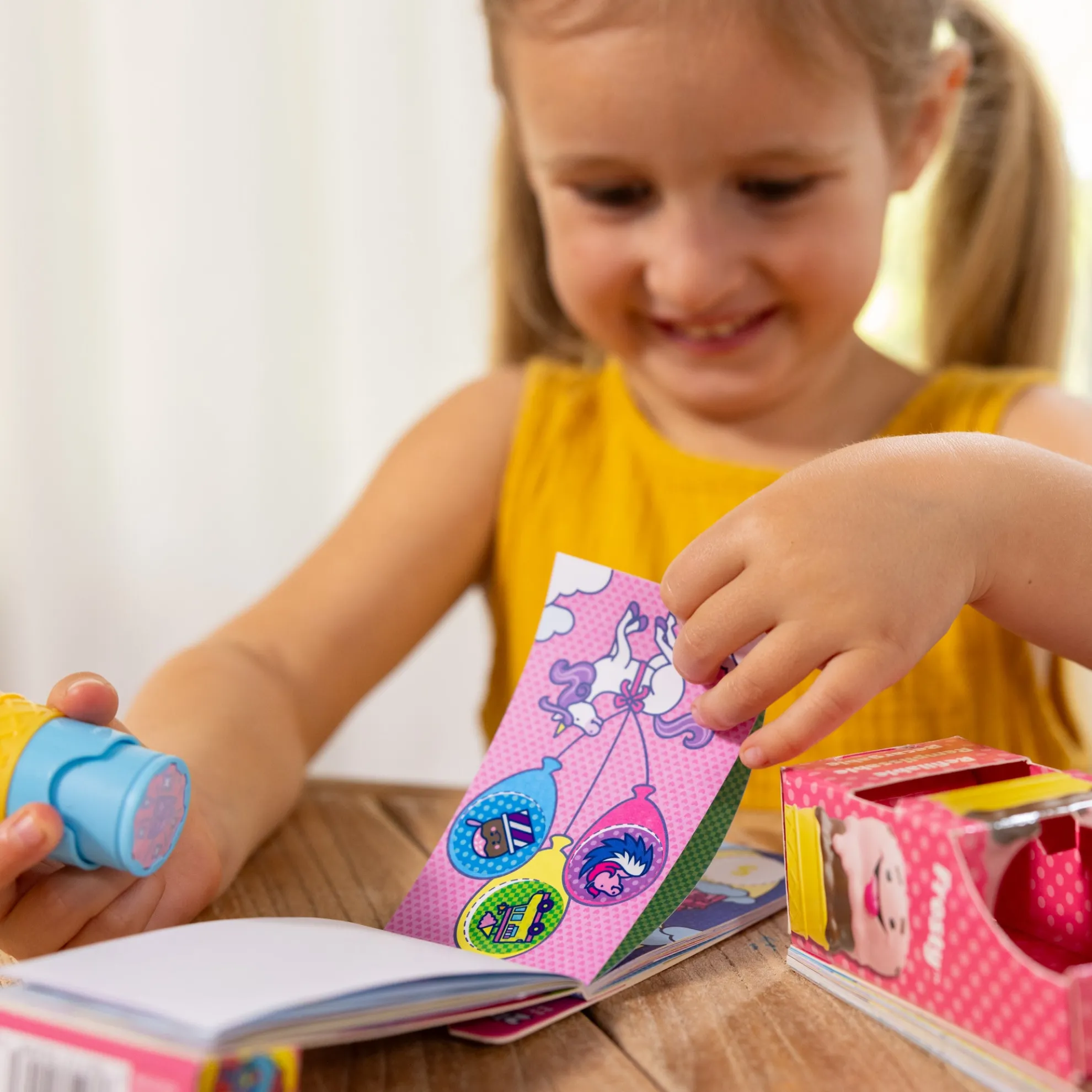 Melissa & Doug Sticker WOW!™ is a whole new way to play with stickers! Let the adorable, collectible Frosty the Ice Cream stamp, stamp, stamp its way through 24 pages of fun-filled, treats-themed counting, matching, and search-and-find activities. The refillable sticker stamper comes pre-loaded with a sticker stack of 300 assorted stickers – with 100 unique designs in every stack, each sticker is a surprise! Plus, this set is bundled with a refill pack of 200 EXTRA favorite-things-themed stickers (compatible with any Sticker WOW!™ sticker stamper) and an additional mini prehistoric-themed activity pad for even more Sticker WOW!™ fun. Stickers are not reusable, but are easy to remove if necessary. Fill in the activity pages and use for creative art projects, such as bookmarks, posters, cards, and more. Easy-to-remove stickers and the convenient on-the-go format with built-in sticker stamper storage makes Sticker WOW!™ a great mess-free travel activity. Sticker WOW!™ (patent pending) promotes fine motor skills, encourages creative play, and it’s satisfying, fidget fun!