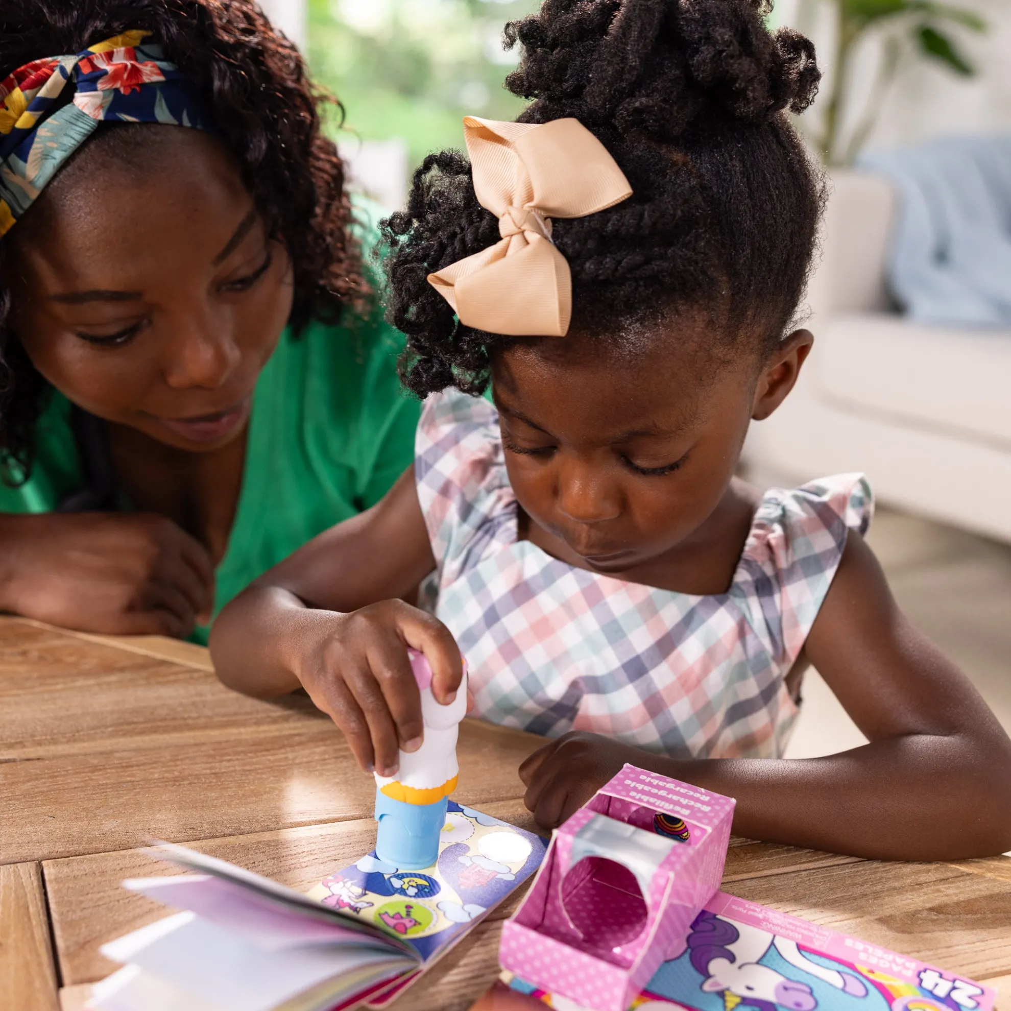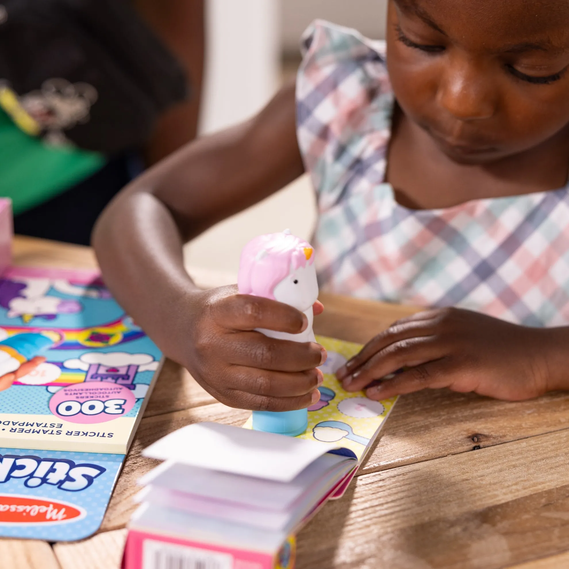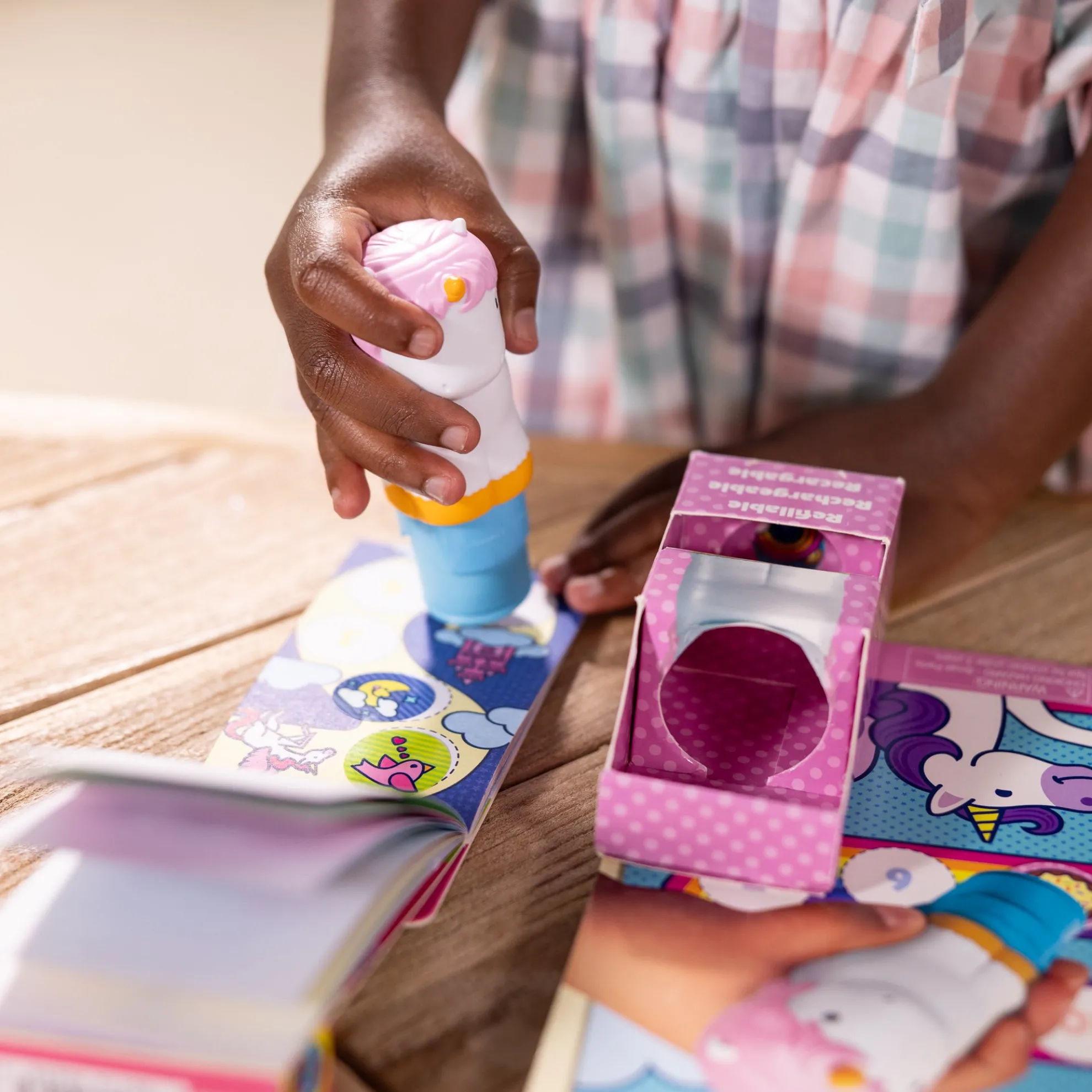 Melissa & Doug Sticker WOW!™ is a whole new way to play with stickers! Let the adorable, collectible Cupcake the Unicorn stamp, stamp, stamp its way through 24 pages of fun-filled, unicorn-themed counting, matching, and search-and-find activities. The refillable sticker stamper comes pre-loaded with a sticker stack of 300 assorted stickers – with 100 unique designs in every stack, each sticker is a surprise! Plus, this set is bundled with a refill pack of 200 EXTRA favorite things-themed stickers (compatible with any Sticker WOW!™ sticker stamper) and an additional mini favorite things-themed activity pad for even more Sticker WOW!™ fun. Stickers are not reusable, but are easy to remove if necessary. Fill in the activity pages and use for creative art projects, such as bookmarks, posters, cards, and more. Easy-to-remove stickers and the convenient on-the-go format with built-in sticker stamper storage makes Sticker WOW!™ a great mess-free travel activity. Sticker WOW!™ (patent pending) promotes fine motor skills, encourages creative play, and it’s satisfying, fidget fun!