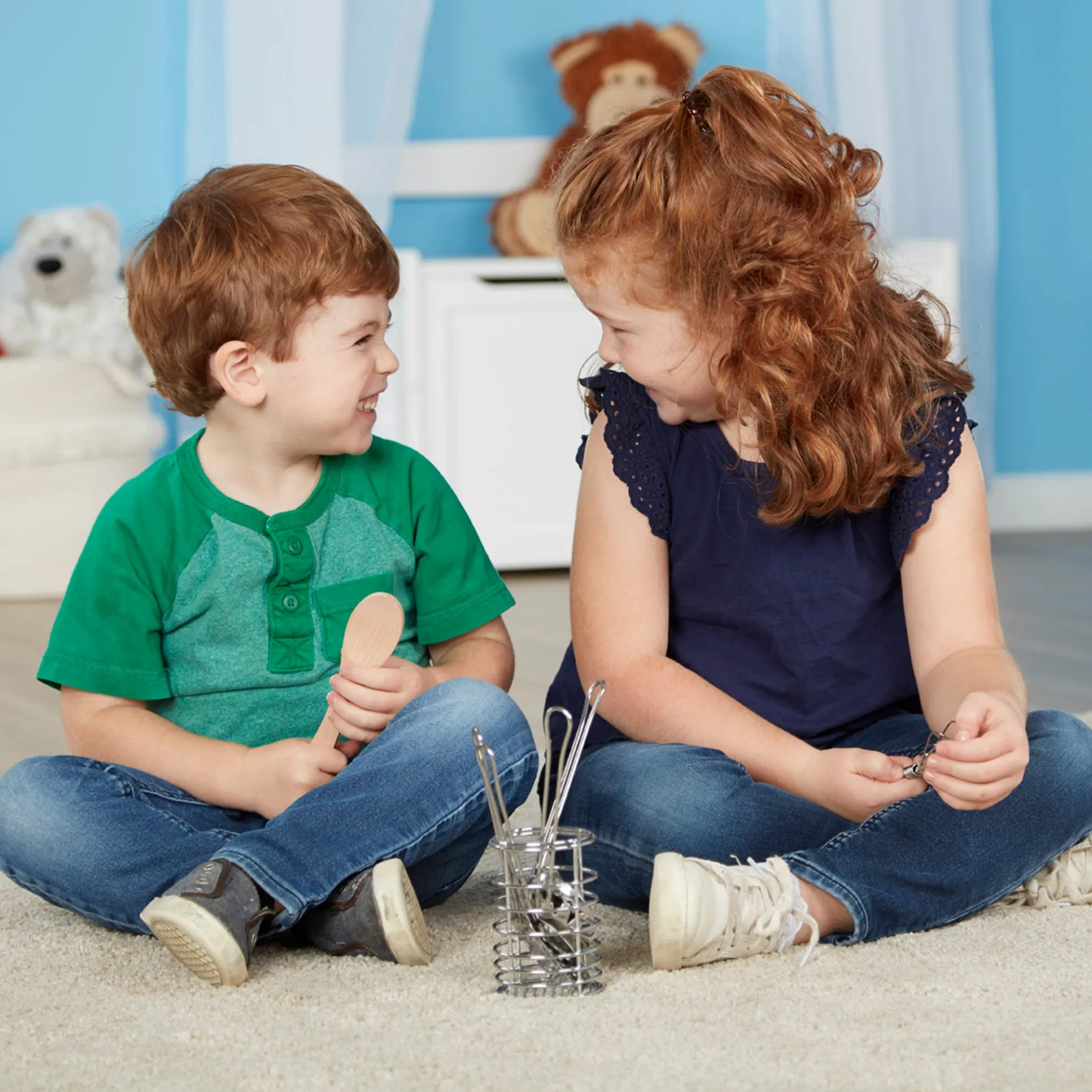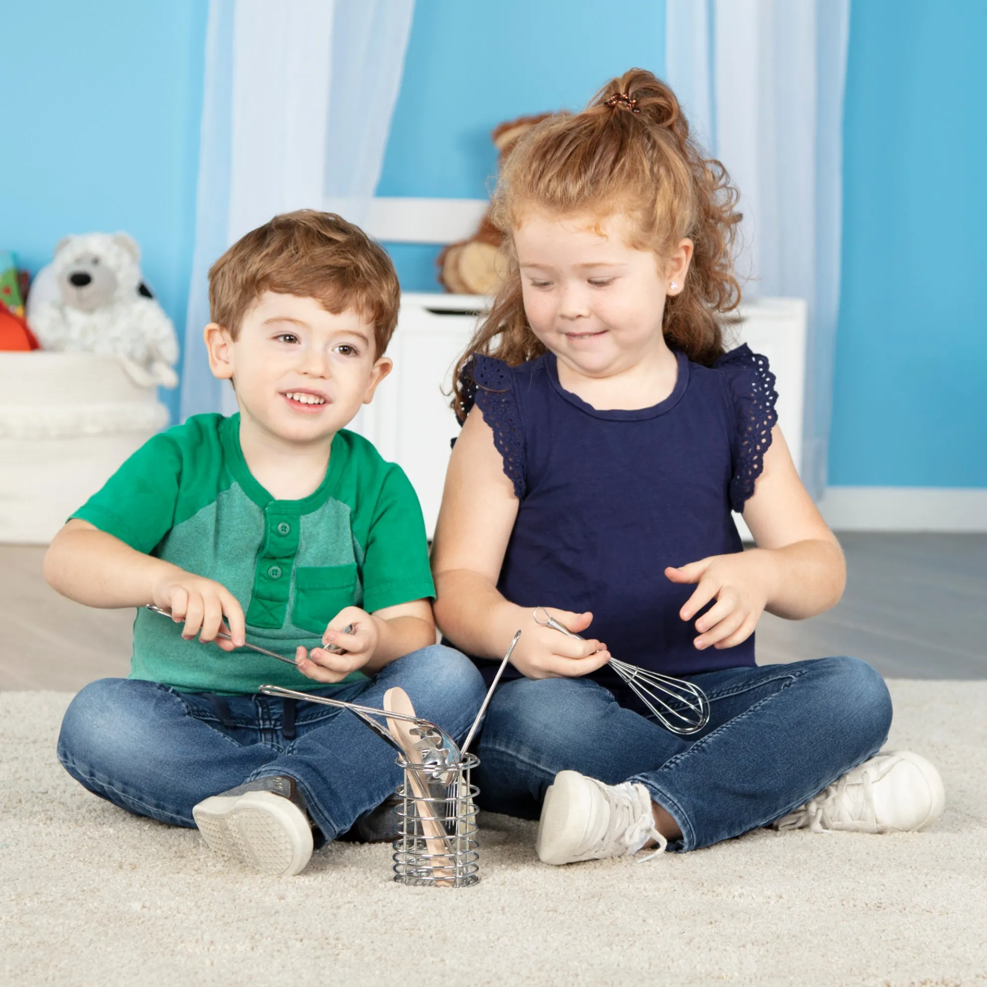 This 7-piece pretend play set brings a professional touch to play kitchens! Six sturdy pretend play utensils, made of stainless steel and wood, are generously sized to offer a pleasingly realistic effect for little chefs. And all of the tools—including whisk, ladle, slotted spoon, spaghetti server, and wooden spoon—fit in a metal holder to bring a shining touch to pretend play! Durable and built to last, the set is sized to coordinate with Melissa & Doug’s line of pretend-play accessories.