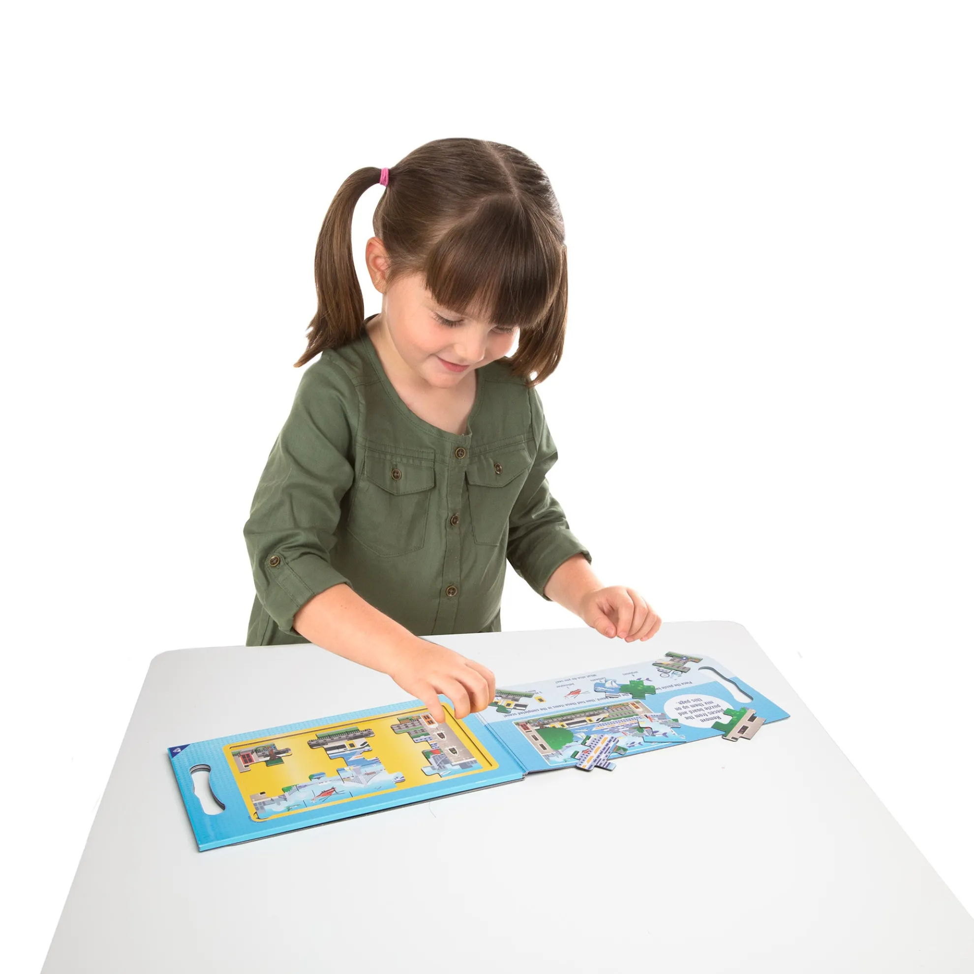 - 2 15-piece vehicle-themed magnetic jigsaw puzzles in a compact, fold-out format
