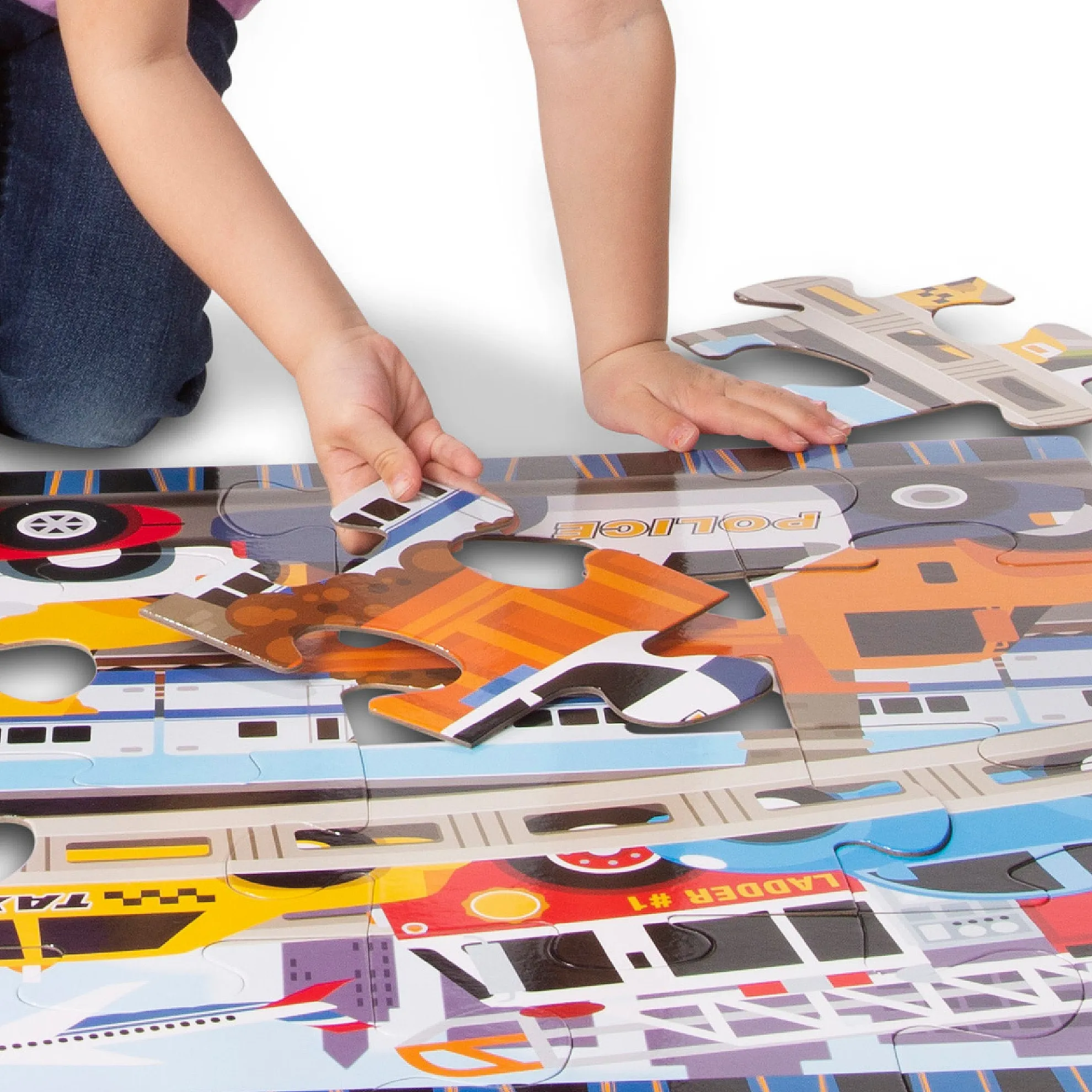 Beep beep! With so many vehicles to identify, no one would mind sitting in this traffic jam! This large floor puzzle features brightly colored vehicles that kids can recognize such as a cement truck, a taxi, a police car, and even a plane and a train in this multi-vehicle scene. While playing with this Traffic Jam Puzzle, kids ages three and older can practice shape recognition, hand-eye coordination, and problem-solving skills. And they’ll have loads of fun while doing it! They might recognize some of their favorite vehicles that can inspire them for storytelling and other imaginative play. The puzzle includes 24 jumbo pieces made out of durable, extra-thick cardboard. Once the puzzle is completed and set up, it measures 36 inches x 24 inches fully assembled. Don’t worry about your kids playing with the floor puzzle over and over again…the puzzle pieces are not just durable, they’re made with an easy to clean surface that helps to keep it looking like new. The Traffic Jam Floor Puzzle makes an exceptional birthday gift or holiday gift for kids ages three and older. This product is certified by the Forest Stewardship Council. FSC certification ensures that products come from responsibly managed forests that provide environmental, social, and economic benefits, and that forests are protected for future generations. Please note that FSC certification applies to new inventory only (FSC C156584).
