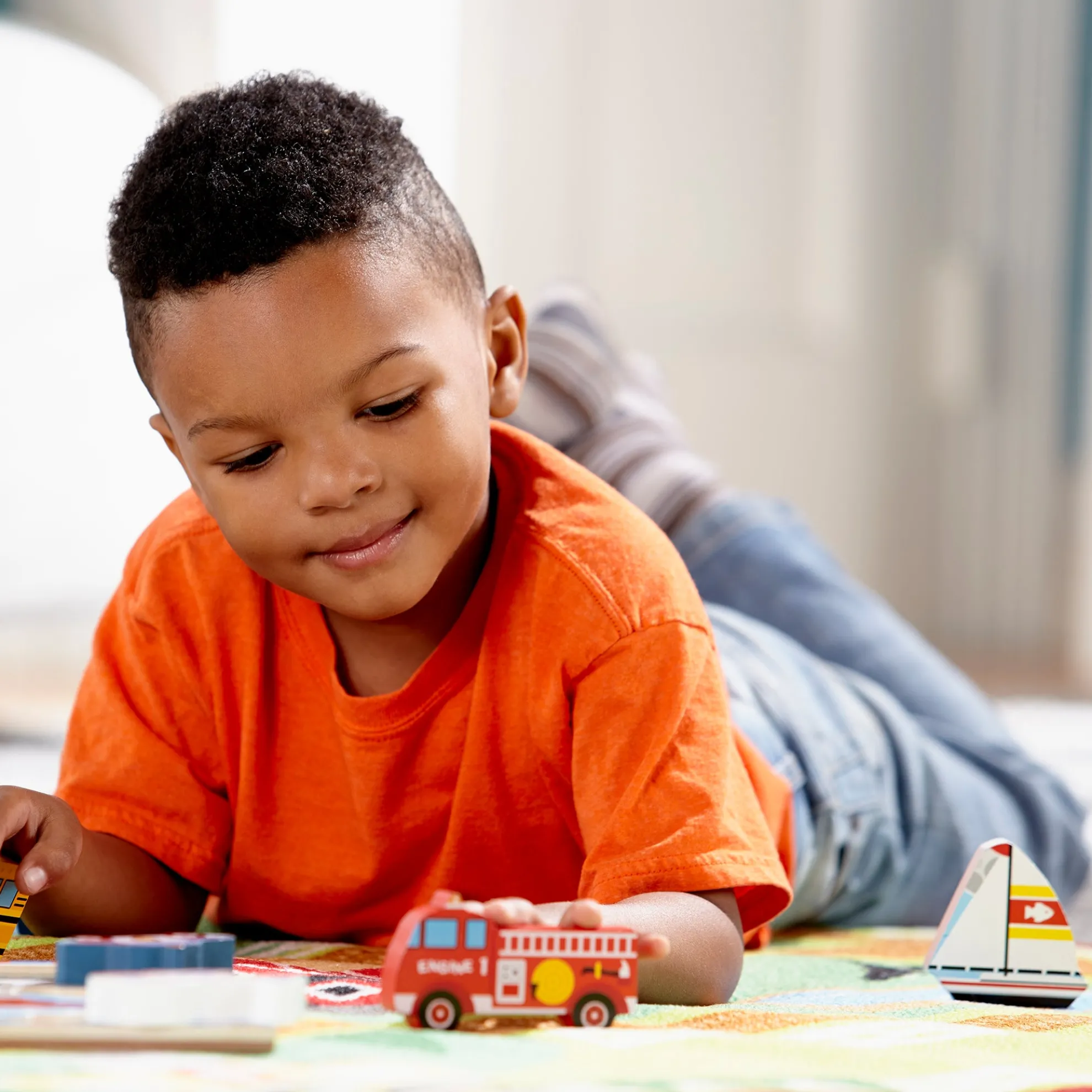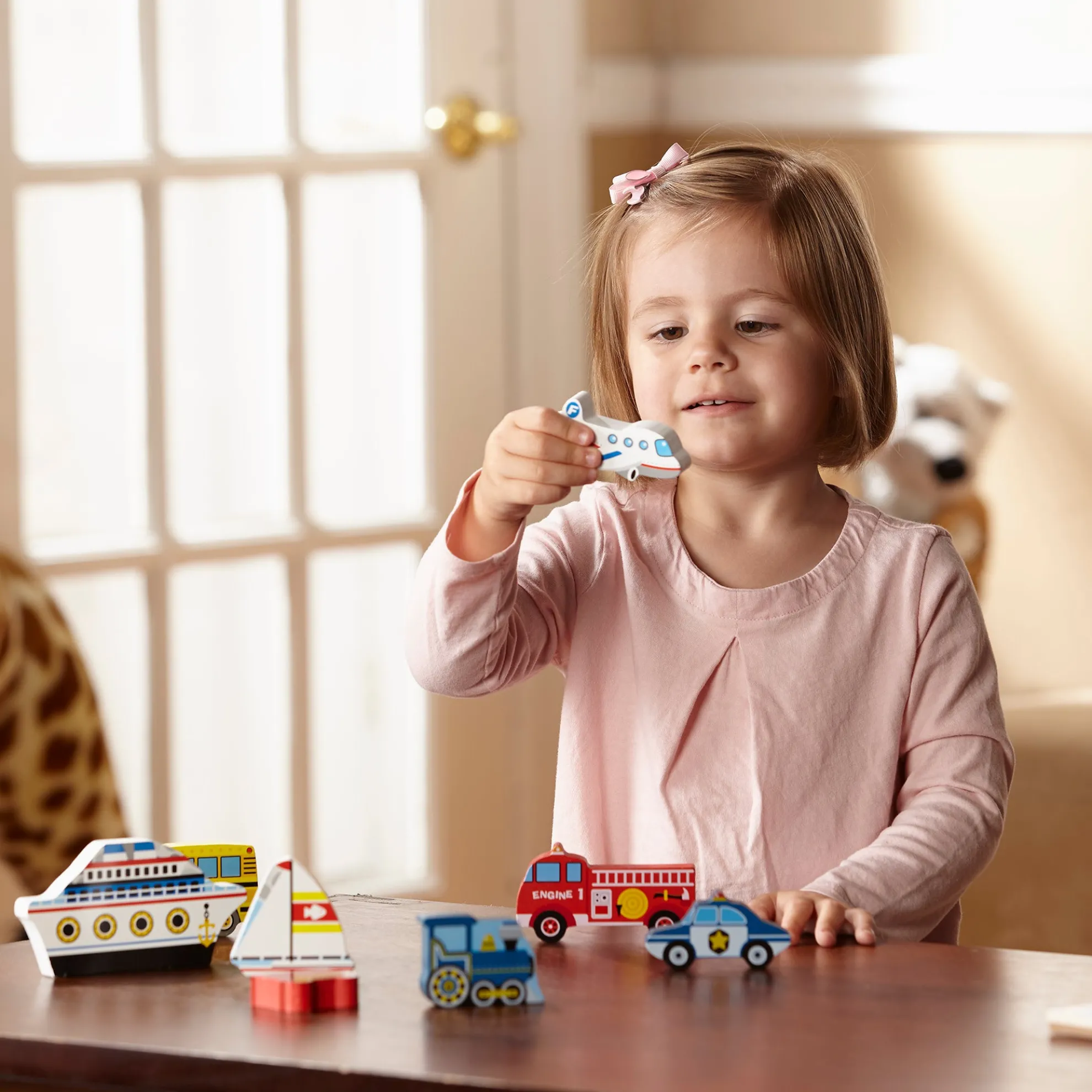 On the road, on the rails, by sea or by air, imaginations travel far and wide with this extra-thick wooden puzzle. Featuring nine easy-grasp, chunky vehicle pieces that can stand upright for pretend play. Each vehicle has a full-color, matching picture underneath. Encourages hand-eye, fine motor and creative expression skills. This product is certified by the Forest Stewardship Council. FSC certification ensures that products come from responsibly managed forests that provide environmental, social, and economic benefits, and that forests are protected for future generations. Please note that FSC certification applies to new inventory only (FSC C156584).
