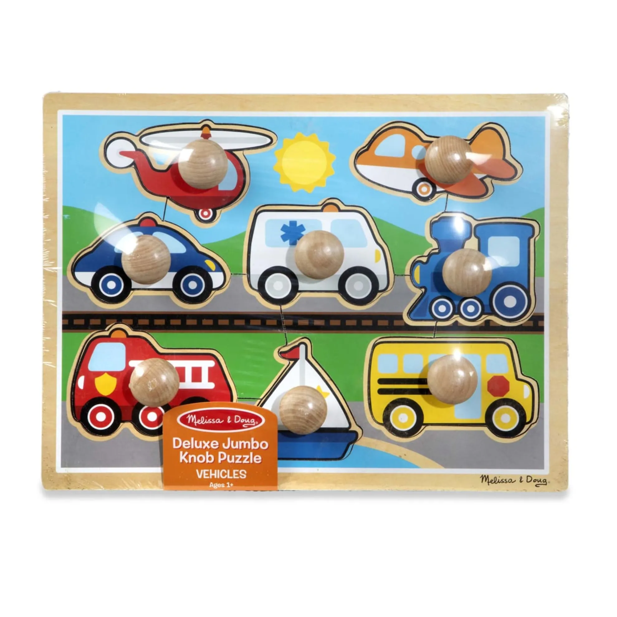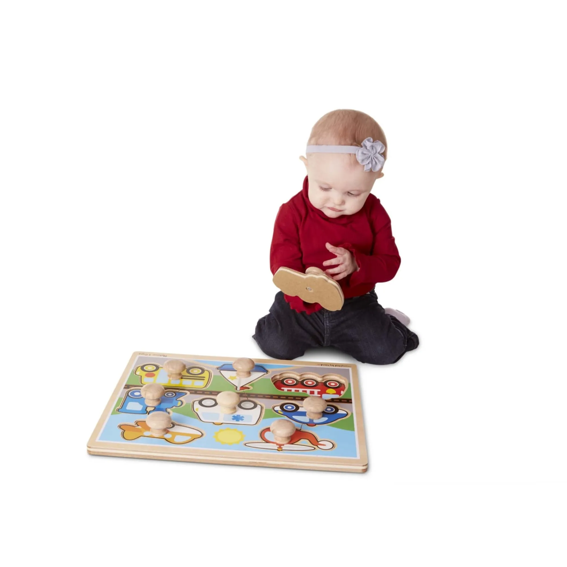 Eight big pieces with oversize knobs make this the perfect first puzzle! The bright, cheerful artwork features a collection of favorite vehicles in the air, land, and sea. Each one has its own illustrated well in the sturdy wooden puzzle board, encouraging young children to match the pictures, maneuver the pieces, and build important fine-motor and cognitive skills through play.