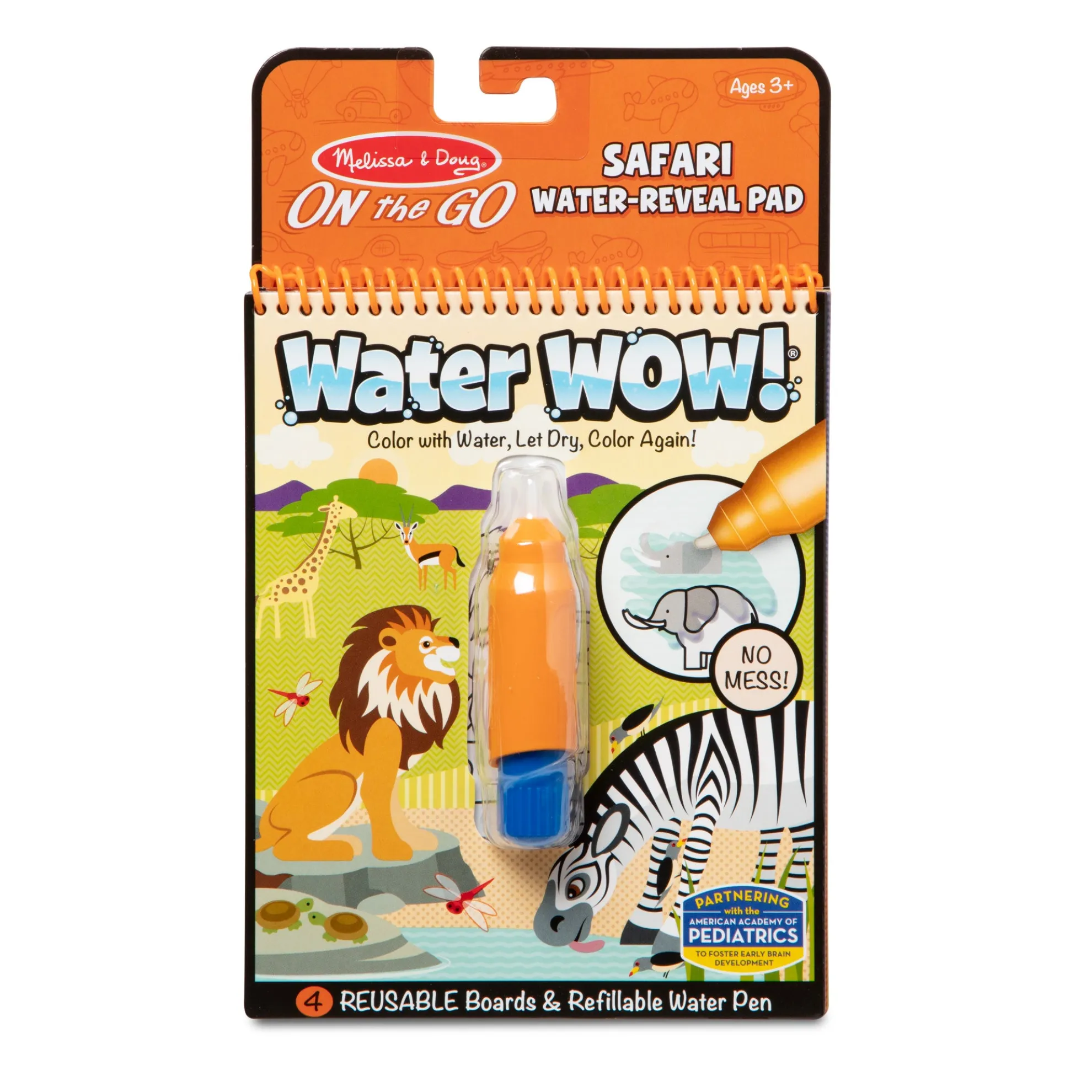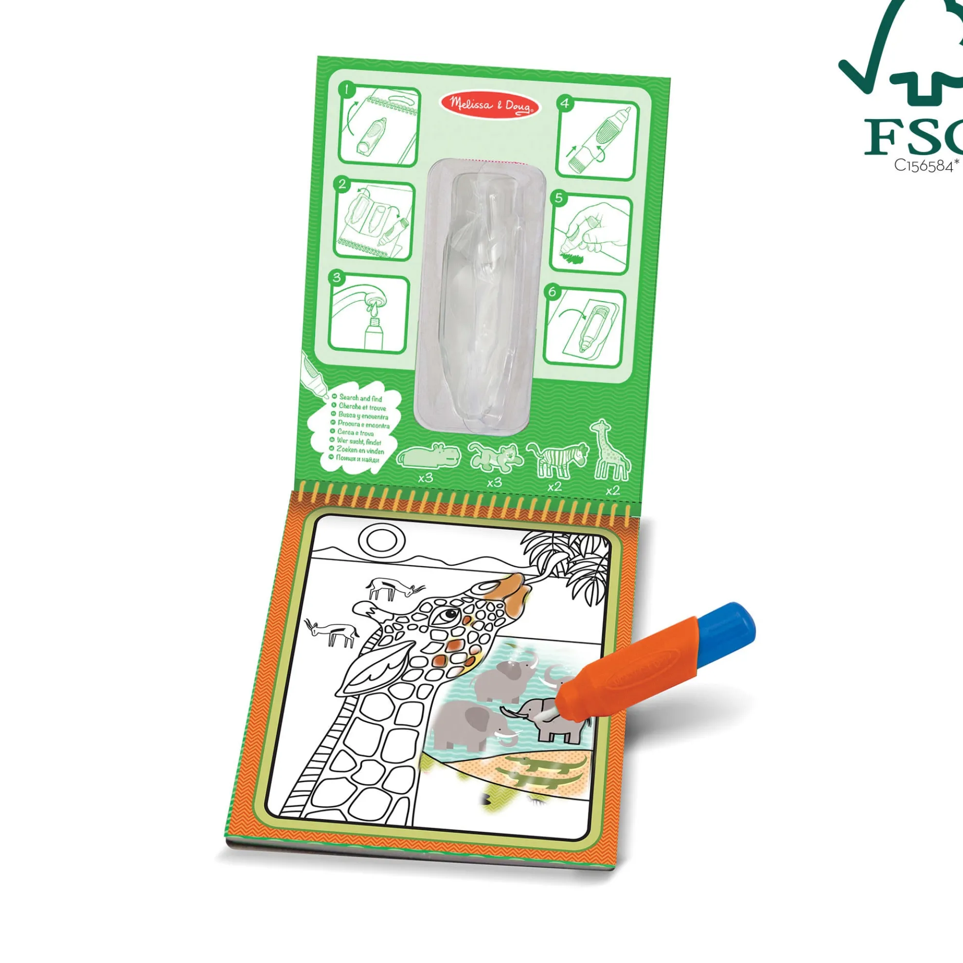 No-mess painting for kids! This exciting paint-with-water coloring book includes four reusable pages and a refillable water pen. Simply use the pen to color in each scene–details and vibrant color appear with every stroke! Then let the page dry to erase the pictures and fill it in again and again. This safari-themed book includes four scenes to color, and a search-and-find activity for each scene. The chunky-sized water pen is easy for kids to hold and stores neatly right in the front cover, so Water WOW! books make ideal travel activity books and travel toys for kids. This product is certified by the Forest Stewardship Council. FSC certification ensures that products come from responsibly managed forests that provide environmental, social, and economic benefits, and that forests are protected for future generations. Please note that FSC certification applies to new inventory only (FSC C156584)