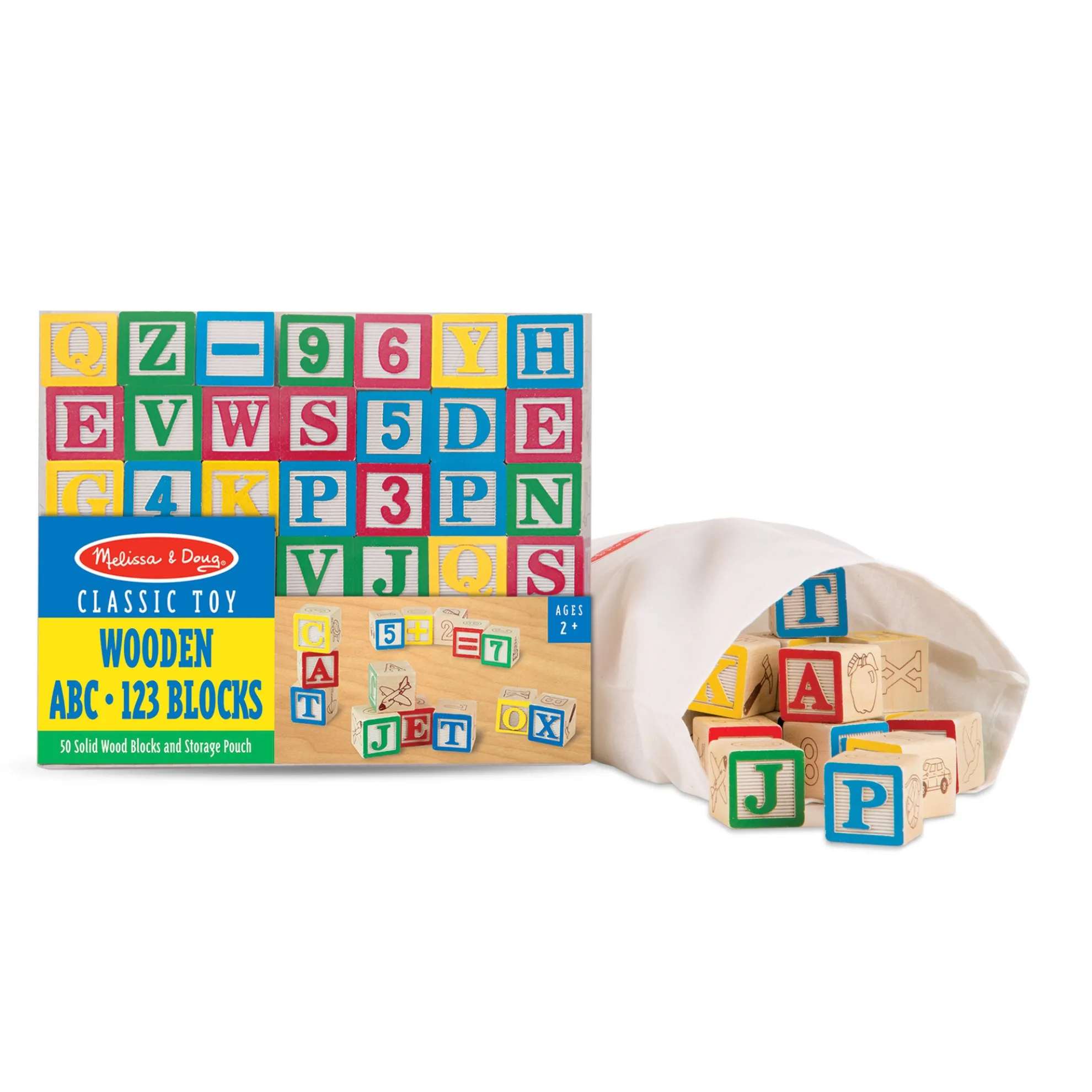 Hours of timeless block play await your toddler! This wonderful set of 50 traditionally styled one-inch alphabet blocks features charming hand-painted artwork. Solid wood blocks with a colorful collection of pictures, letters and numbers encourage matching, stacking, sequencing and sorting. A tremendous value that will last for years! Conveniently stores in an included pouch.