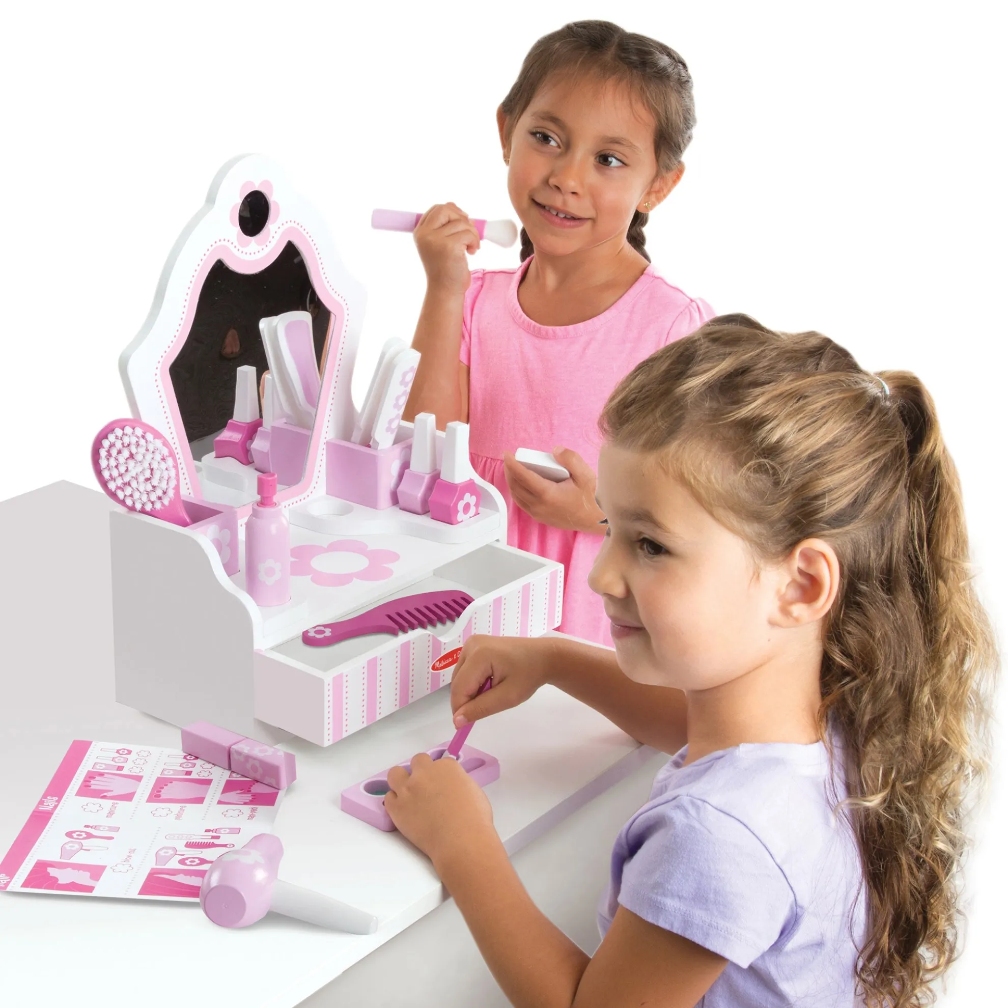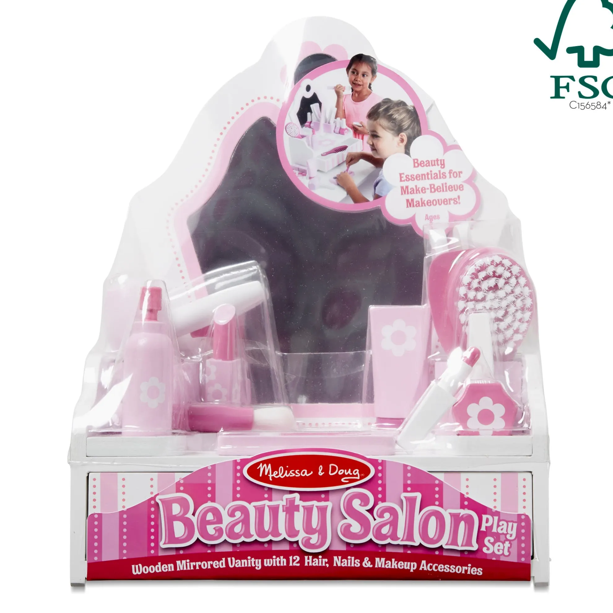Add glamour and style to playtime with these wooden beauty essentials for make-believe makeovers! The 18-piece set includes a sturdy white and pink vanity with mirror and storage drawer. The wooden pieces include a hair dryer, hair spray, hair straightener, flip-top lotion bottle, lipstick, two nail polish bottles, blush, makeup brush, eye shadow and applicator, comb, and brush. A reusable spa services card lets kids three and older get the full salon experience by customizing makeovers for themselves, friends, stuffed animals, and dolls! This product is certified by the Forest Stewardship Council. FSC certification ensures that products come from responsibly managed forests that provide environmental, social, and economic benefits, and that forests are protected for future generations. Please note that FSC certification applies to new inventory only (FSC C156584).