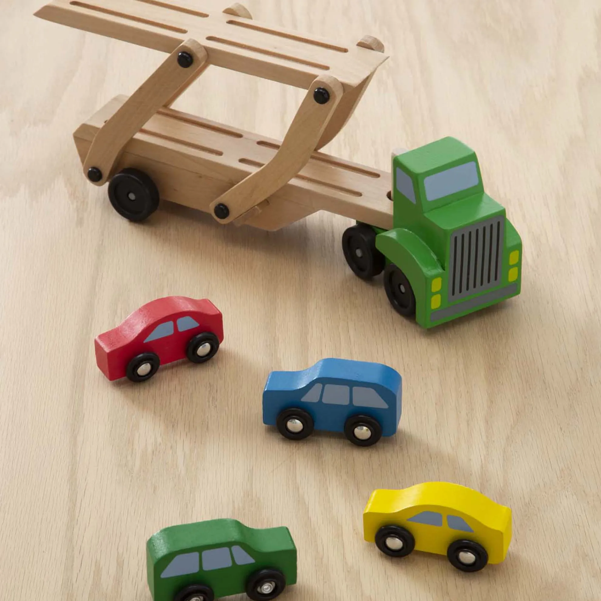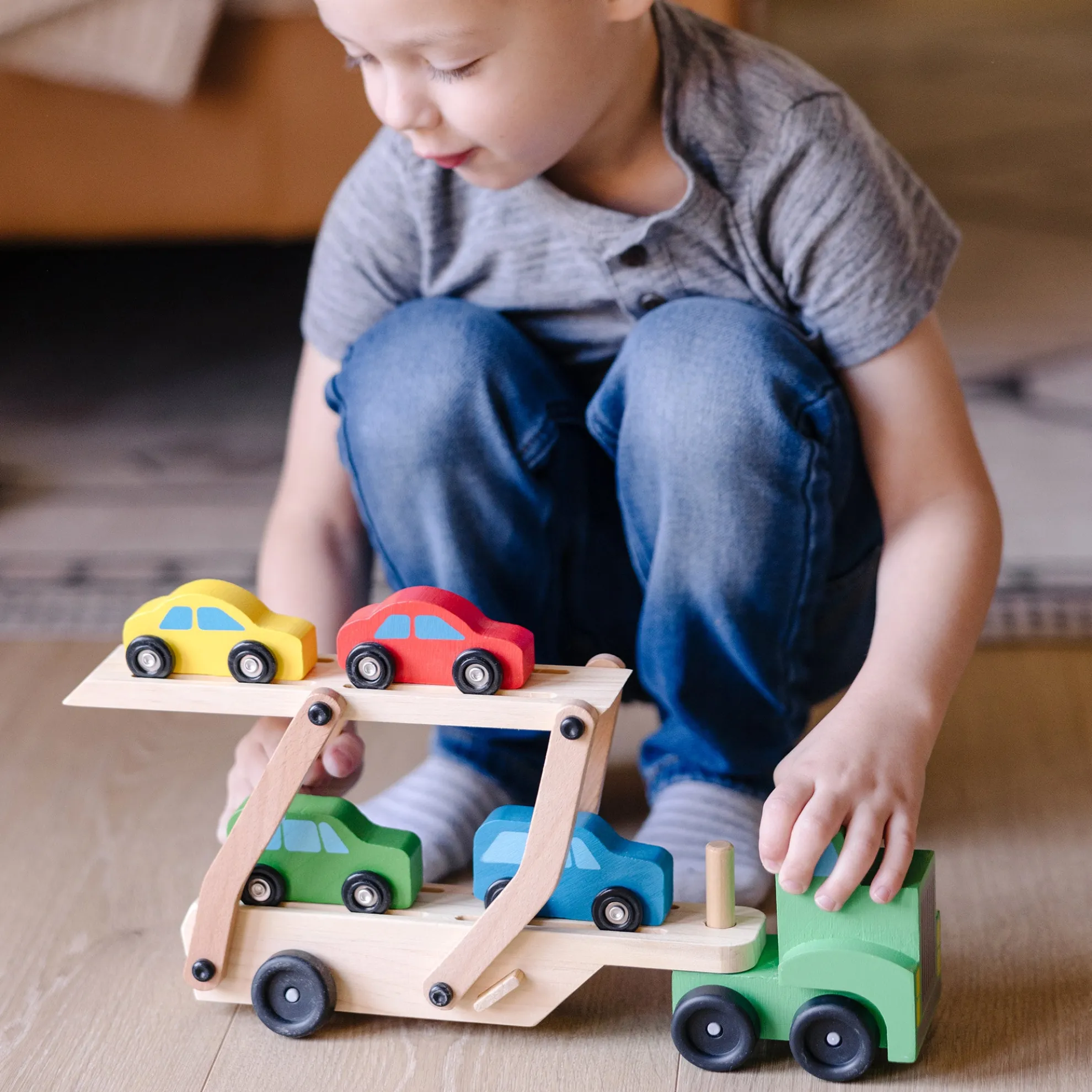 This wooden Car Carrier has a big job to do: delivering four colorful cars to their new homes! The Melissa & Doug wooden truck features an easy-fold ramp with an upper and lower level. Kids can extend the lower level, and drive their cars up onto the ramp, then lift it up to hold two of the cars when it’s time to roll out. Kids can sort and sequence the wooden cars by color to inspire playful counting, and sequencing activities. Car- and truck-loving kids will love discovering endless play possibilities as they roll this wooden truck toy all around the house and to the ends of their imaginations. The tough vehicles have sturdy wooden chassis and smooth-rolling wheels, so they’ll stand up to countless deliveries and road trips. And maneuvering the ramp is easy to do, great for fine motor skills and hand-eye coordination, and so much fun! Designed to engage playful preschoolers and young children, and constructed with care to withstand their harshest treatment, this play set is made of durable, child-safe materials and is safety-tested to our most rigorous standards. It makes a great gift for preschoolers and kids ages three and older for hands-on, screen-free play.