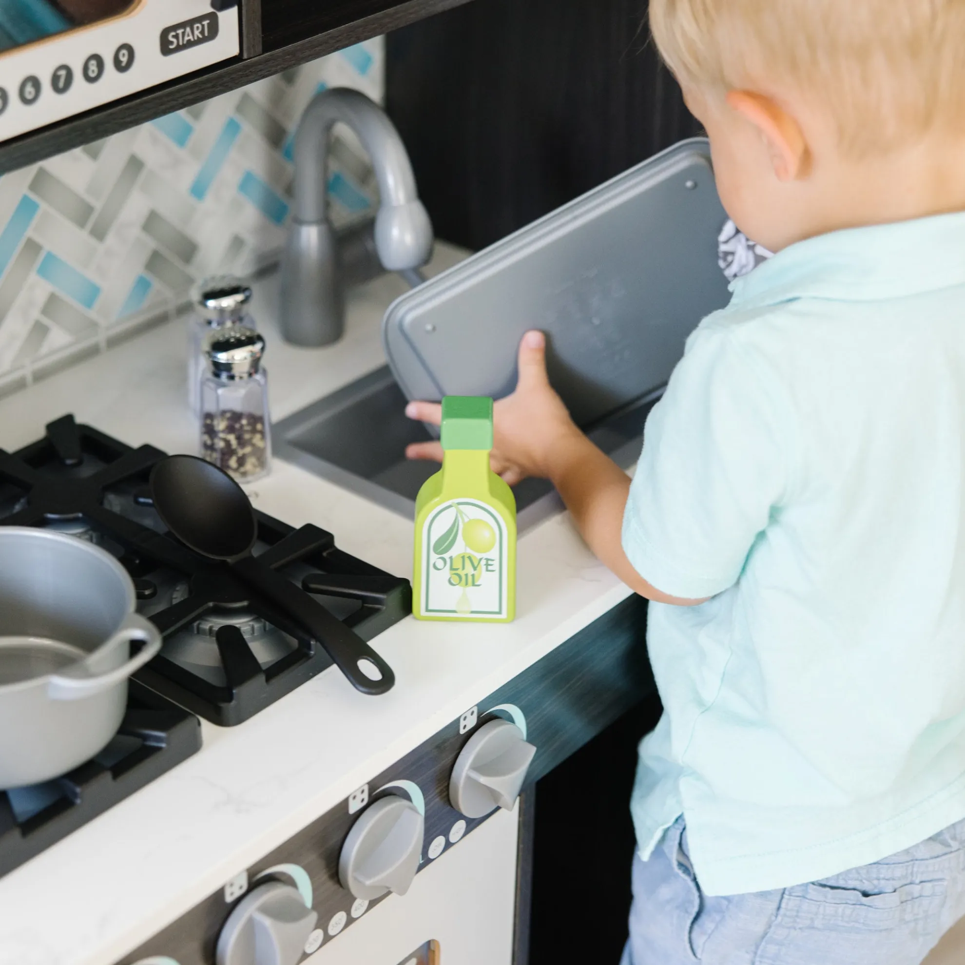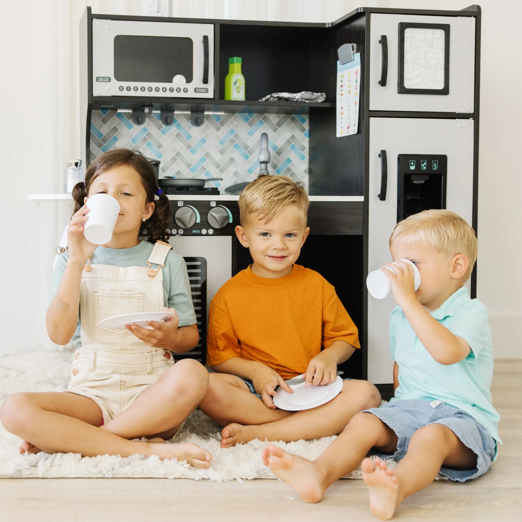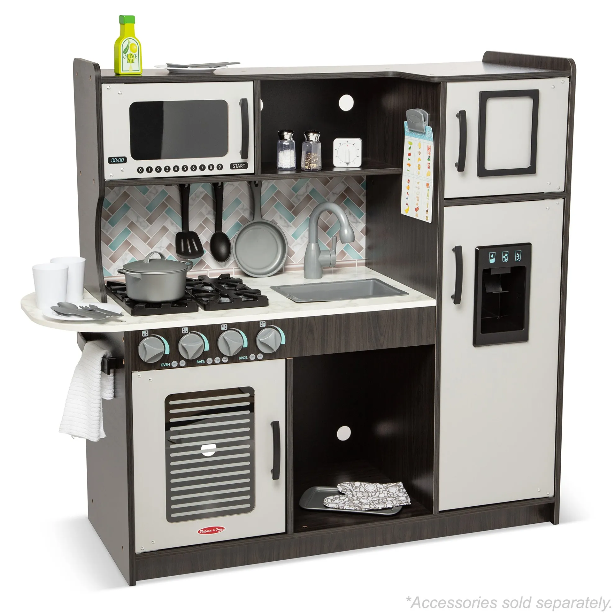 - Easy to assemble charcoal-colored wooden modern play kitchen–roomy enough for multiple kids to play at once