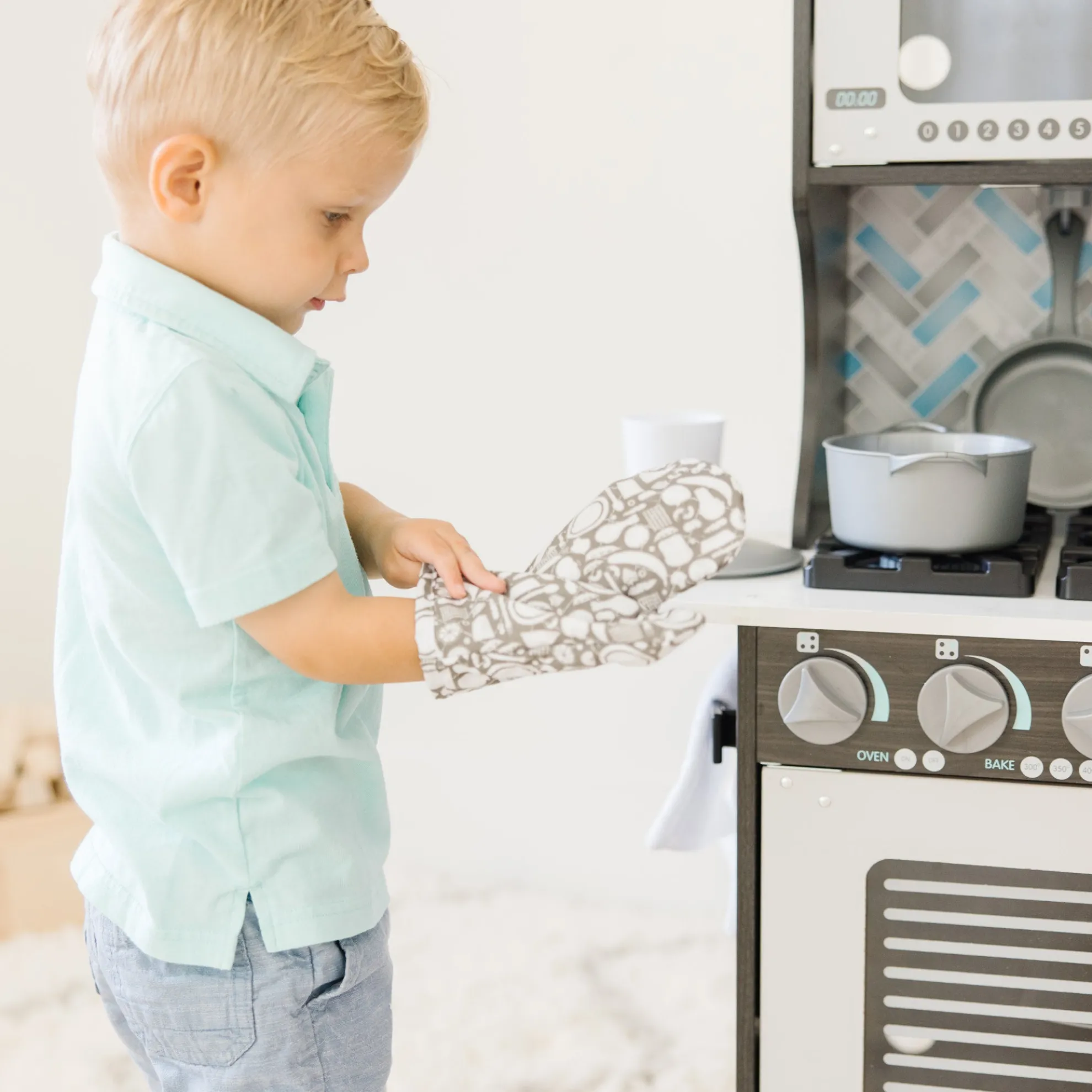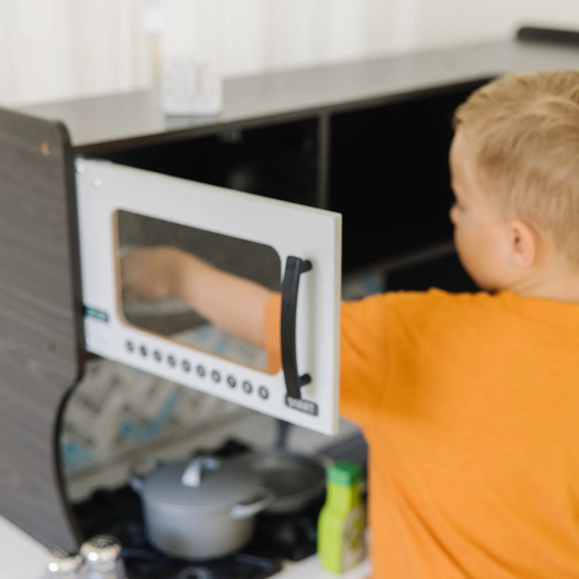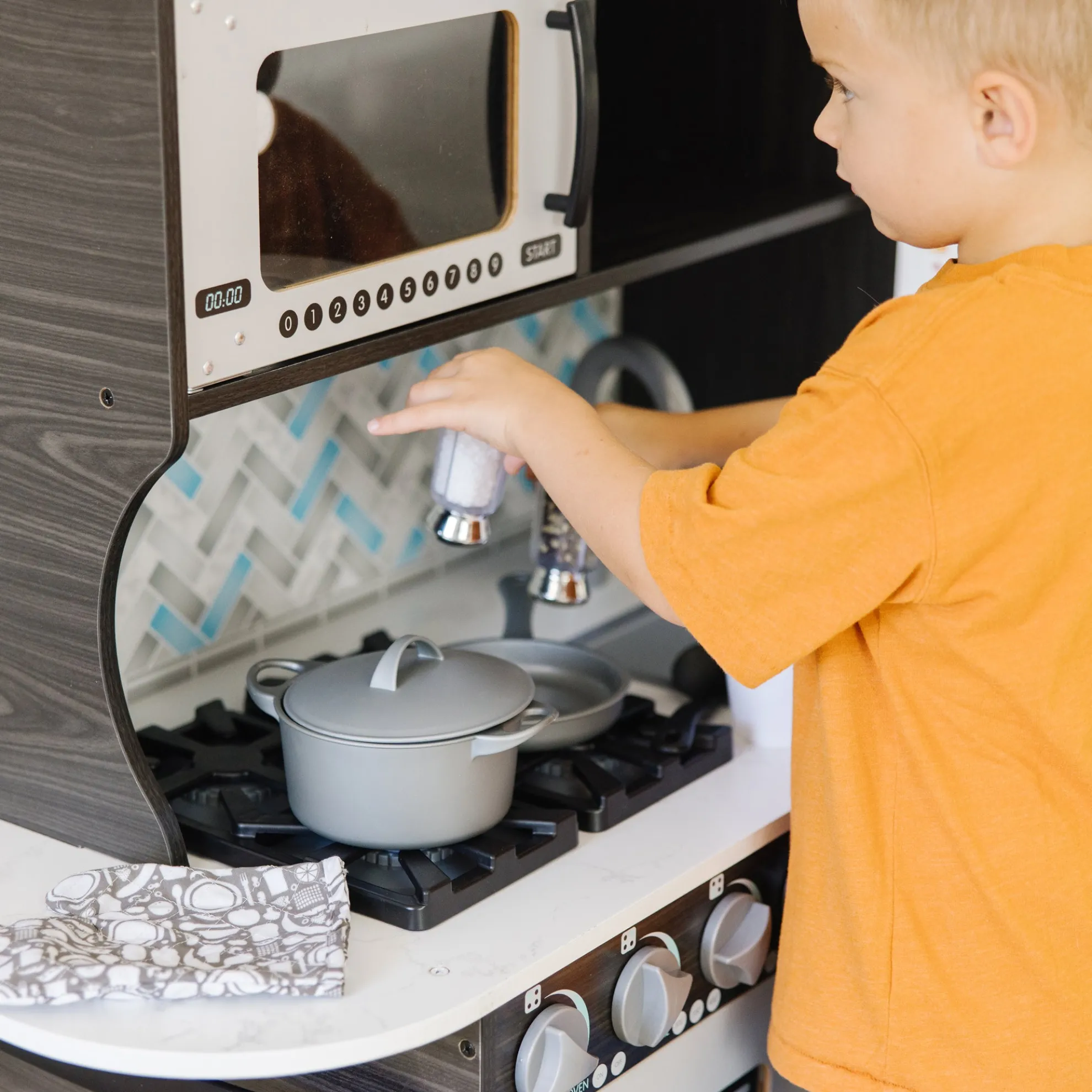 - Easy to assemble charcoal-colored wooden modern play kitchen–roomy enough for multiple kids to play at once