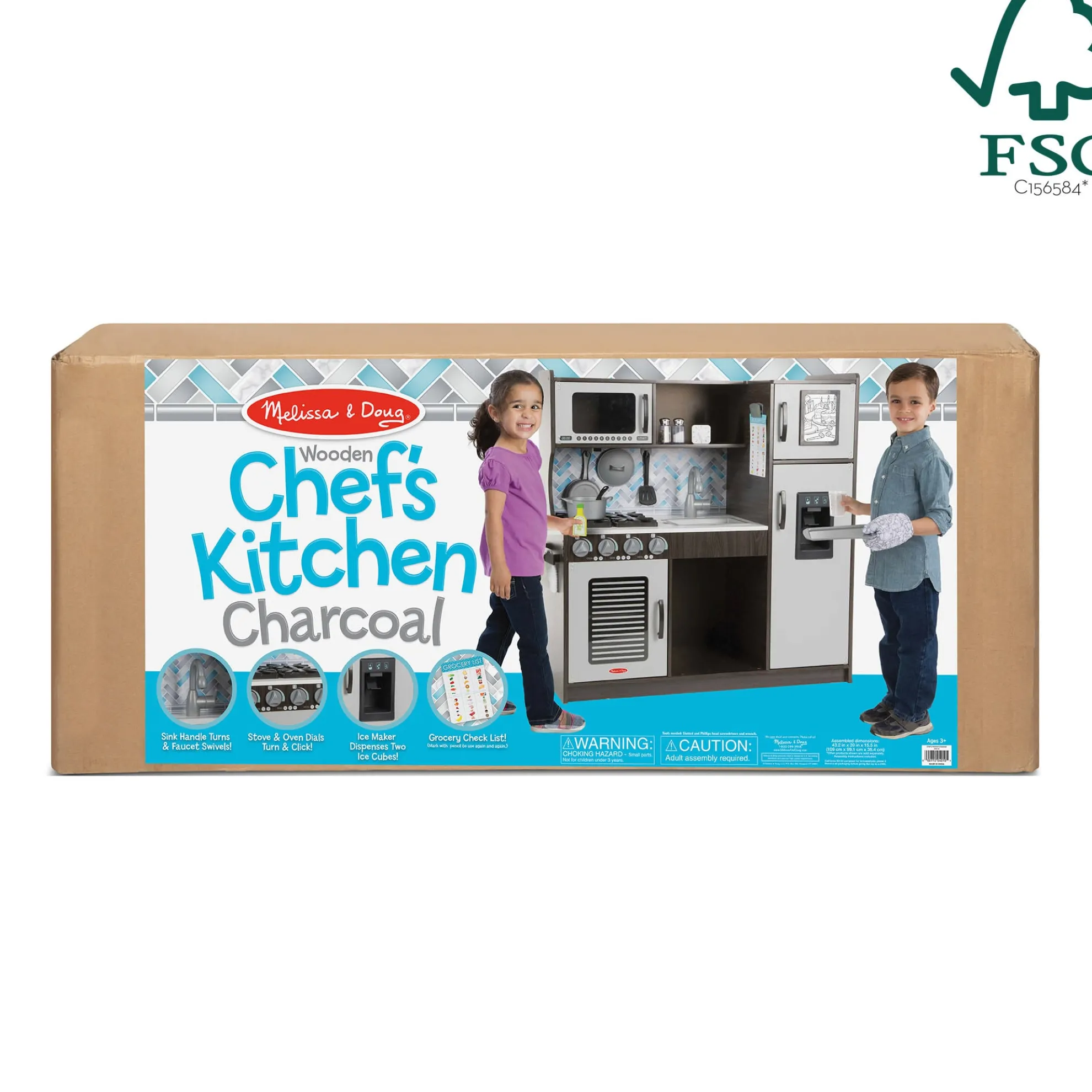 Budding young chefs can hone their craft in this beautifully designed, charcoal-colored modern play kitchen! The easy to assemble chef’s kitchen includes a refrigerator/freezer with innovative working ice maker that dispenses two included “ice cubes,” an oven and stovetop with dials that turn, microwave with turning plate, sink with moving faucet and handle, grocery check list, movable hooks, and ample shelving and storage for easy cleanup. Detailed, illustrated instructions make this kitchen simple to put together. Assembled, it stands approximately 3.5 feet (1 meter) long and more than three feet (0.9 meters) high, roomy enough for multiple kids to play at once. Sturdy, top-quality wooden construction means it will stand up to years of creative make-believe meal-making! This product is certified by the Forest Stewardship Council. FSC certification ensures that products come from responsibly managed forests that provide environmental, social, and economic benefits, and that forests are protected for future generations. Please note that FSC certification applies to new inventory only (FSC C156584)