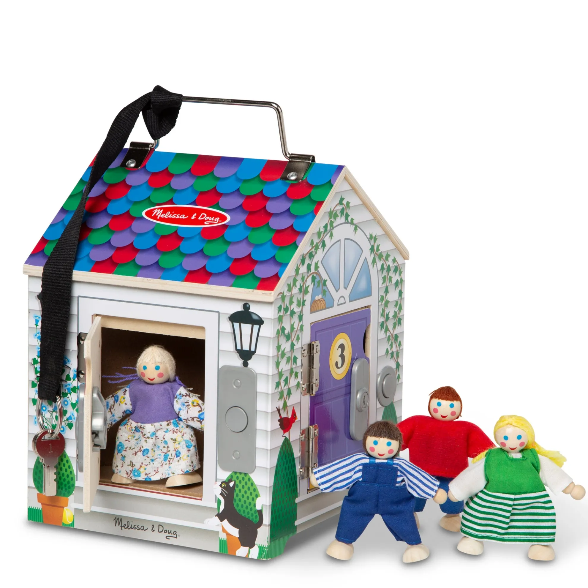 Ding Dong! Fun is at the door of this soundly-built wooden doorbell house. It features four different electronic doorbell sounds, four unique locks with matching keys, and four pose-able play people. So many fun features in this little charming play cottage! Parents will like the fact that the keys are attached to the little house so that they won’t get lost, and the sturdy attached handle allows this exciting house party to go wherever children go! It makes a really wonderful unique gift for kids ages three and older.