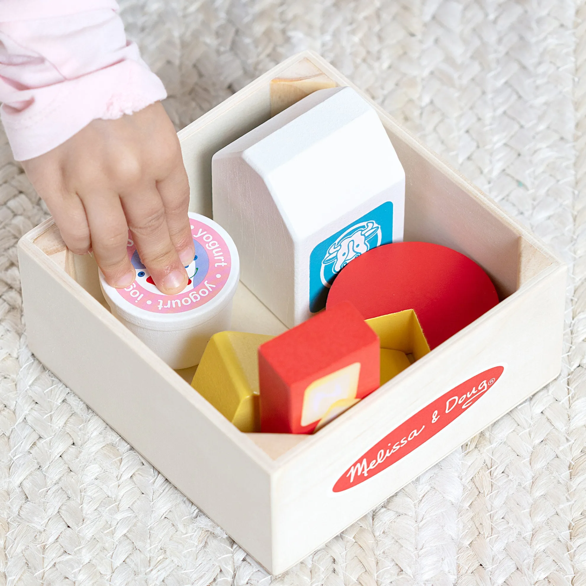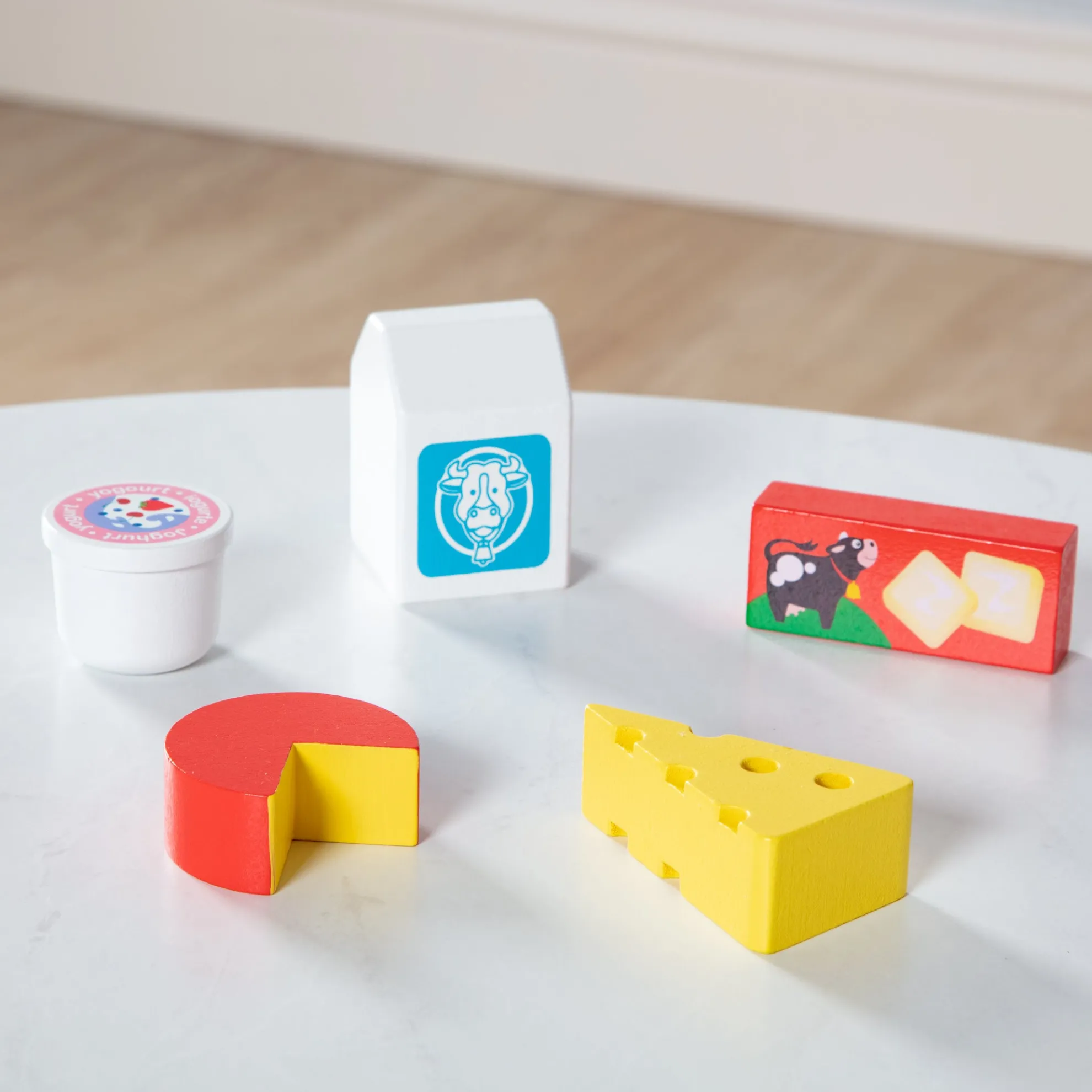 - Wooden play food set featuring items from the dairy food group
