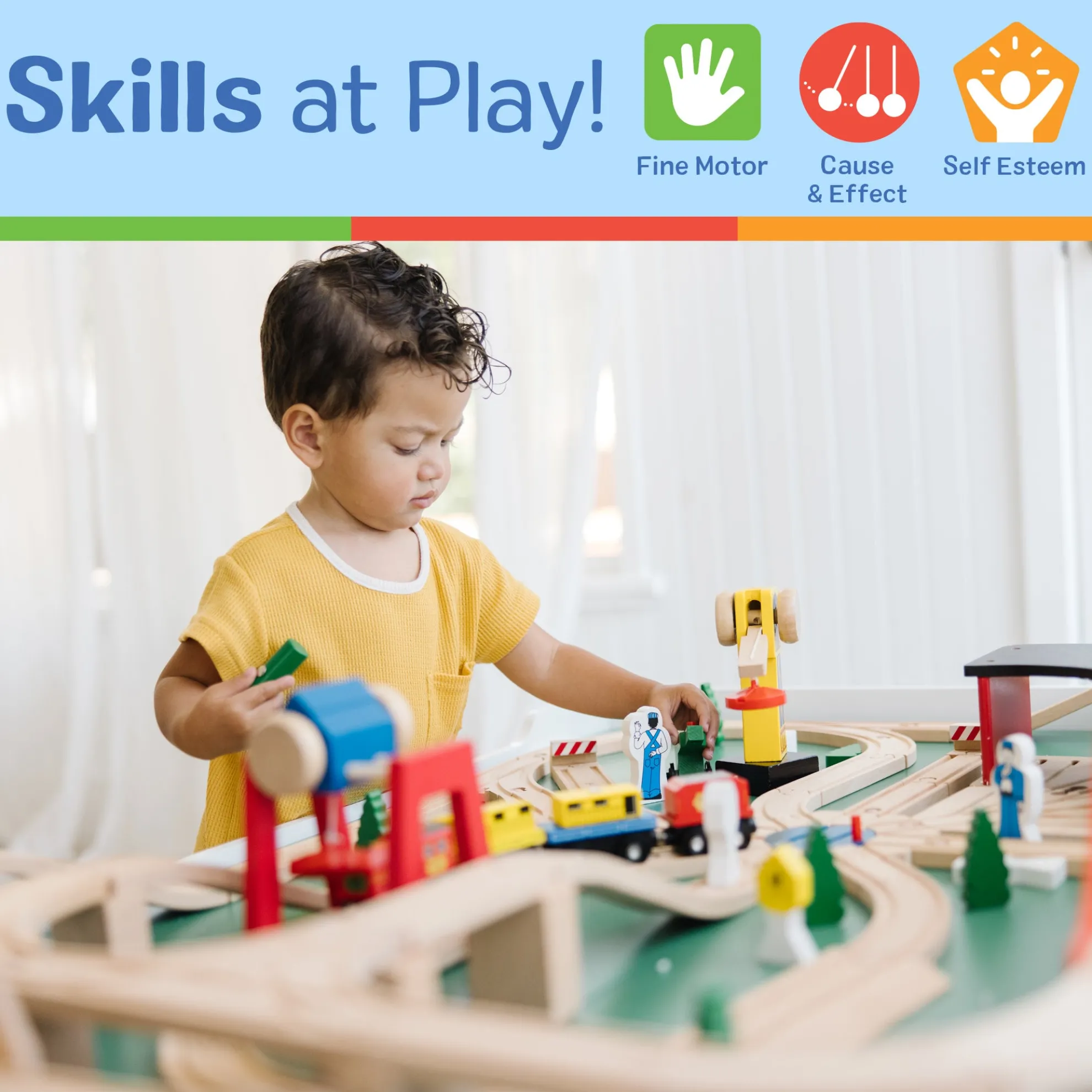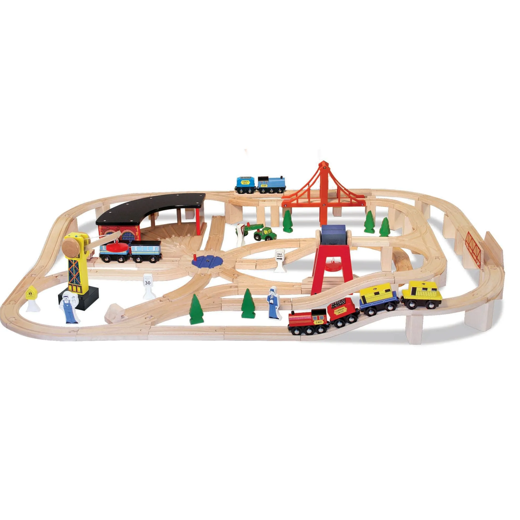 This amazing set includes everything needed for railway fun: a spacious roundhouse engine shed, dozens of track pieces in curves and straights, trees, workers and even traffic signs; multi-piece trains; magnetic-tipped cranes; switches and a T-junction for changing course; suspension bridge, trestle bridge and roundtable, too! A tremendous value! Mix and match it with other train sets–it’s compatible with all popular wooden railway systems.