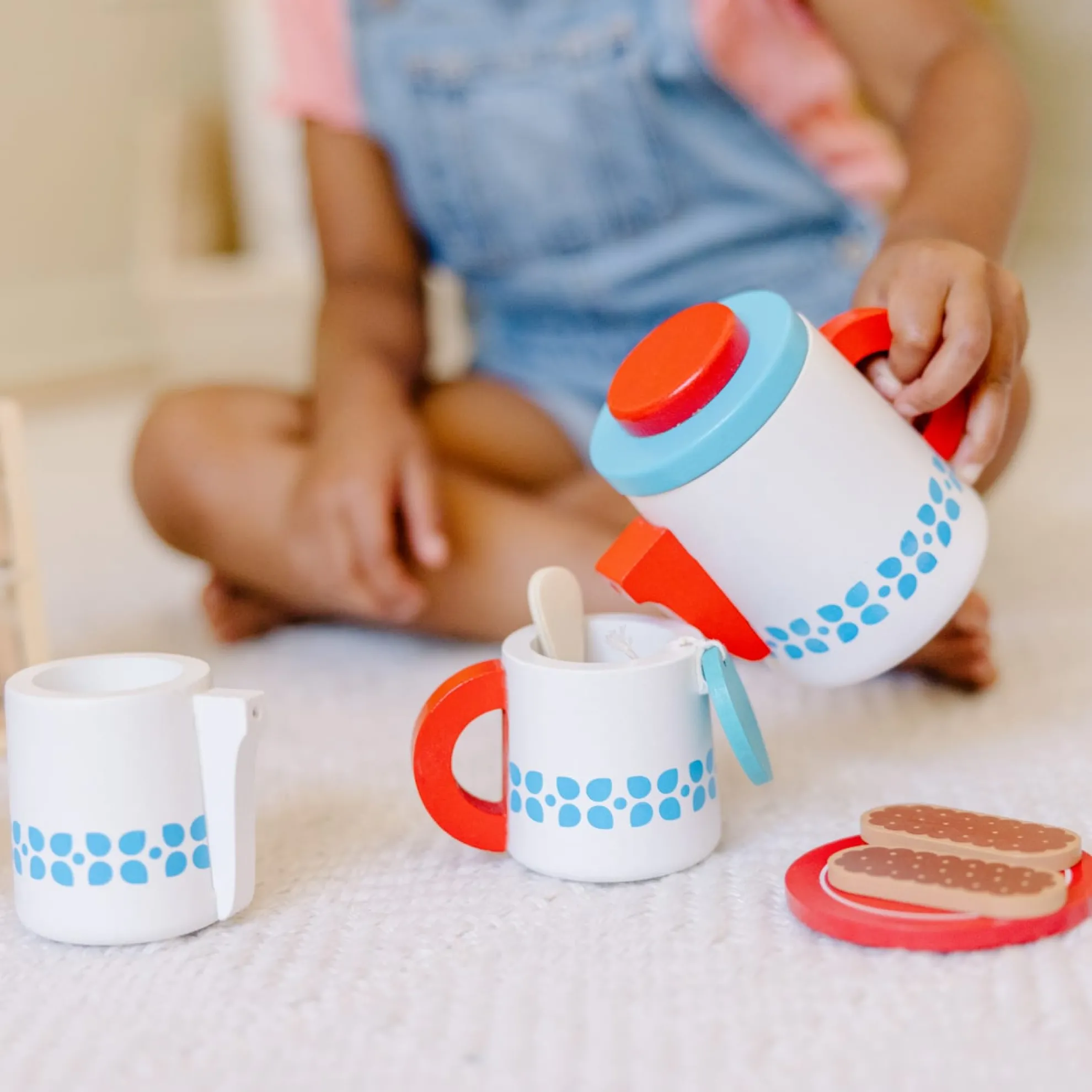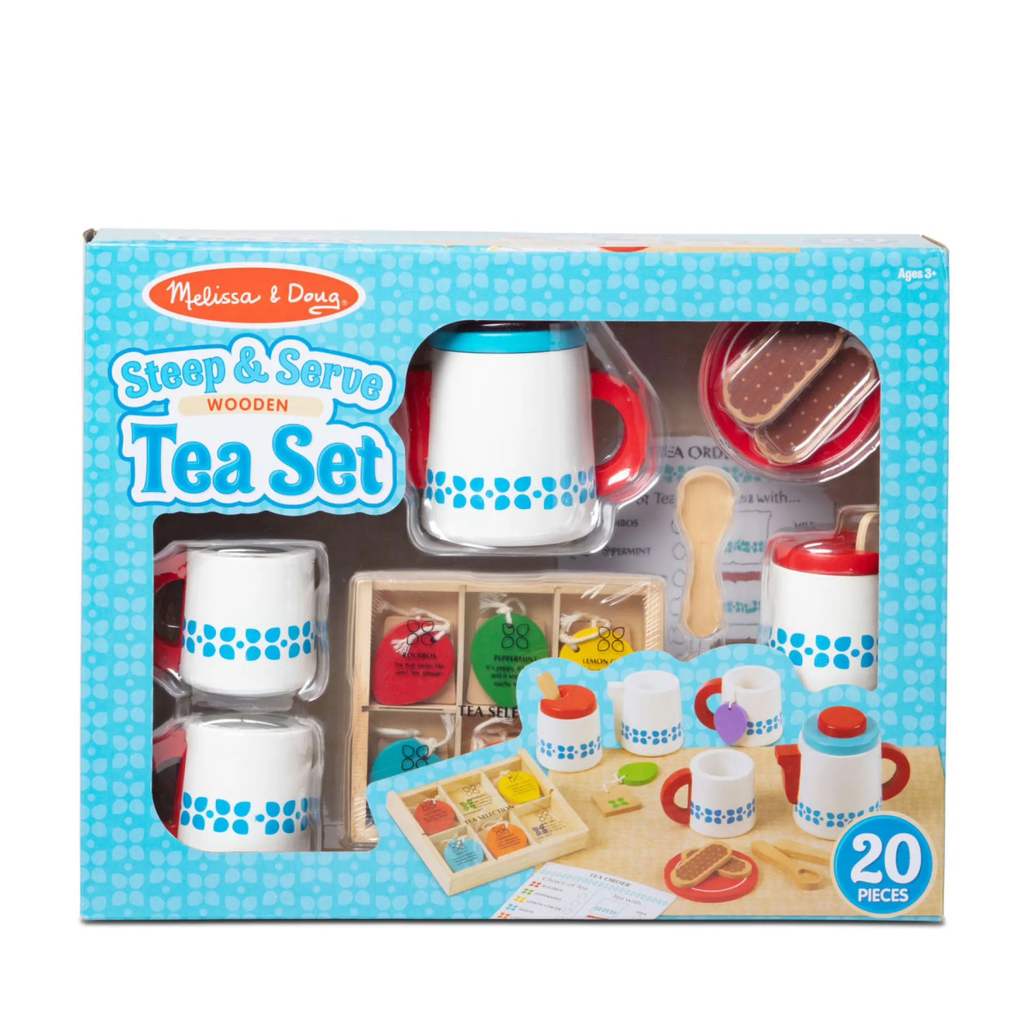 - Includes teapot with lid, 2 cups, 2 spoons, sugar bowl, milk pitcher, 6 assorted teas in tea caddy, 2 cookies, dry-erase order card, placemat
