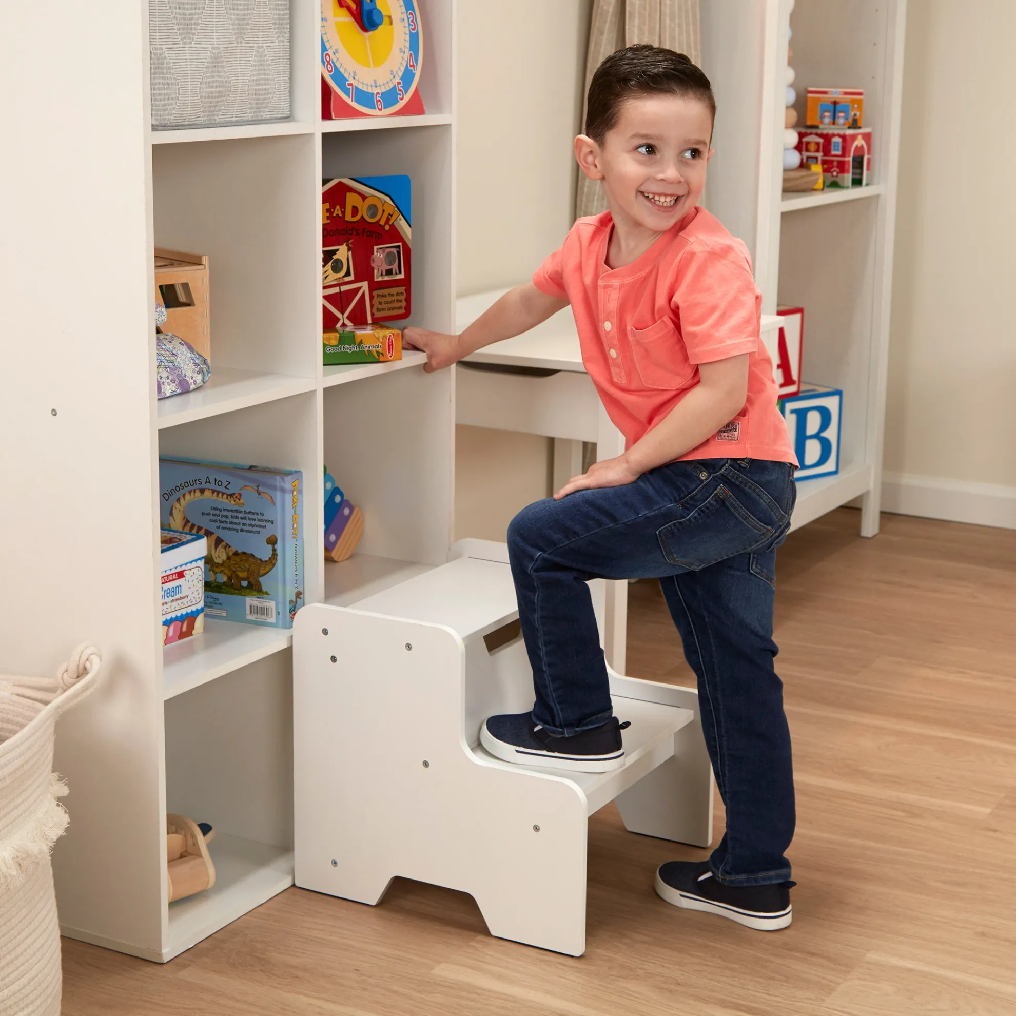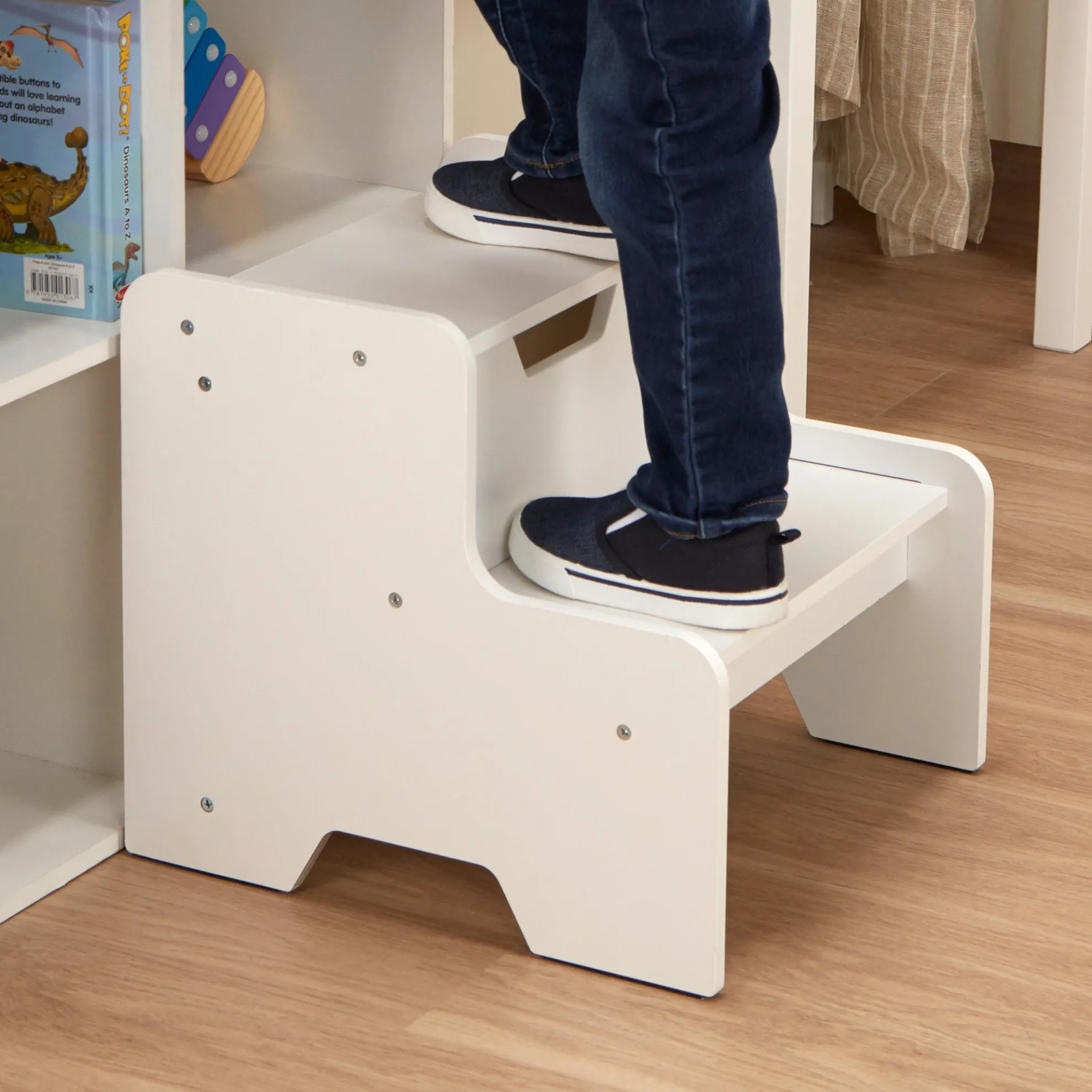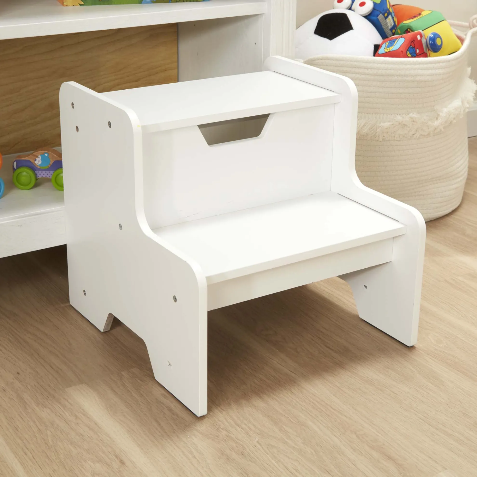 Give kids a leg up with this sturdy wooden two-step step stool! Available in natural, white, and espresso finish to fit with any home décor, this stool is great for helping kids up to 100 pounds reach books and toys in the playroom, climb into bed at night, brush their teeth and wash their hands at the bathroom sink, or help out in the kitchen at mealtimes! Easy to assemble with a Philips head screwdriver, not included.