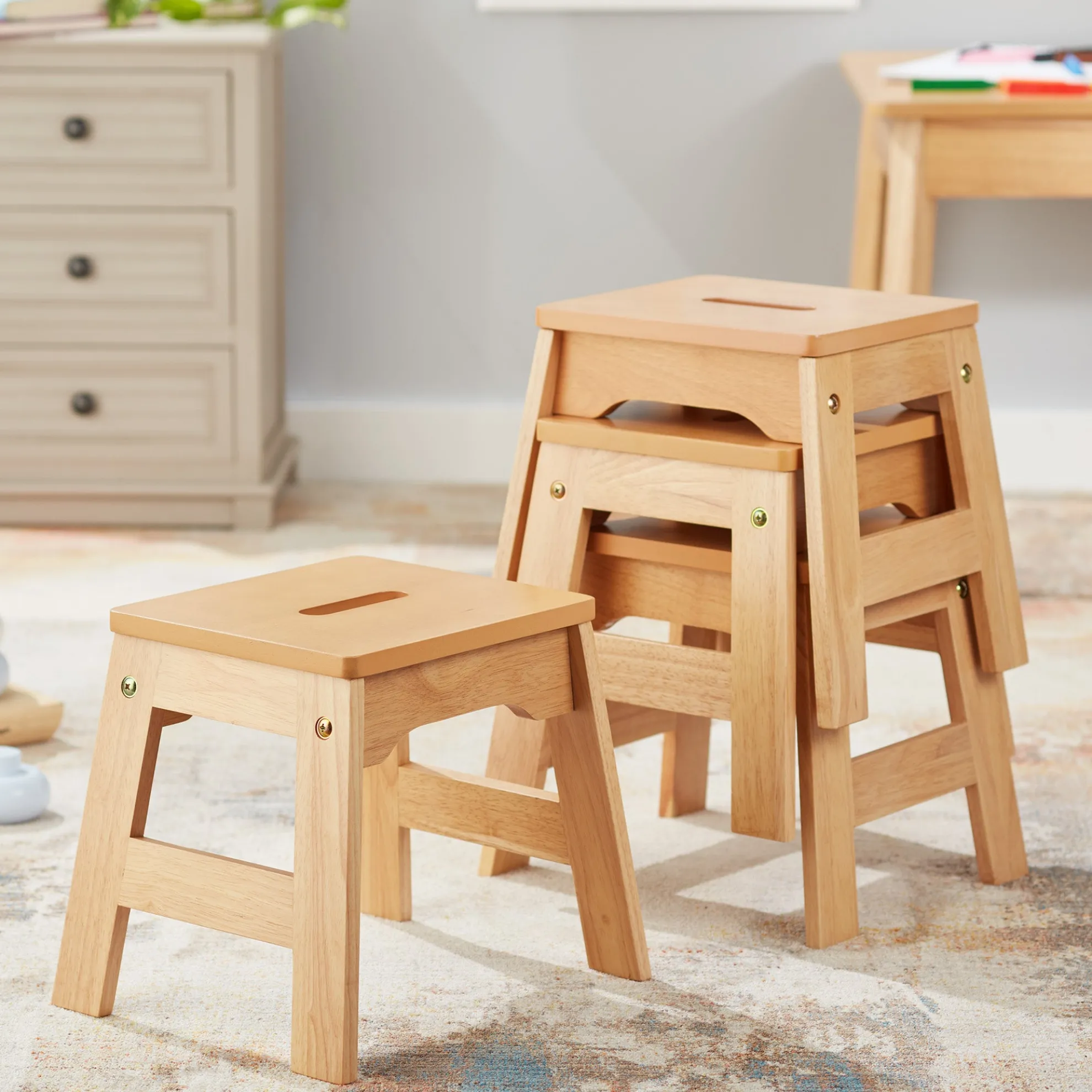 - Set of 4 sturdy wooden stools, sized for kids, but strong enough to hold most adults