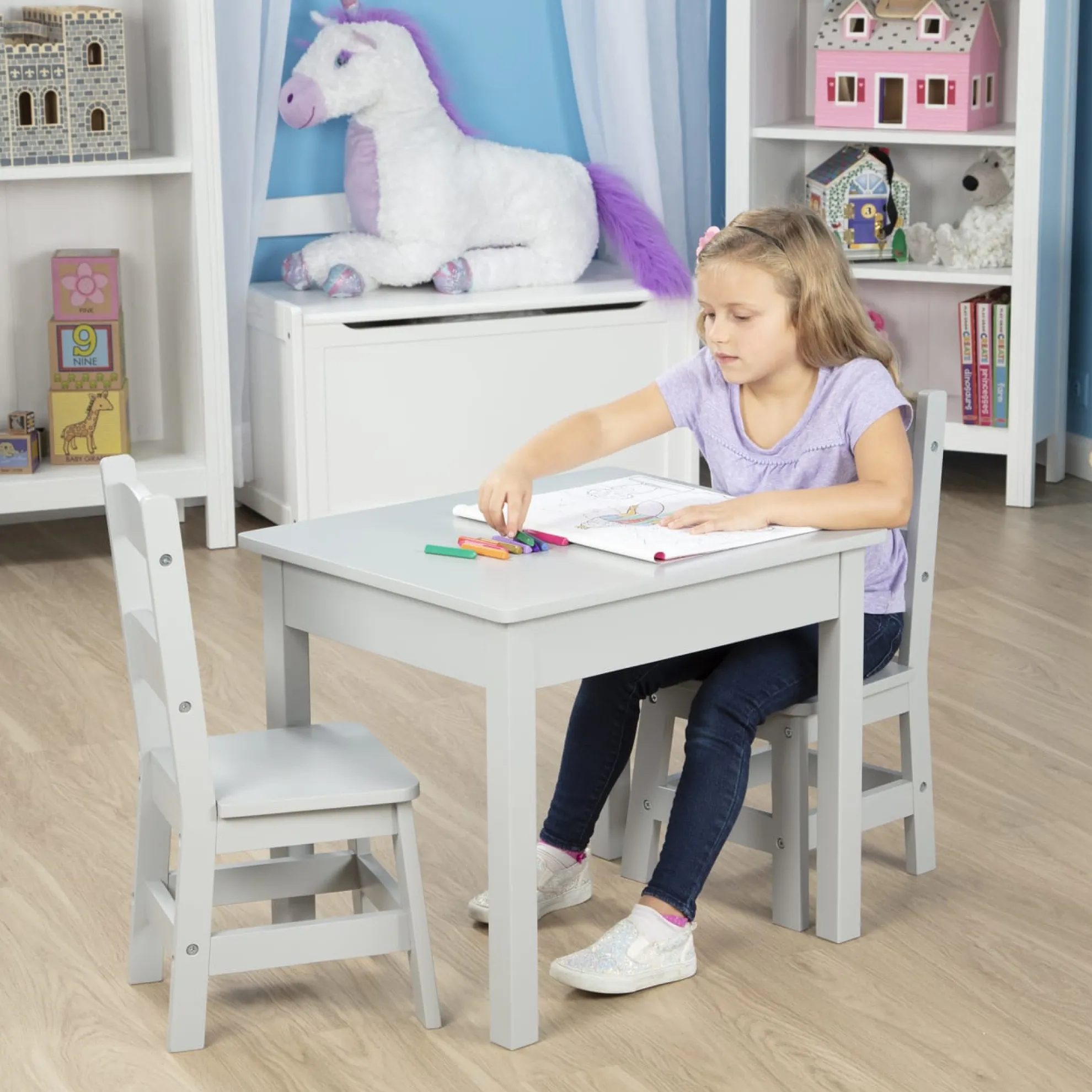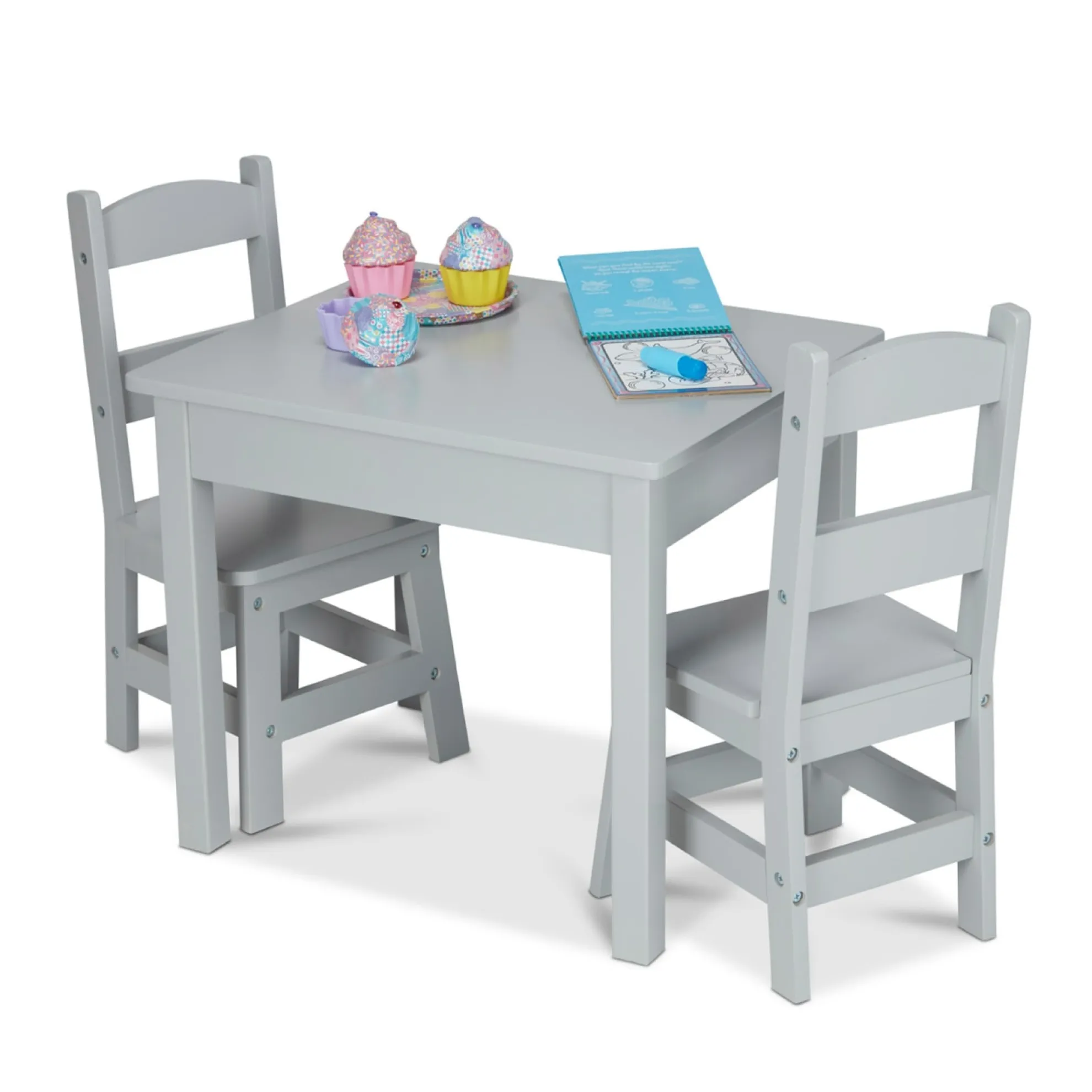 - Easy-to-assemble sturdy wooden table and 2 wooden chairs in gray, sized for kids