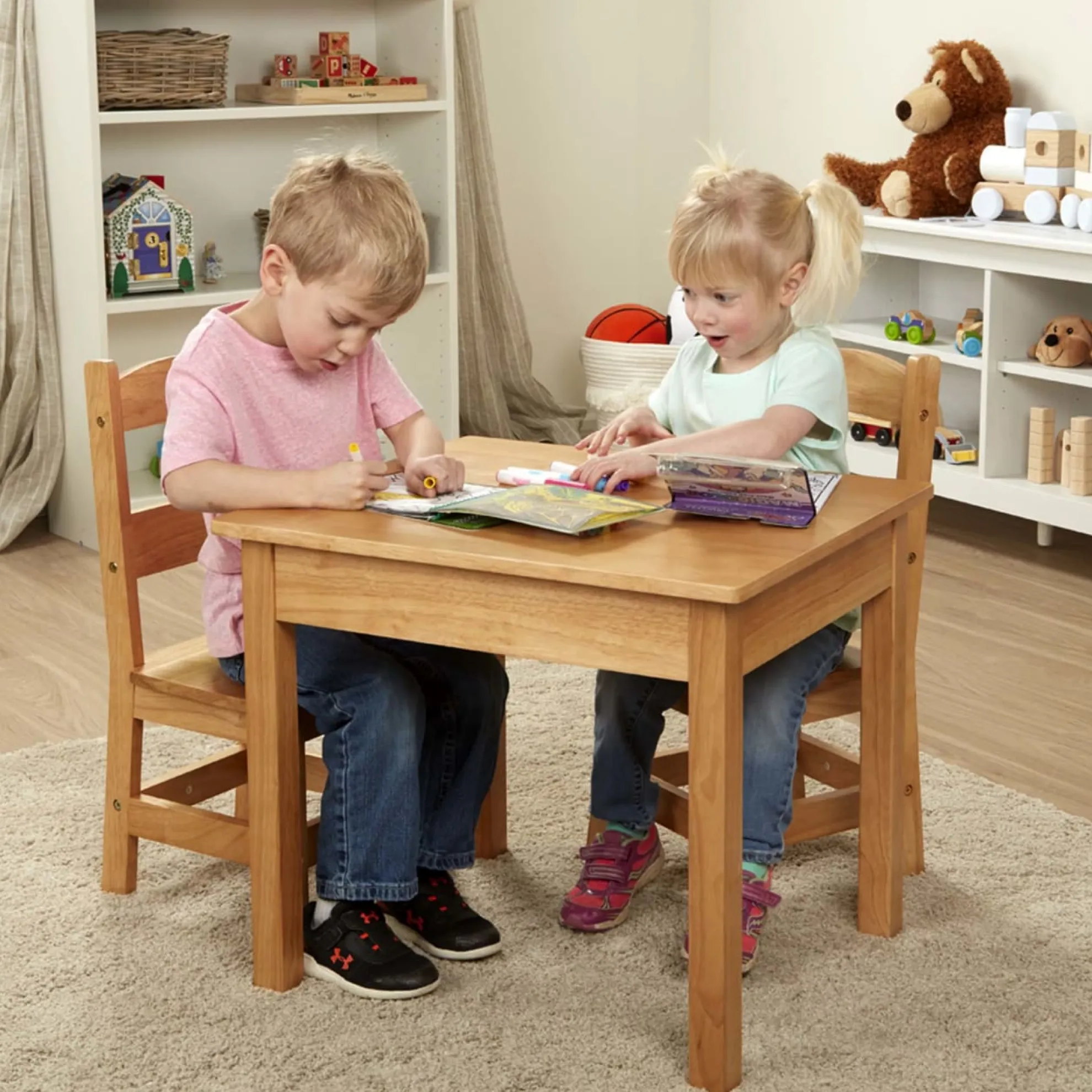 Pull one of the two durable chairs up to the child-size table–they’re sized just right for kids, but strong enough to hold grown-ups, too! This sturdy wood table-and-chairs set comes in natural, white, or espresso finish to fit with any home décor, and wipes clean to stay looking crisp and clean. The three wooden pieces are simple to construct with just a Phillips-head screwdriver, and incredibly sturdy once assembled. Top the table with a child’s favorite puzzles or use it for arts and crafts, tea parties, puzzle play, lunch and snacks, and so much more! Two chairs have an 11-in seat height. Assemble with a Phillips-head screwdriver, not included. Chairs maximum load 100 lbs.
