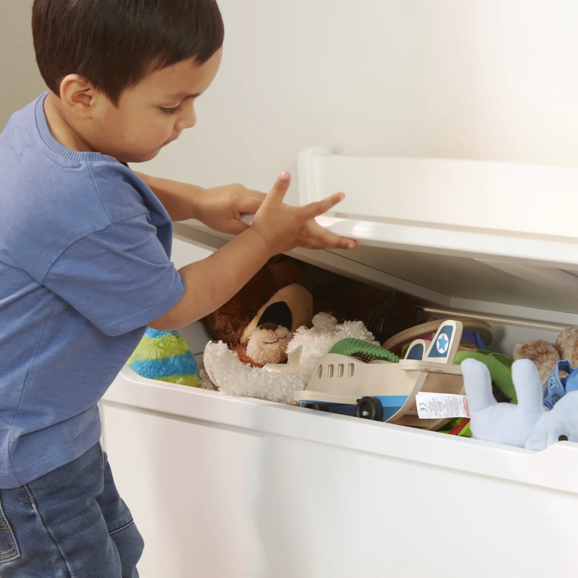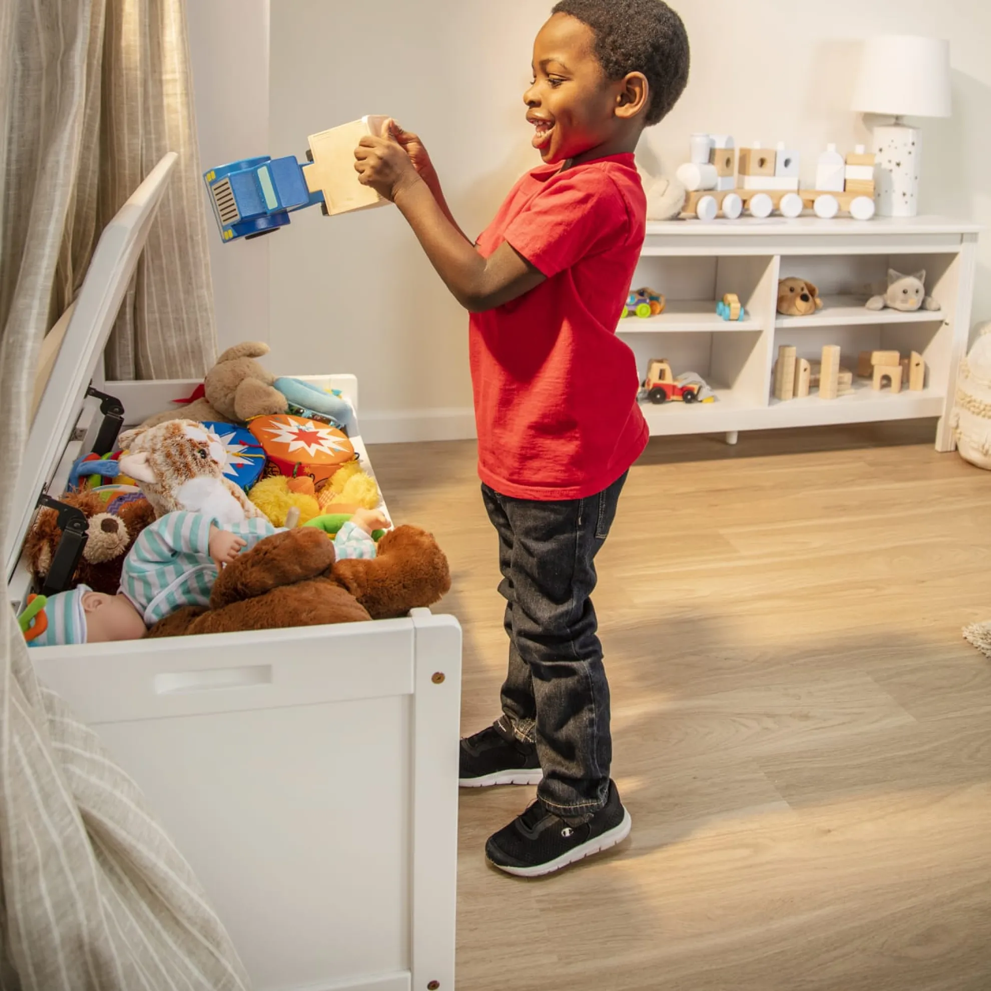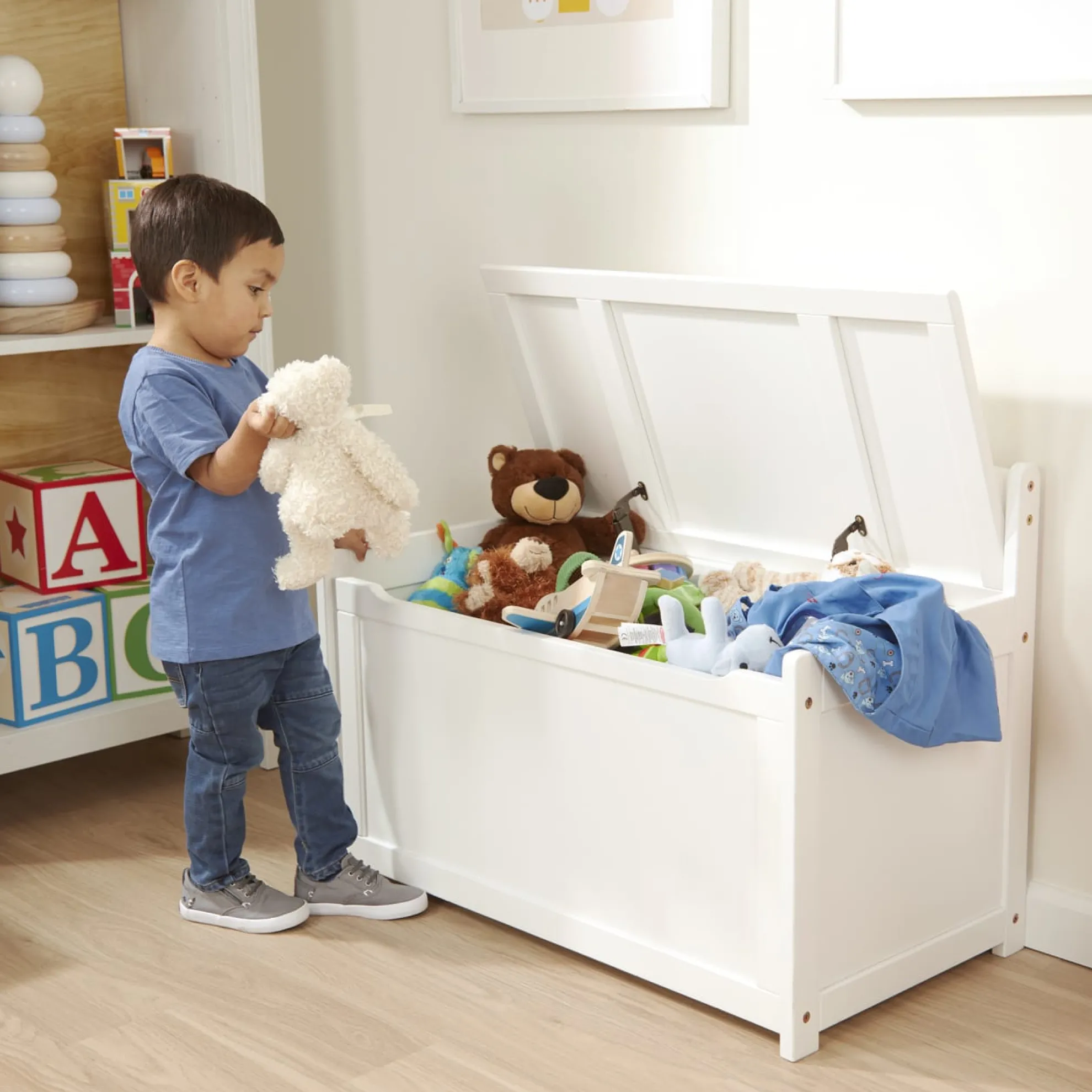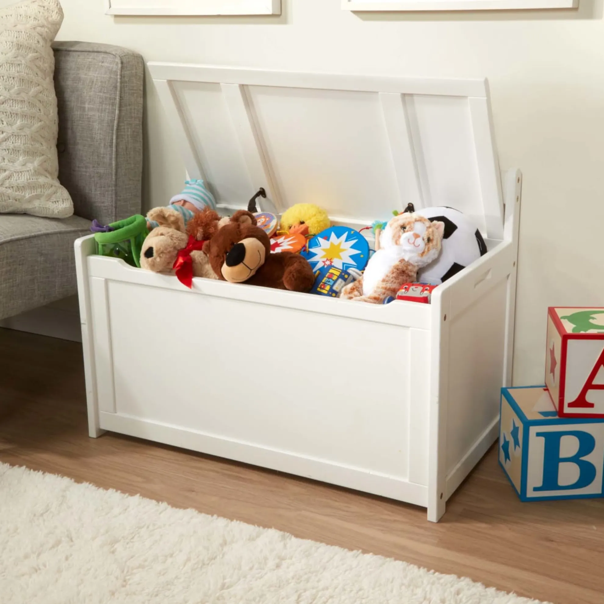 - Sturdy wooden toy chest with lid