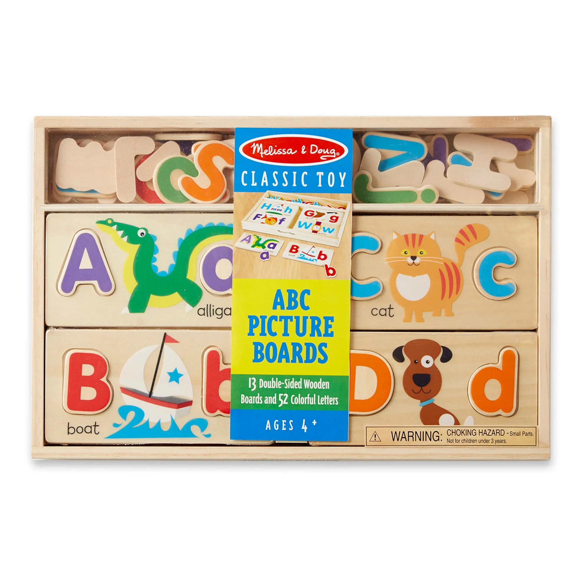- Spelling toy with 13 double-sided boards and 52 colorful letters