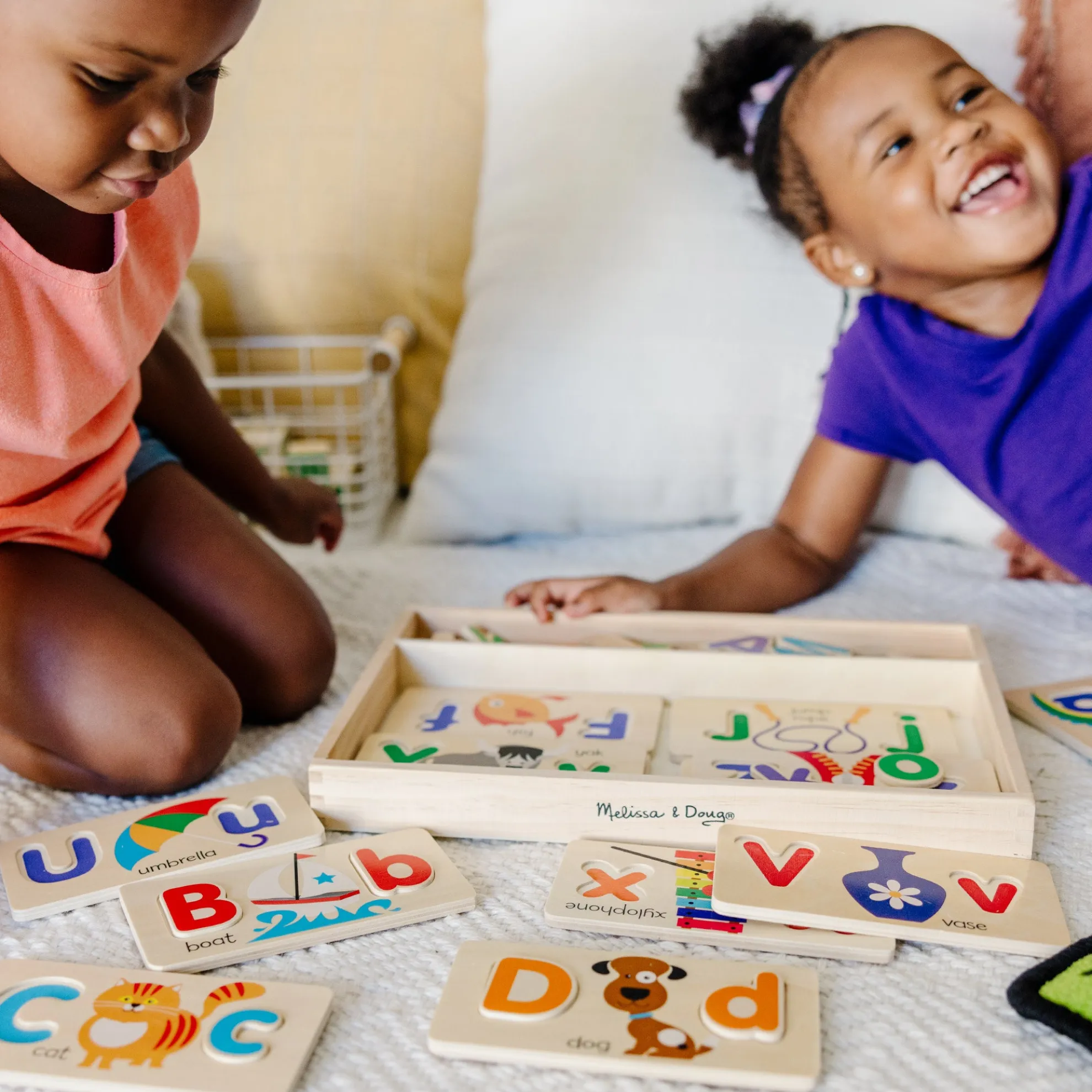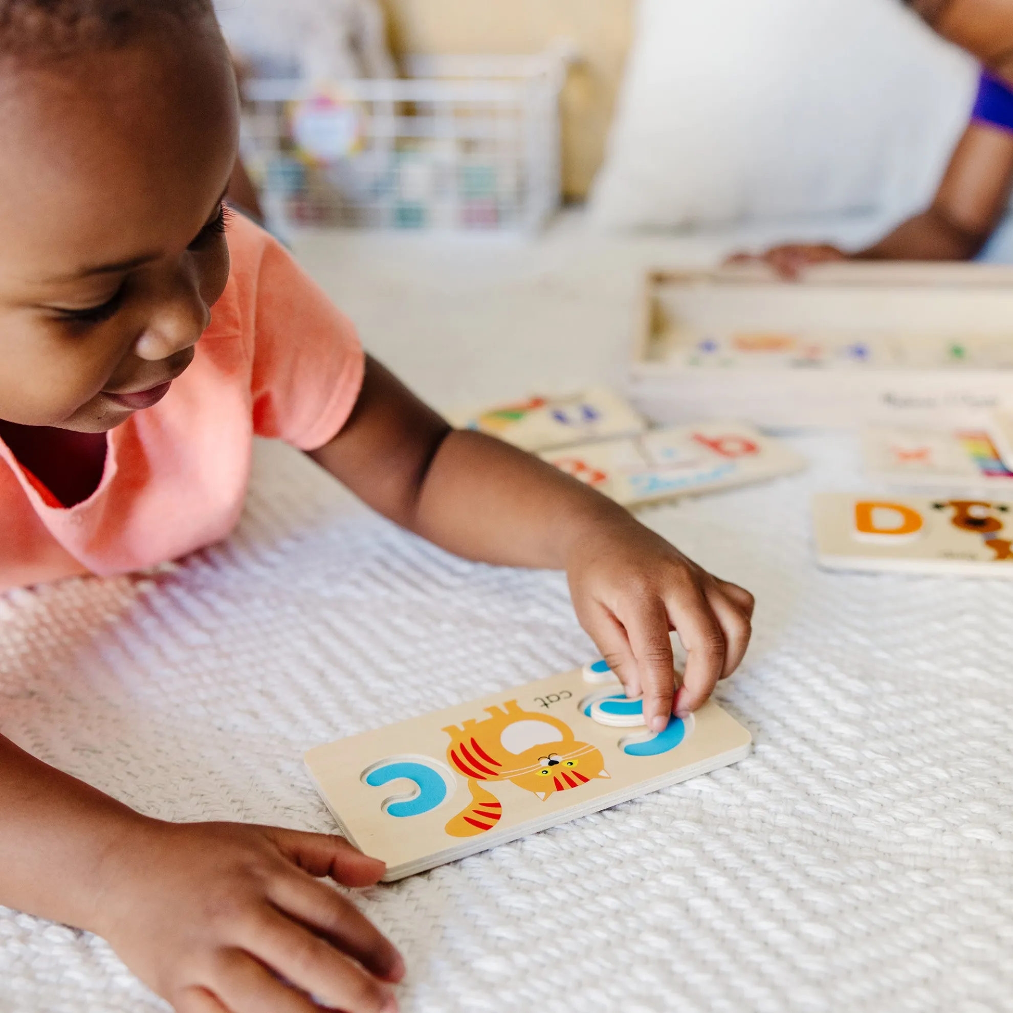 ABC, tell me what you see! These adorably illustrated boards are a great way to work on letter and word recognition; a child simply picks a board–the first letter of his or her name is always a good place to start–then fills in the uppercase and lowercase letters and identifies the picture. He or she can turn it over or take another board and do it all again. With so many letters (each letter in the alphabet in both uppercase and lowercase), children can find infinite ways to play!