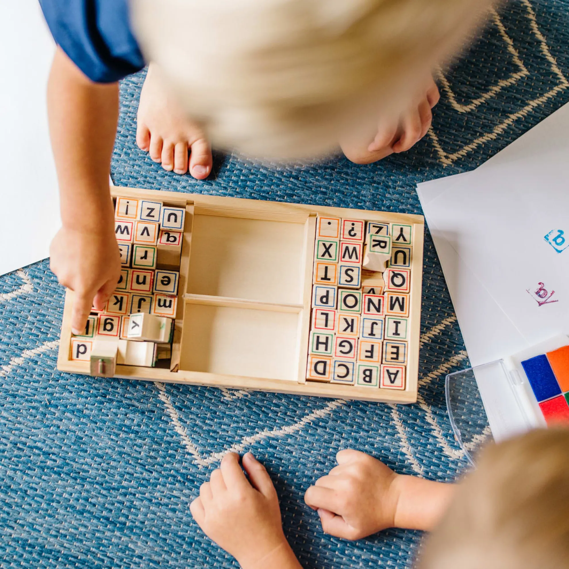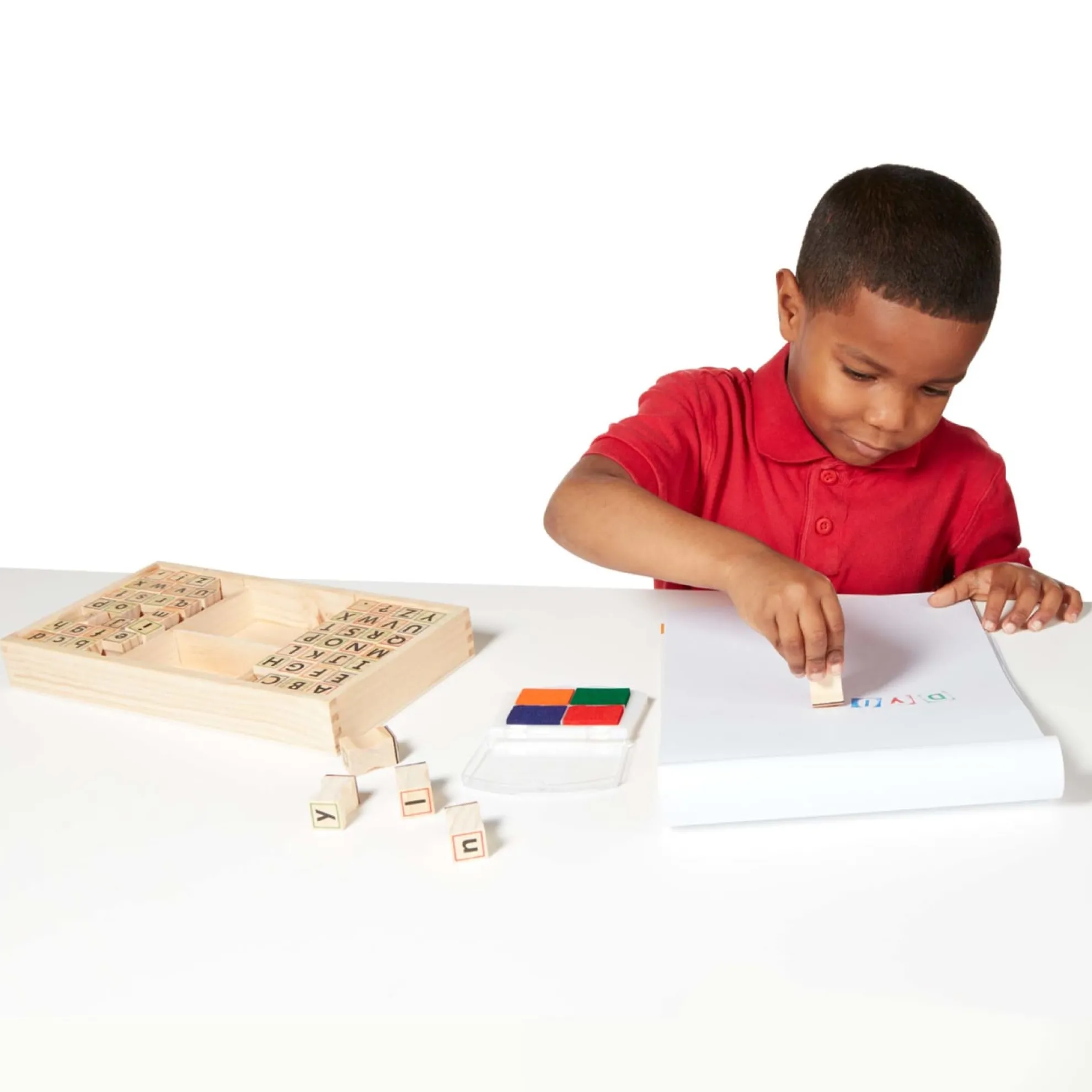 A, B, C, come spell with me! Kids can practice their ABCs while stamping out messages with this beautifully organized wooden alphabet stamp set. The set includes 56 stamps made of high-quality, durable wood. It features both upper and lower case letters of the alphabet, four different punctuation marks, and a four-color stamp pad with washable ink! The stamps are designed with contoured wooden handles so little ones can comfortably hold and maneuver them. Wooden stamps are a safe and educational developmental toy for kids. They can have loads of fun creating their own personalized messages while practicing letter and color recognition, hand-eye coordination, and creative expression. The set comes in a convenient and sturdy wooden box making clean up and storage a breeze. With so many stamps, several kids can play at the same time! The set makes a fun gift for boys and girls ages 4 and older for hands-on, screen-free play.