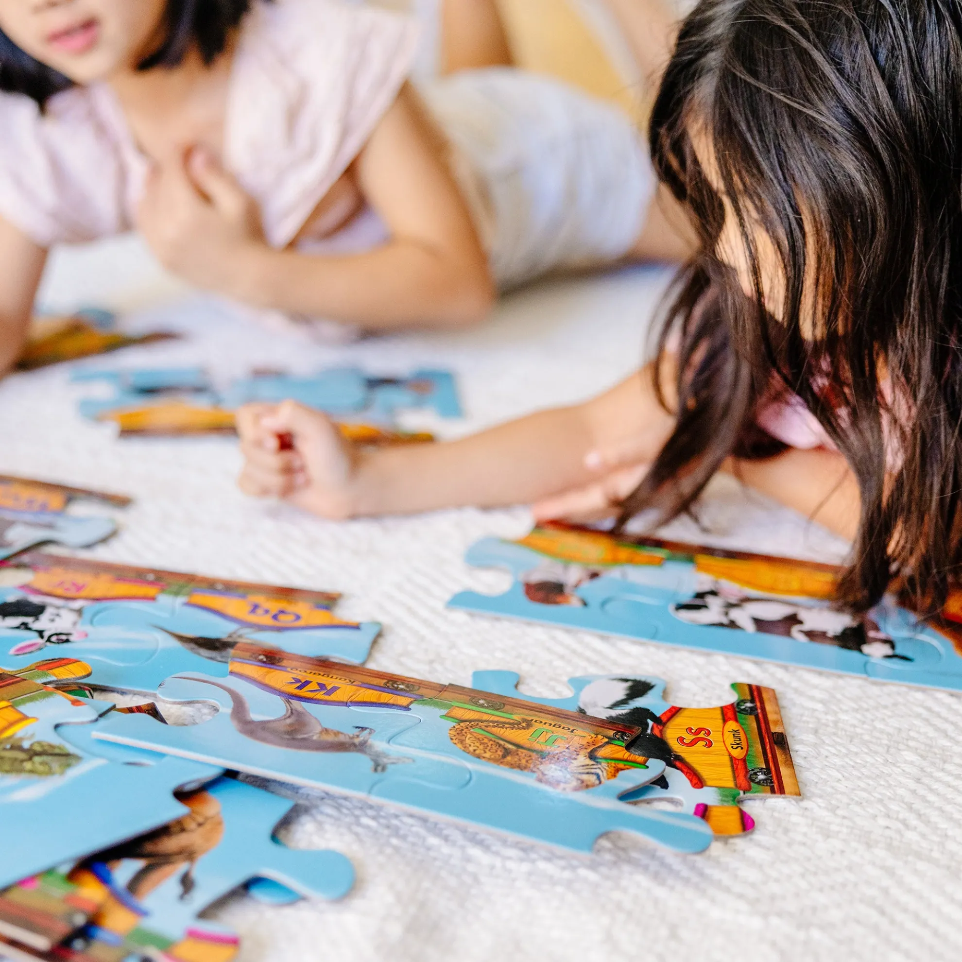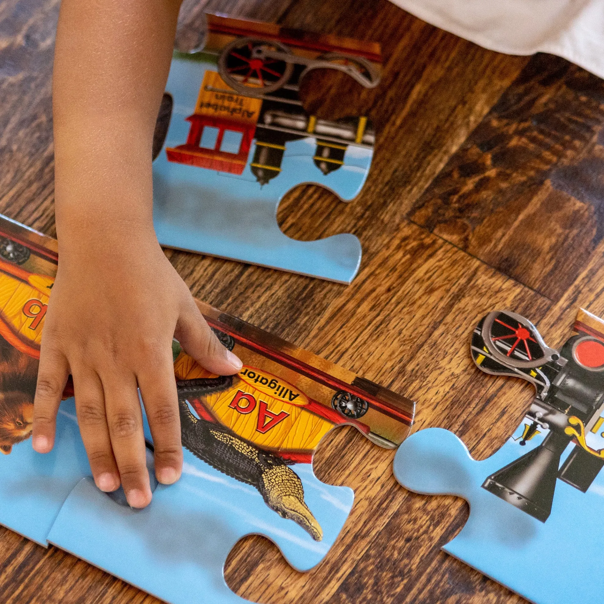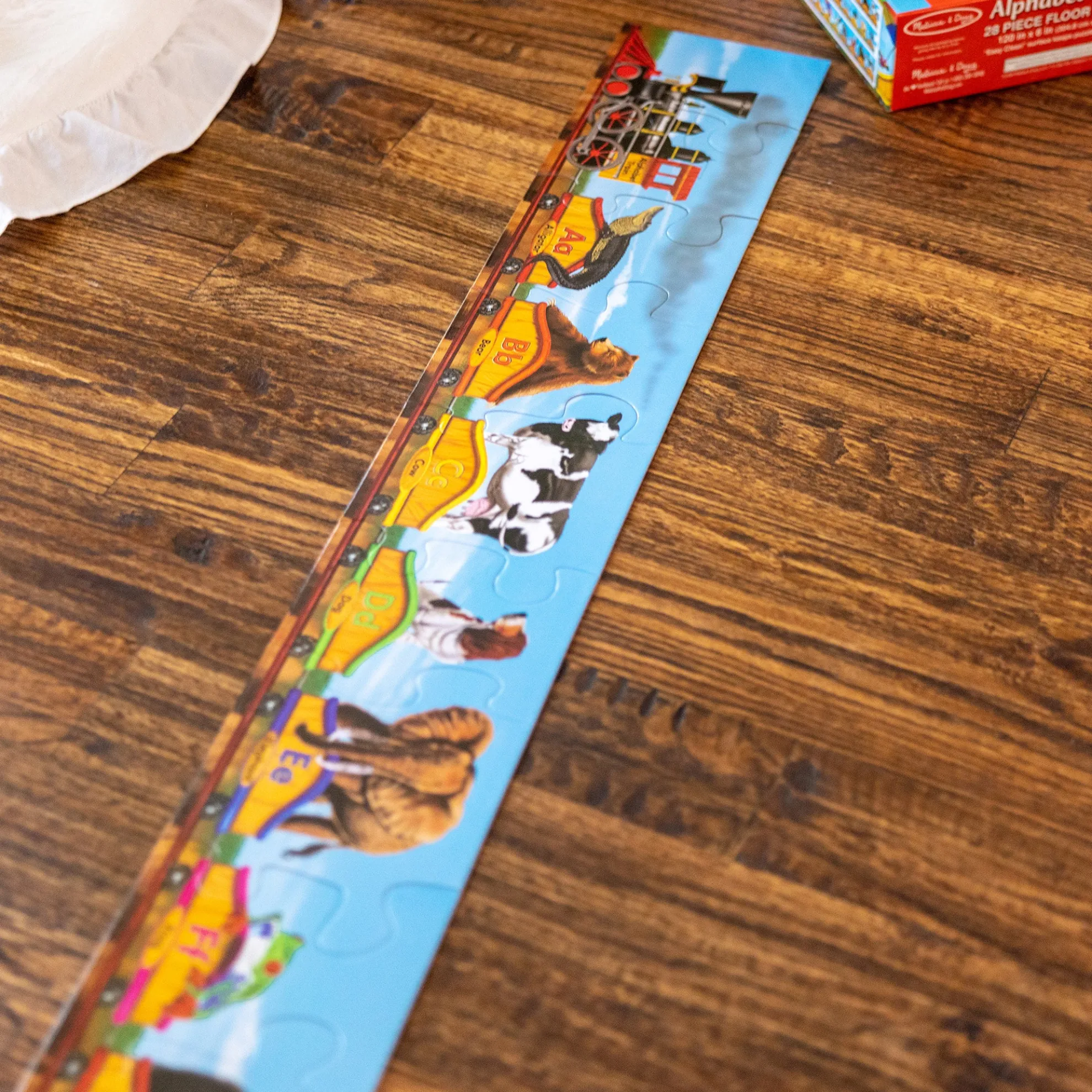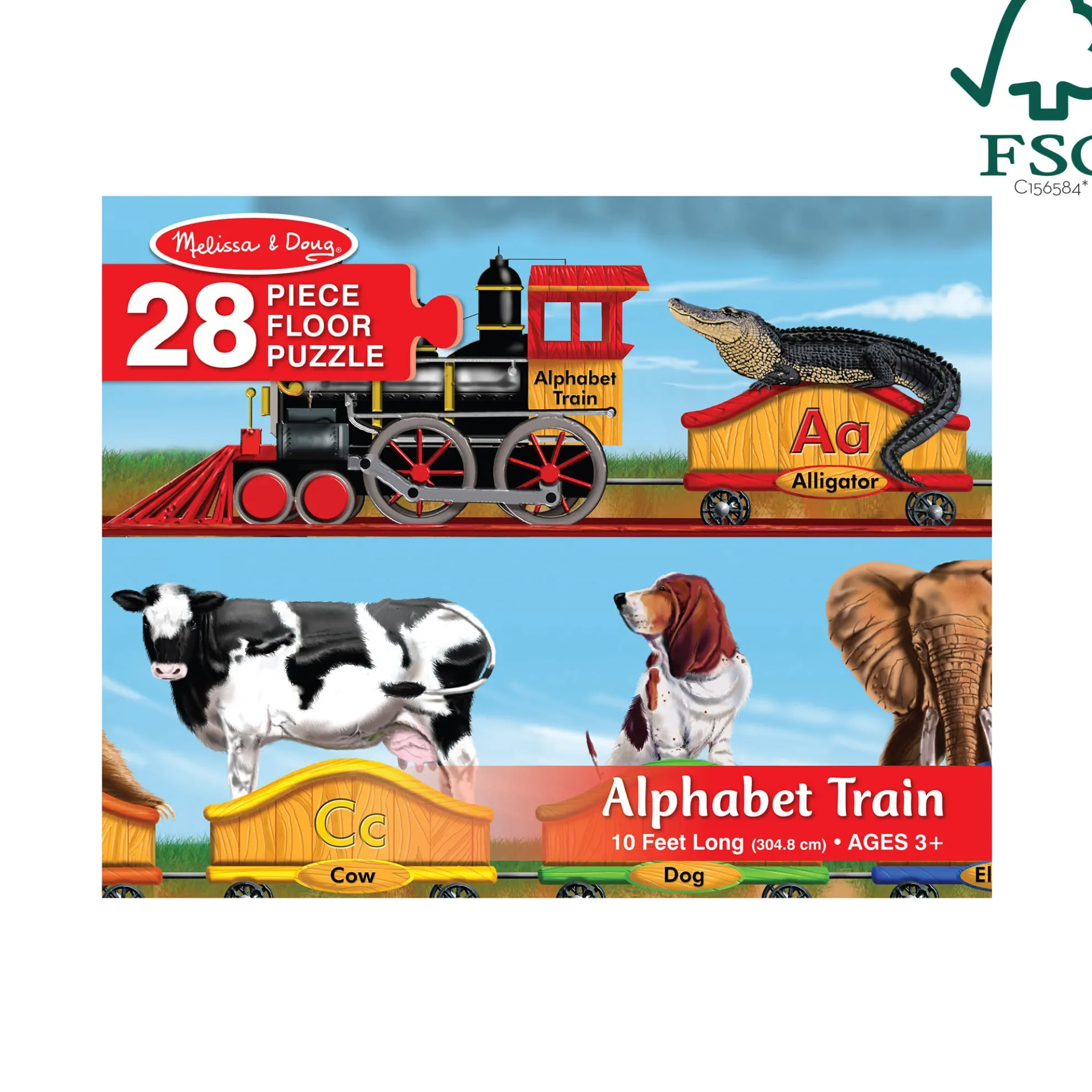 All aboard the Alphabet Train! This large floor puzzle for kids features whimsical and colorful animals and objects going for a ride. It’s made of durable cardboard pieces that stand up to play after play. You’ll need lots of space to put together this beautifully illustrated 28-piece puzzle that’s over 10 feet long once it’s assembled! The extra-thick jigsaw pieces are built to last, and their easy-clean surface keeps the puzzle looking new, making cleanup simple after accidental spills. Children will love the thick puzzle pieces that are easy to handle and put together. The finished puzzle displays beautiful original artwork of the Alphabet Train that’s both visually stimulating and educational. Our kids’ floor puzzle is designed to help children practice their letters while developing problem-solving skills, shape recognition, and hand-eye coordination. The Alphabet Train jigsaw puzzle makes a great gift for kids ages three and older for hands-on screen-free fun. This product is certified by the Forest Stewardship Council. FSC certification ensures that products come from responsibly managed forests that provide environmental, social, and economic benefits, and that forests are protected for future generations. Please note that FSC certification applies to new inventory only (FSC C156584).