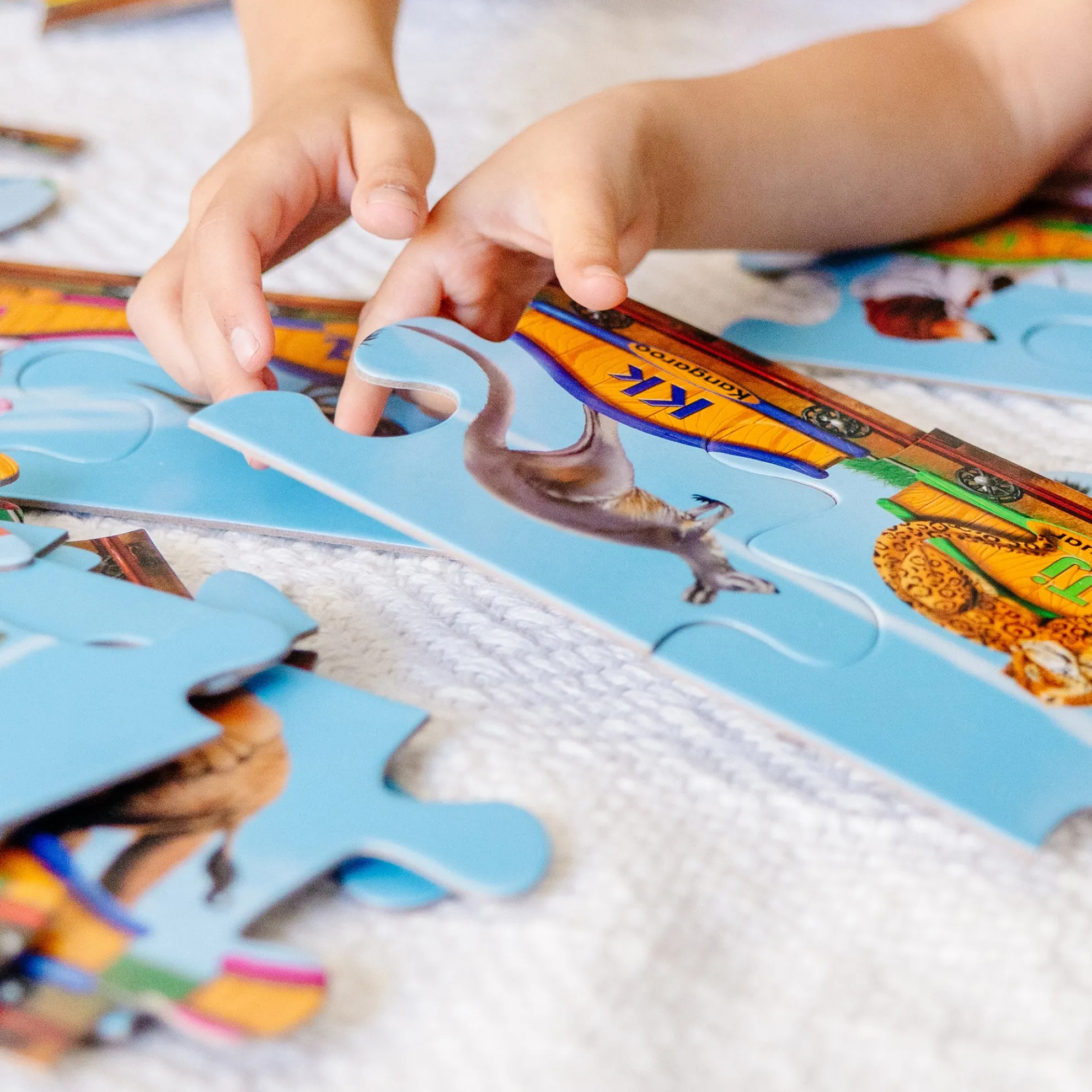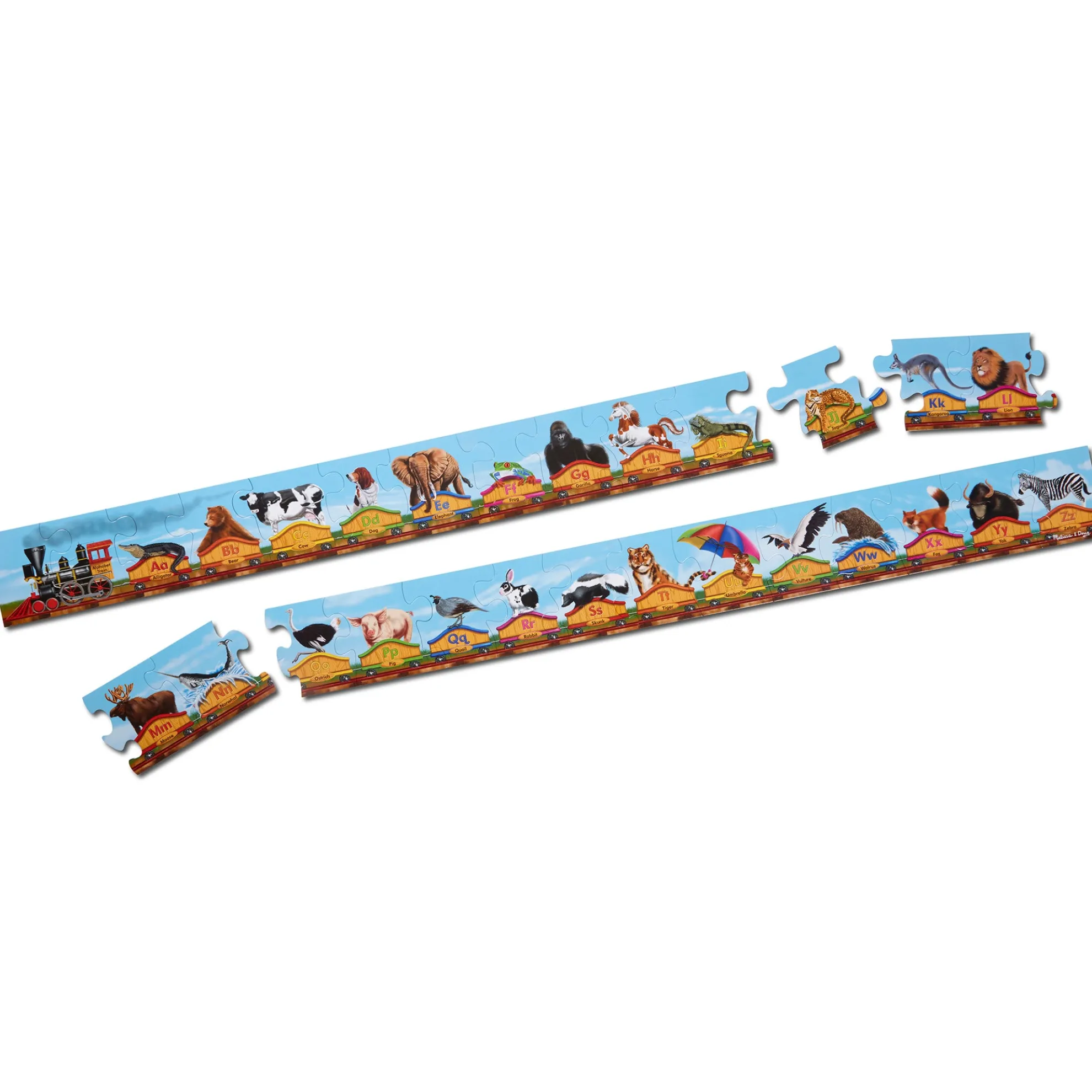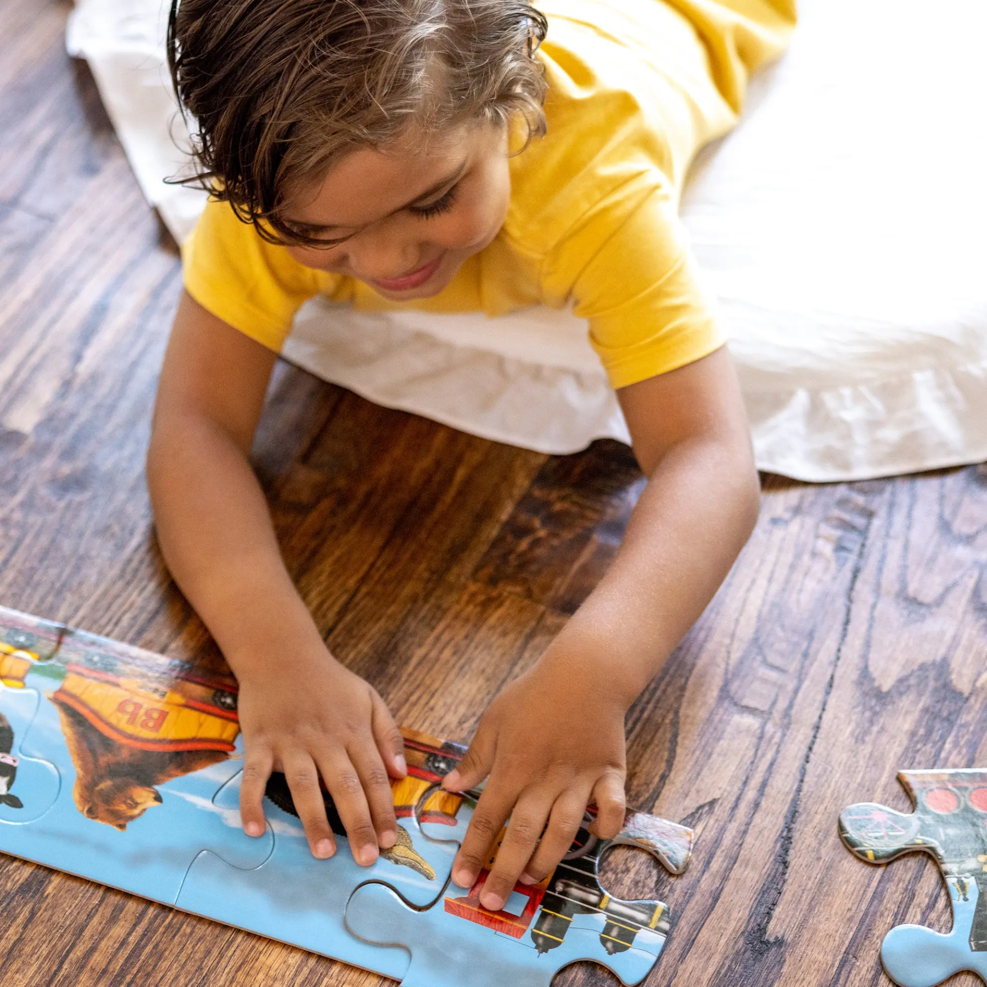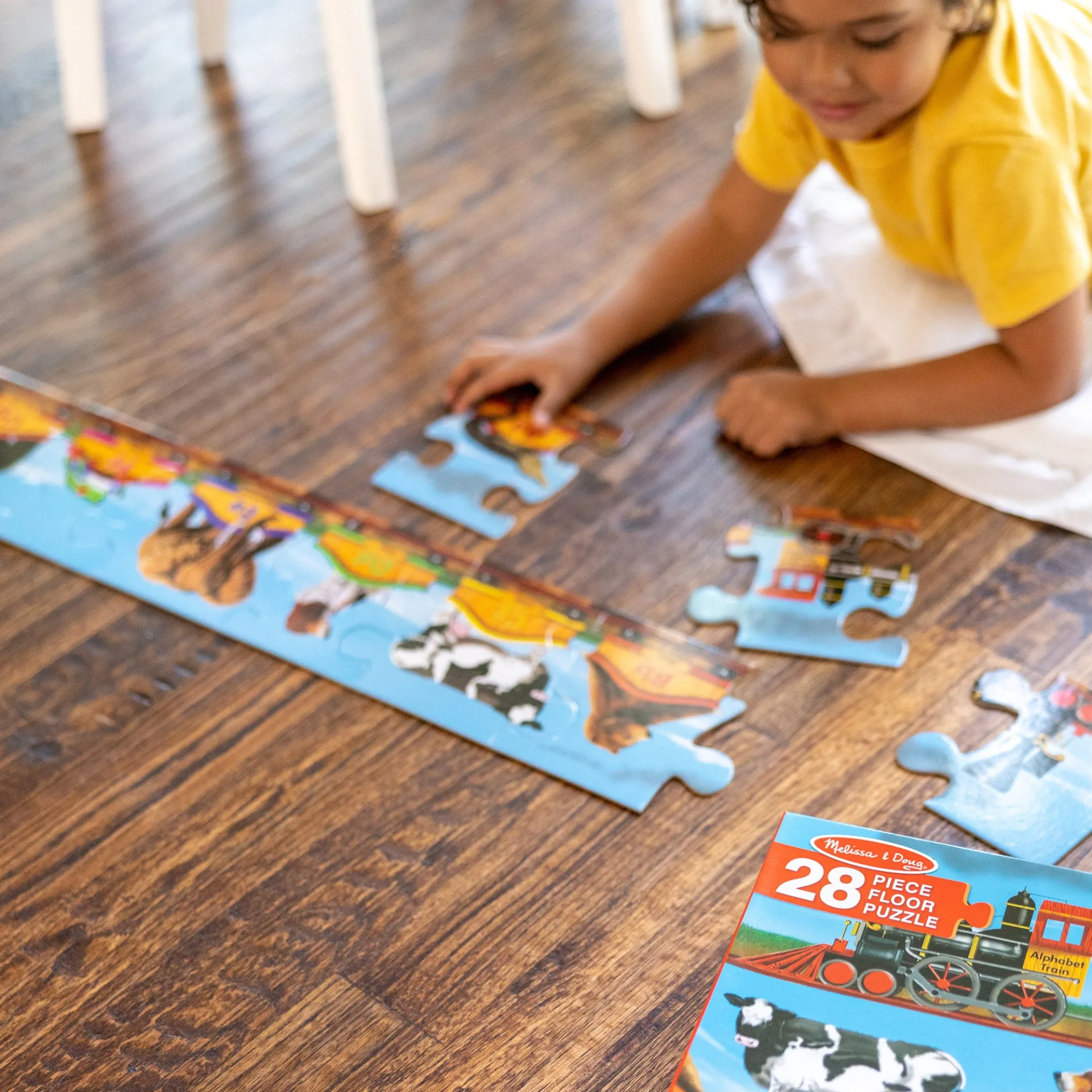 All aboard the Alphabet Train! This large floor puzzle for kids features whimsical and colorful animals and objects going for a ride. It’s made of durable cardboard pieces that stand up to play after play. You’ll need lots of space to put together this beautifully illustrated 28-piece puzzle that’s over 10 feet long once it’s assembled! The extra-thick jigsaw pieces are built to last, and their easy-clean surface keeps the puzzle looking new, making cleanup simple after accidental spills. Children will love the thick puzzle pieces that are easy to handle and put together. The finished puzzle displays beautiful original artwork of the Alphabet Train that’s both visually stimulating and educational. Our kids’ floor puzzle is designed to help children practice their letters while developing problem-solving skills, shape recognition, and hand-eye coordination. The Alphabet Train jigsaw puzzle makes a great gift for kids ages three and older for hands-on screen-free fun. This product is certified by the Forest Stewardship Council. FSC certification ensures that products come from responsibly managed forests that provide environmental, social, and economic benefits, and that forests are protected for future generations. Please note that FSC certification applies to new inventory only (FSC C156584).