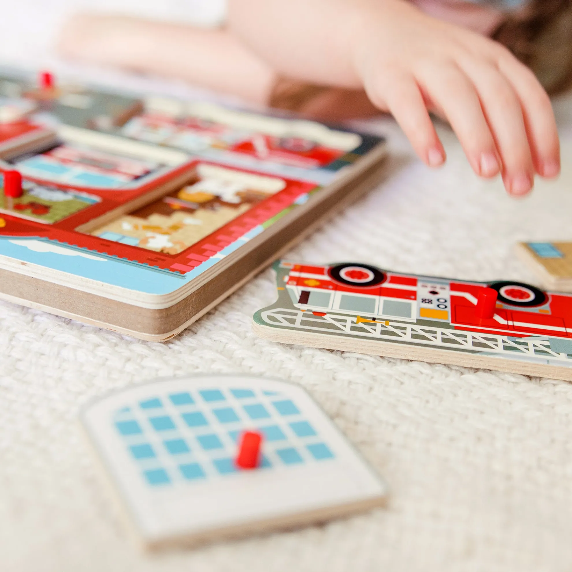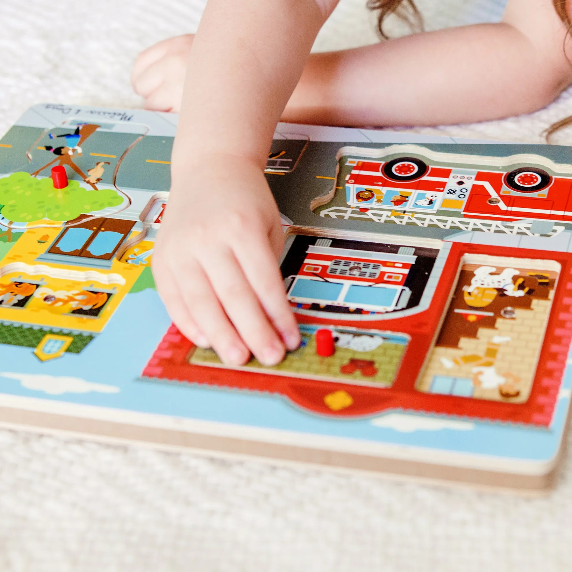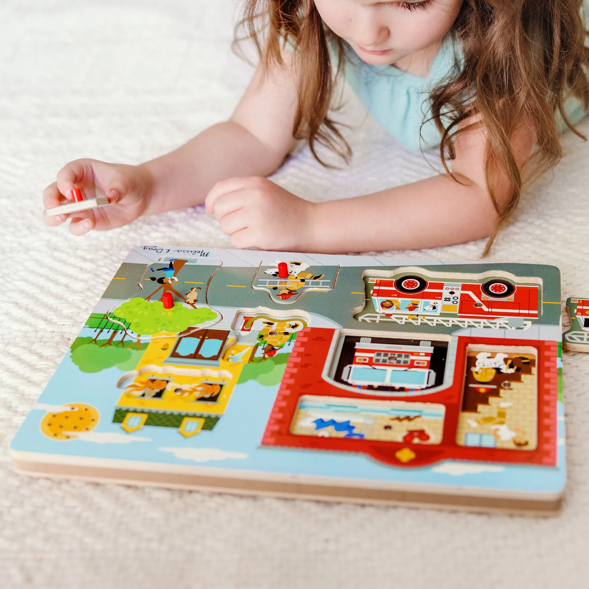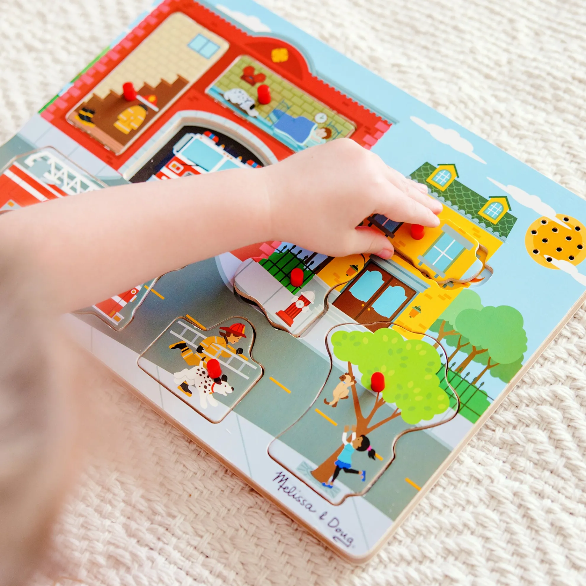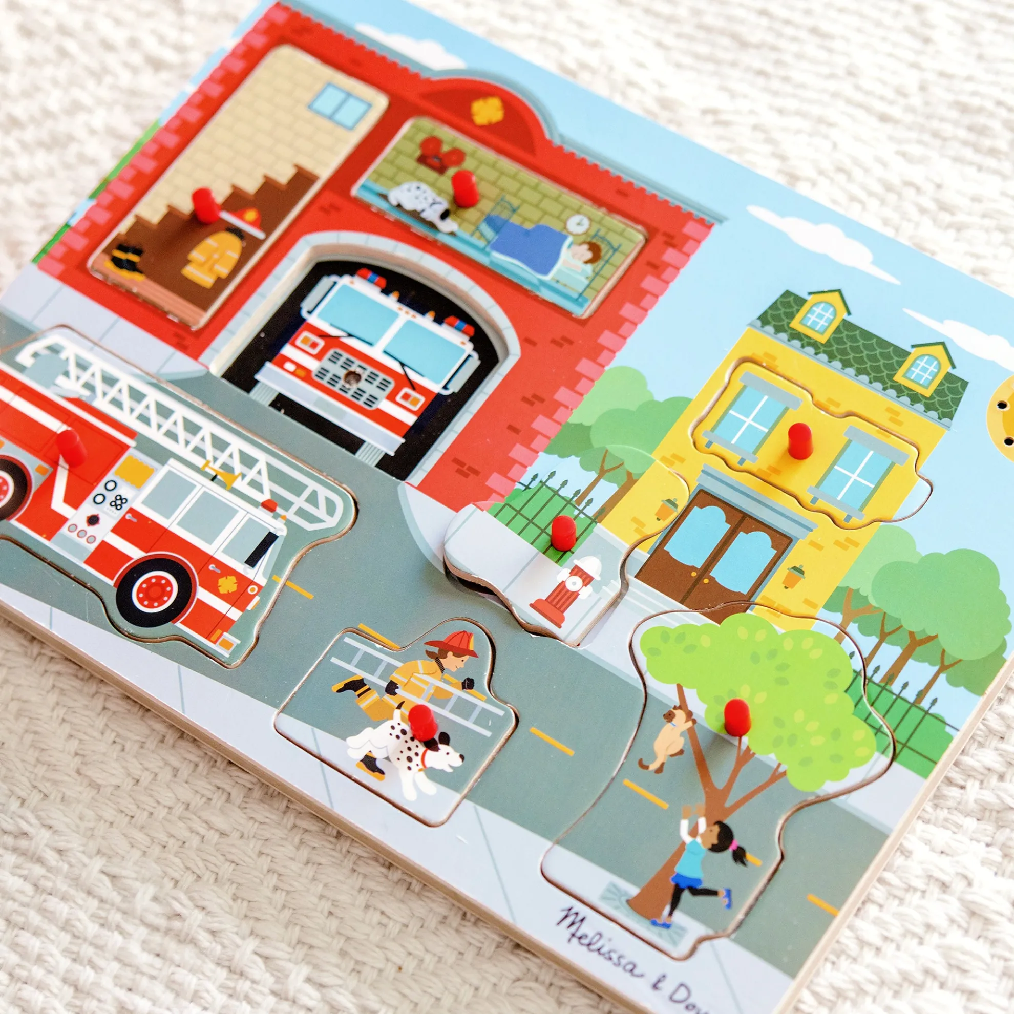- 8-piece wooden sound peg puzzle with realistic fire station and neighborhood sounds