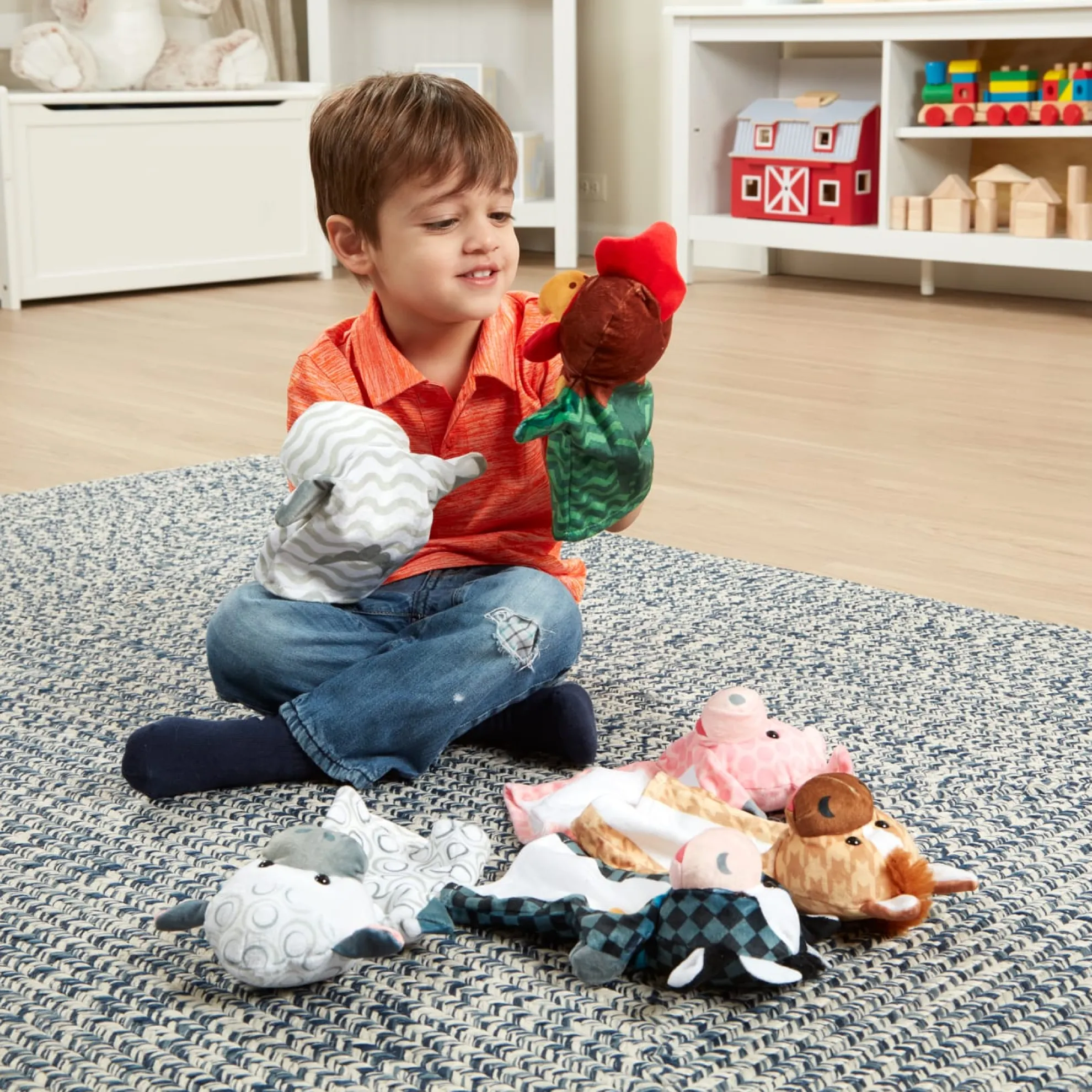 - Set of 6 soft and cuddly hand puppets in a farm animals theme