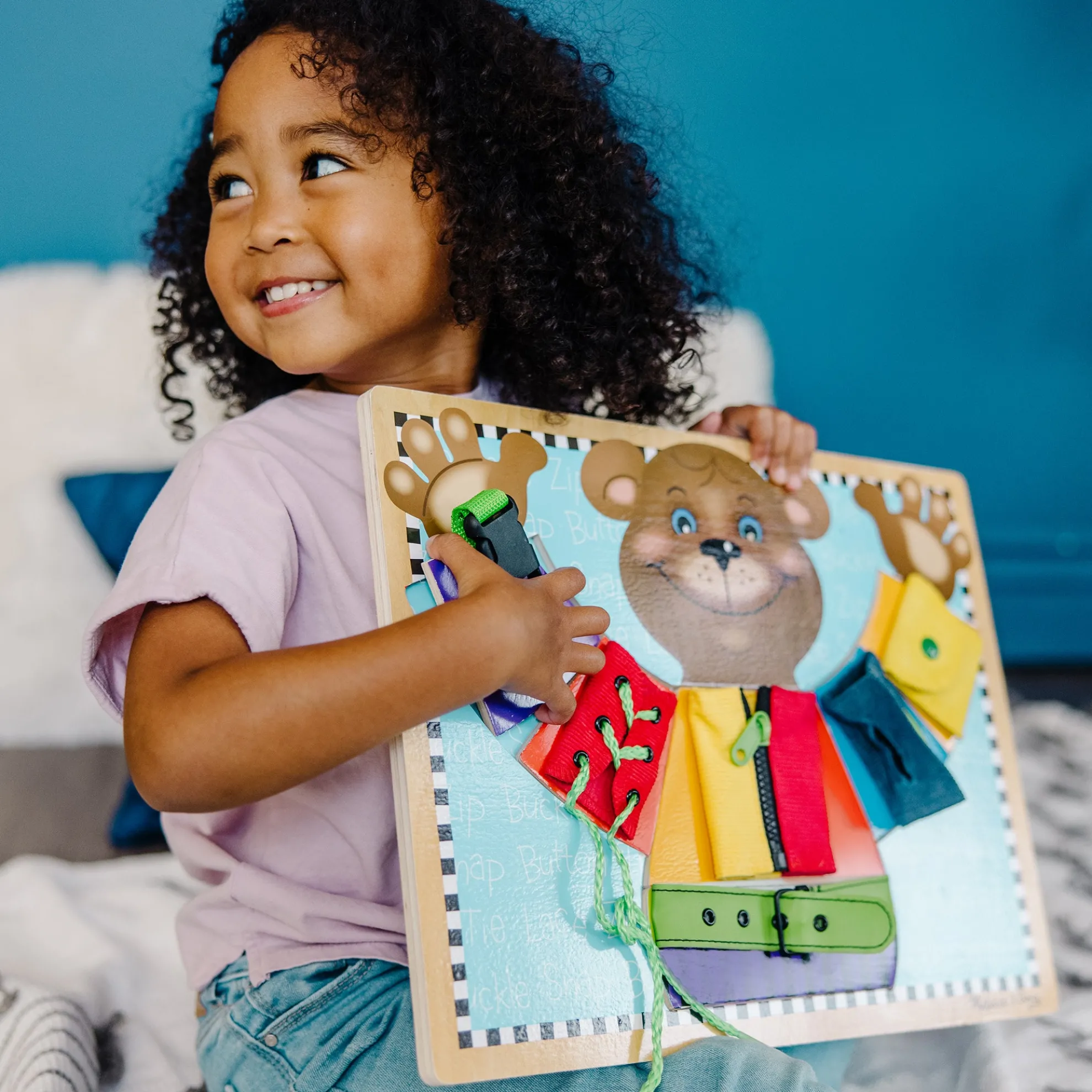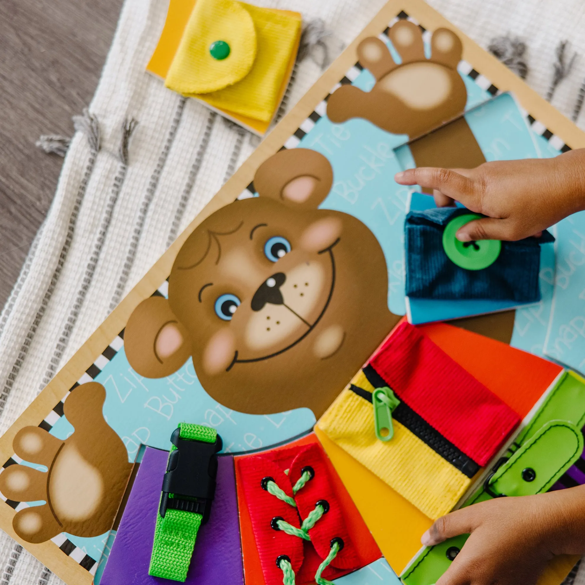- Buckle (belt and seat belt), button, lace, snap, tie and zip your way to independent dressing skills