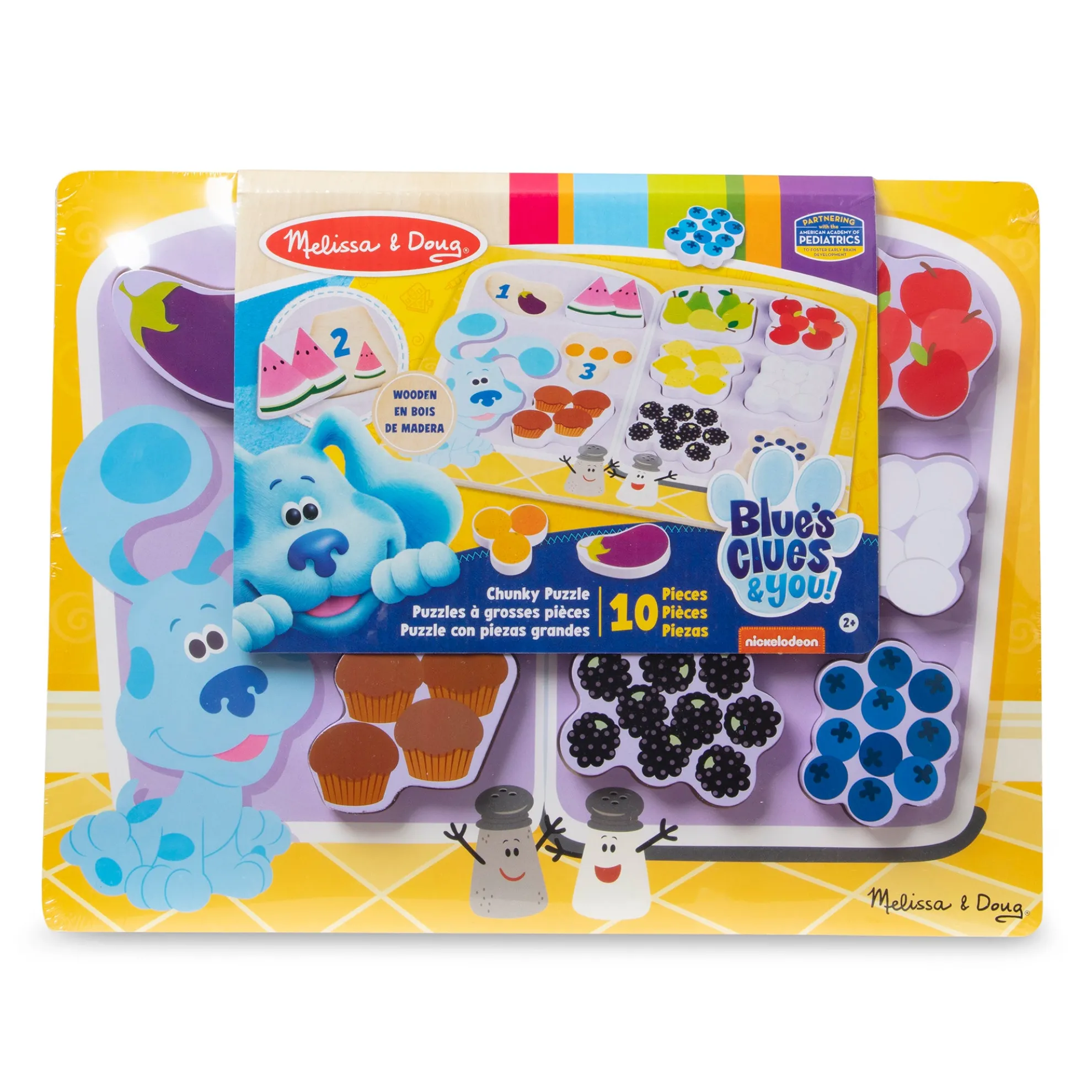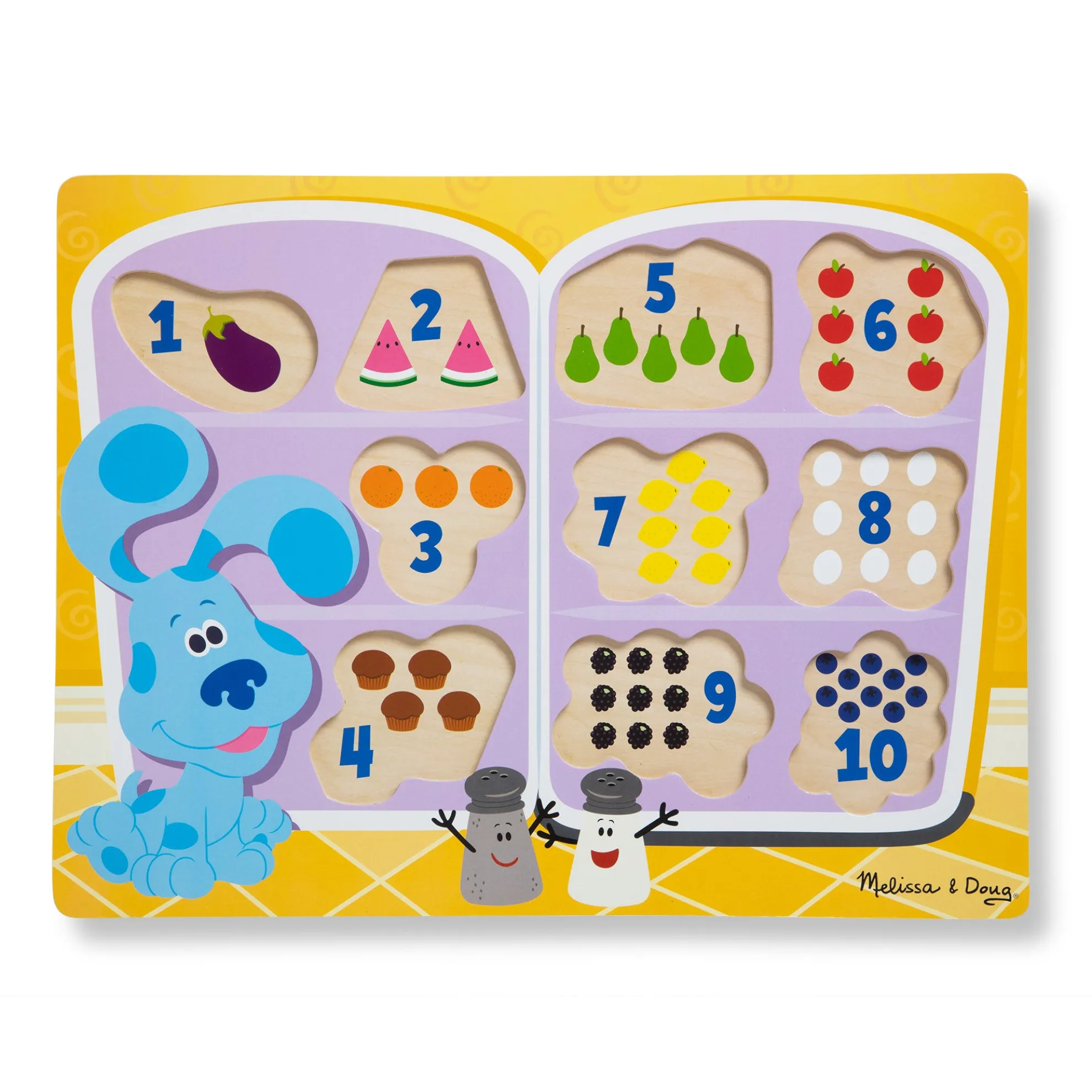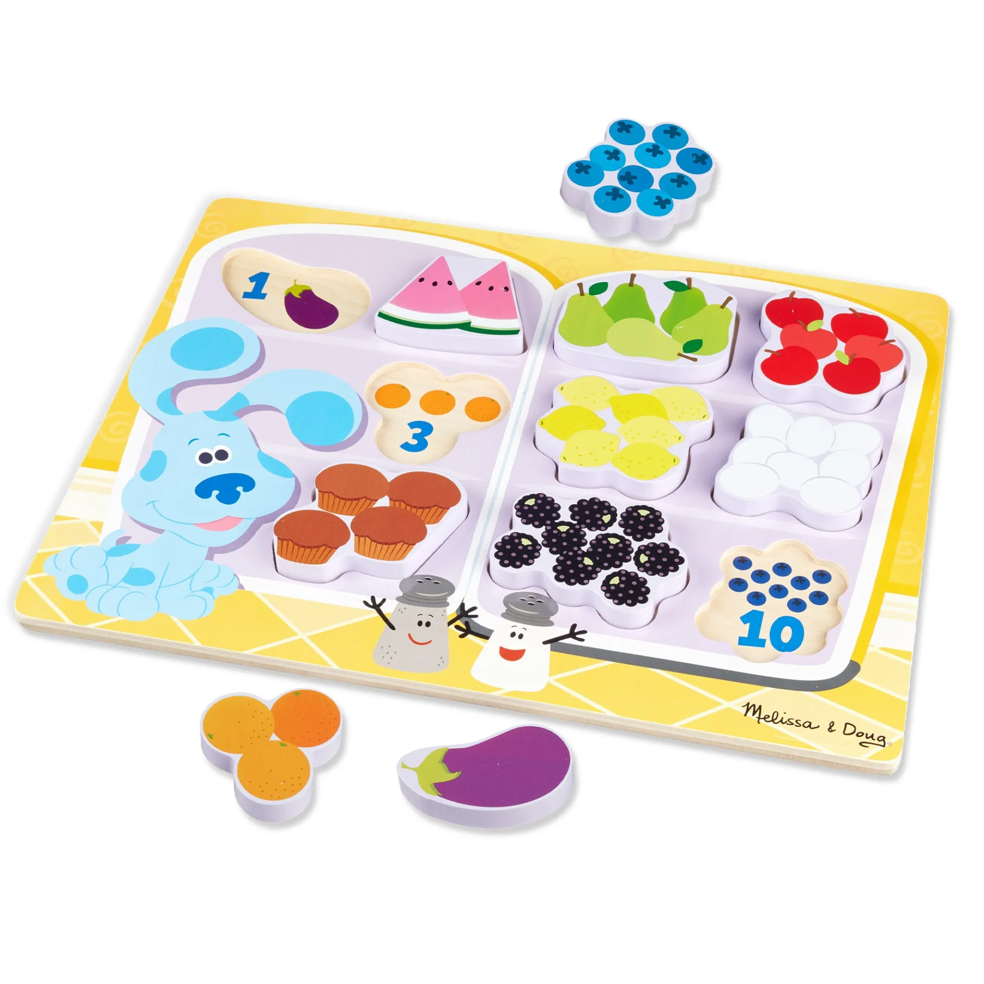 - 10-piece wooden chunky puzzle with food to match and count with Blue’s Clues & You! characters and elements