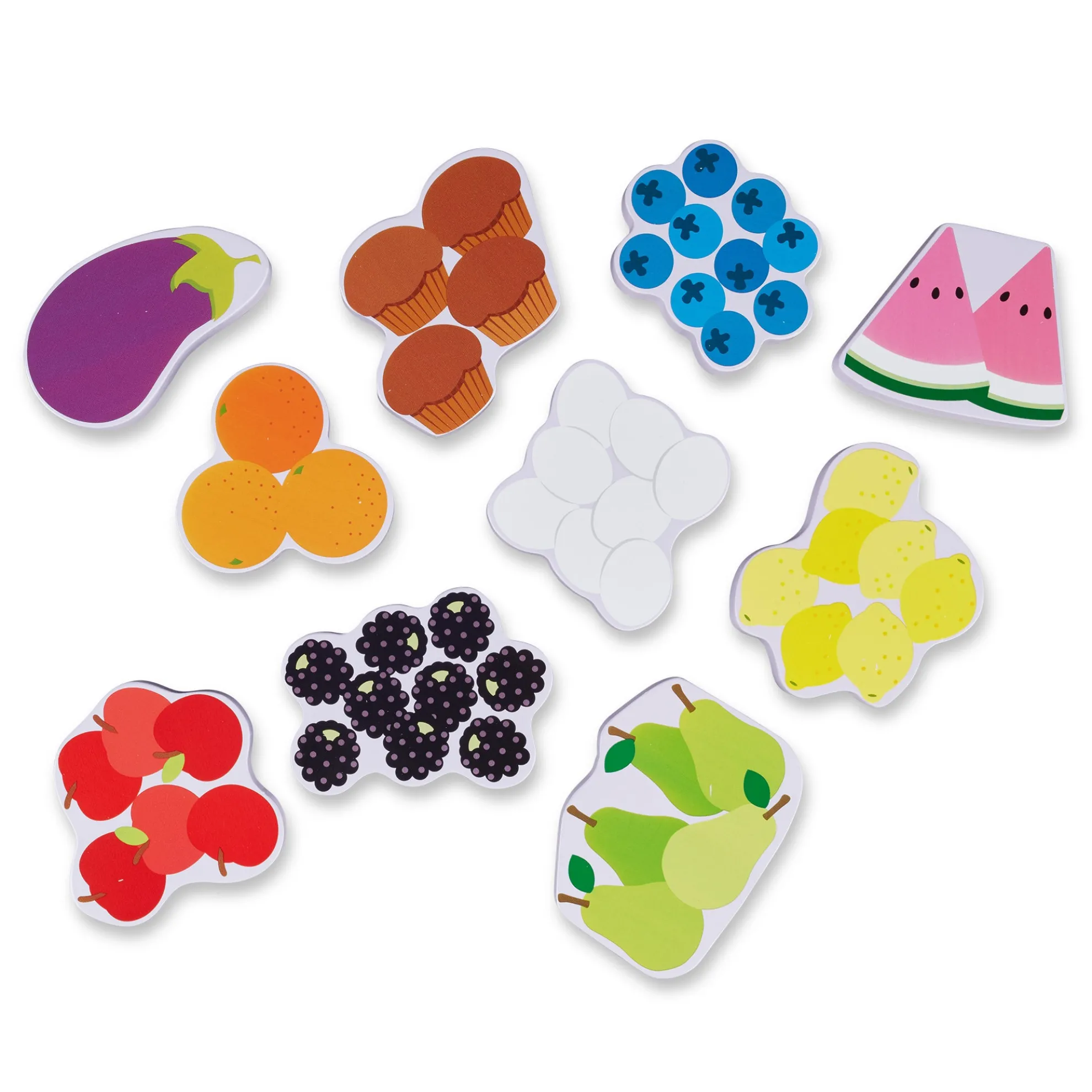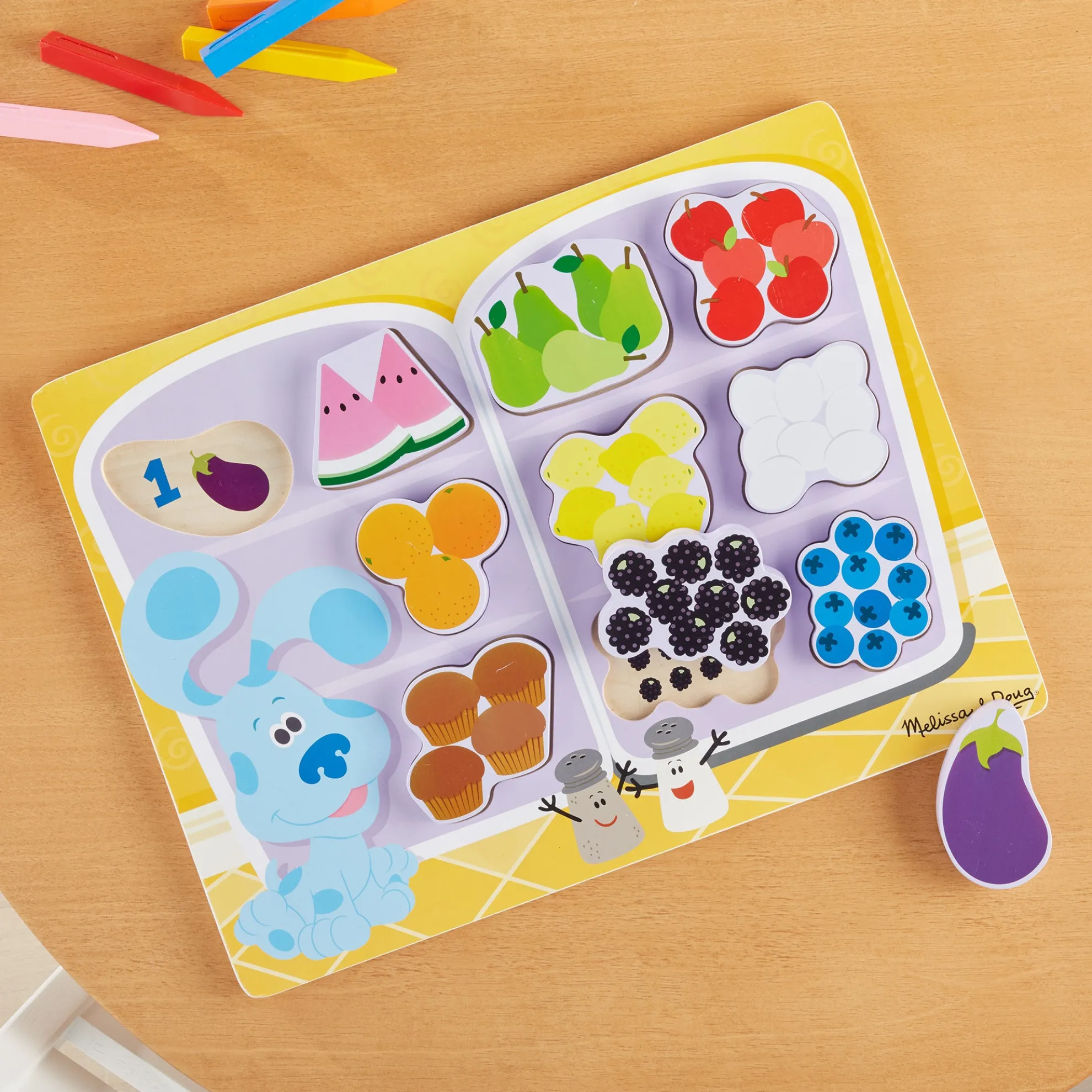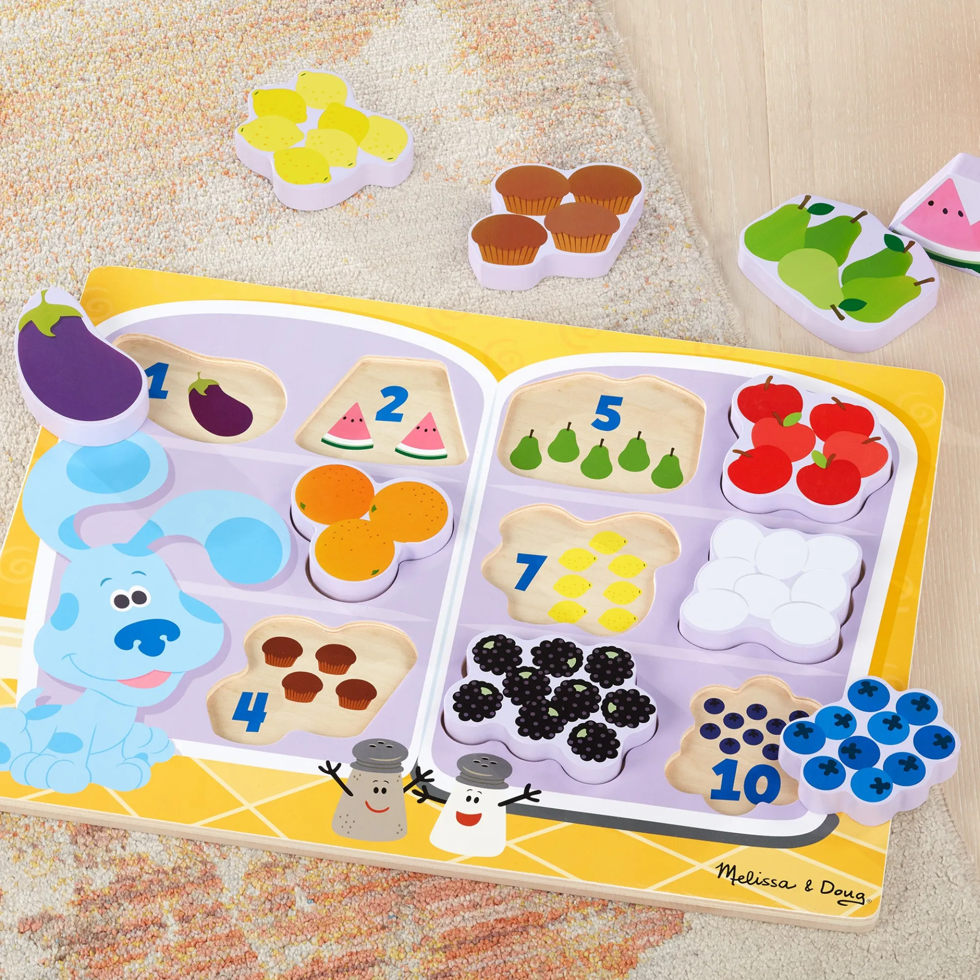 - 10-piece wooden chunky puzzle with food to match and count with Blue’s Clues & You! characters and elements