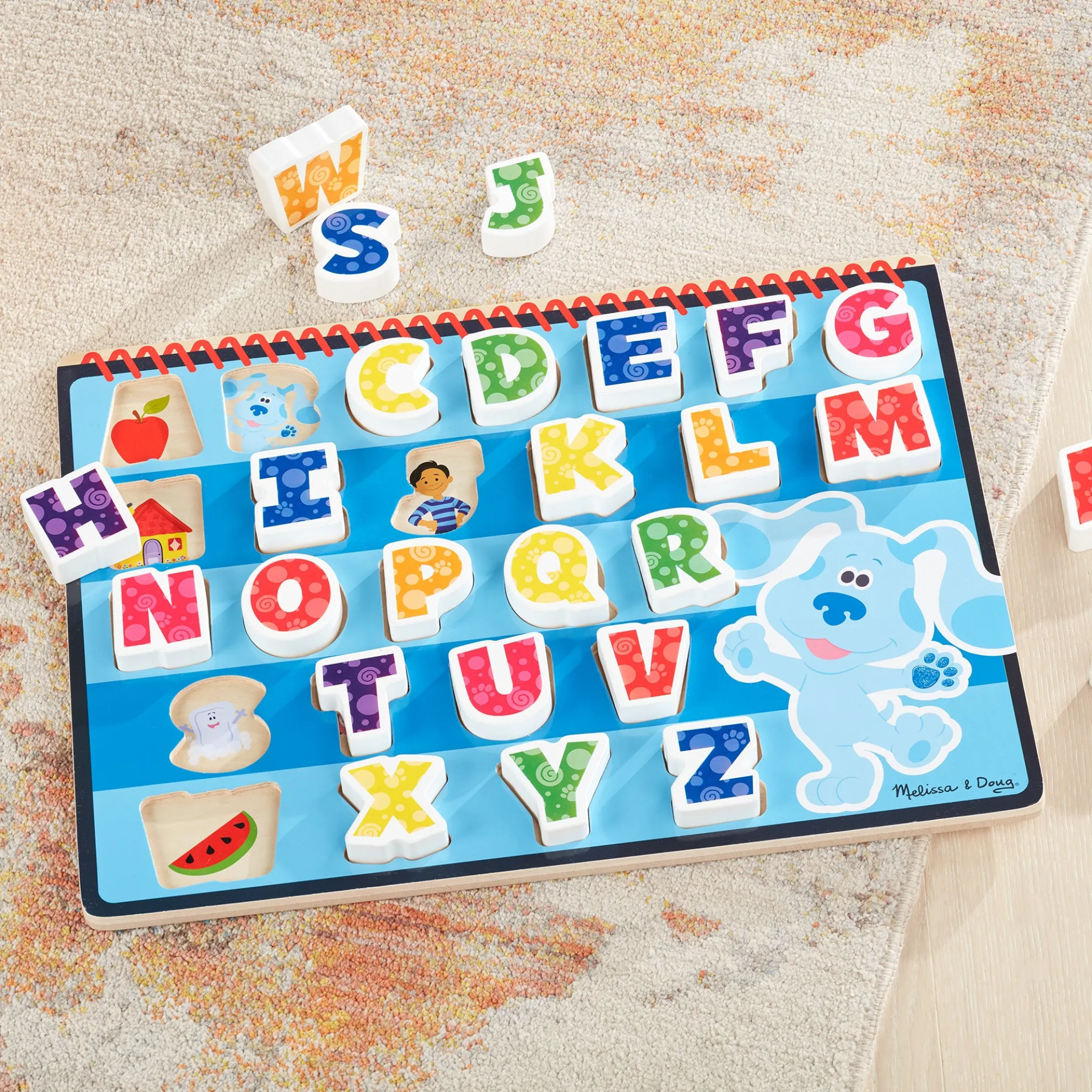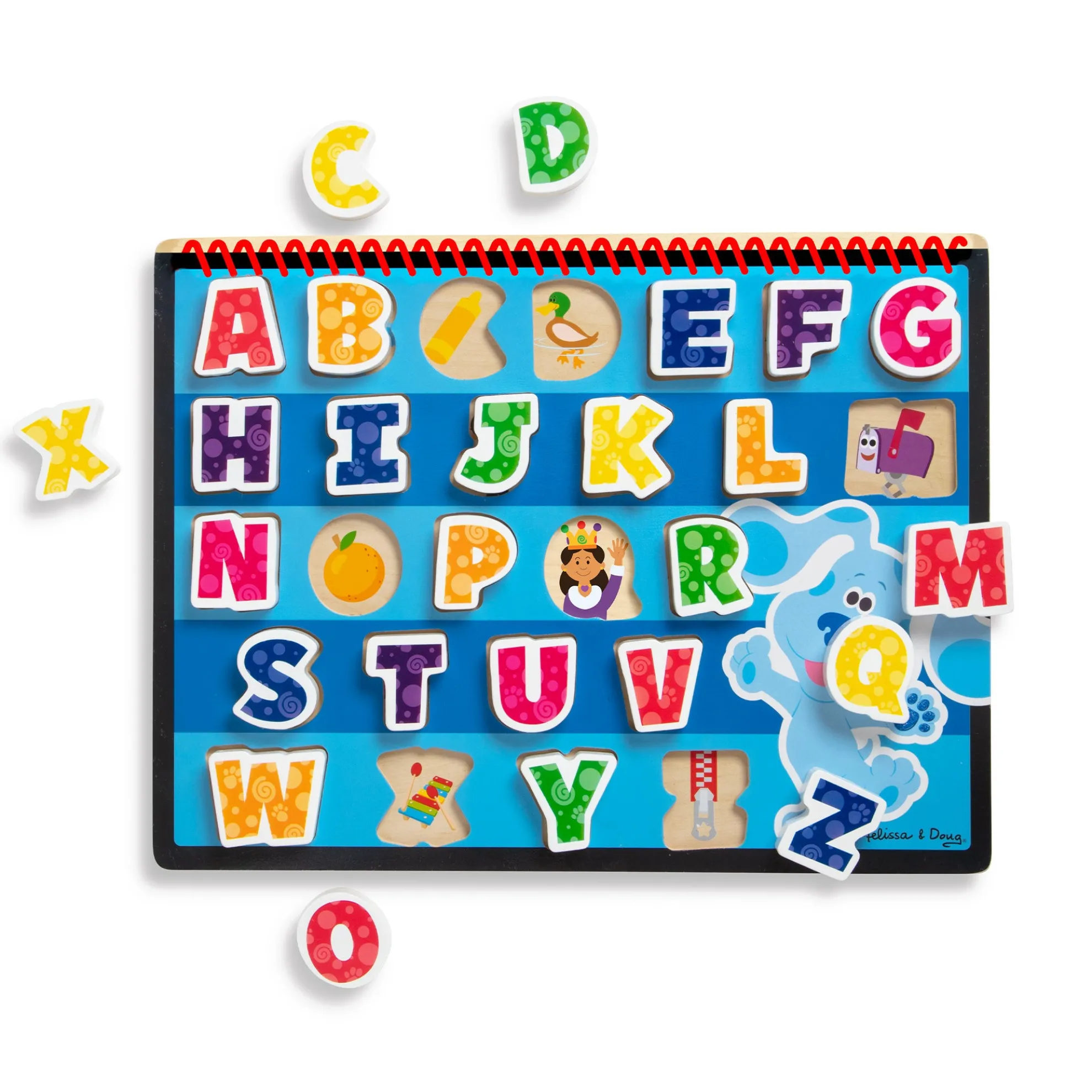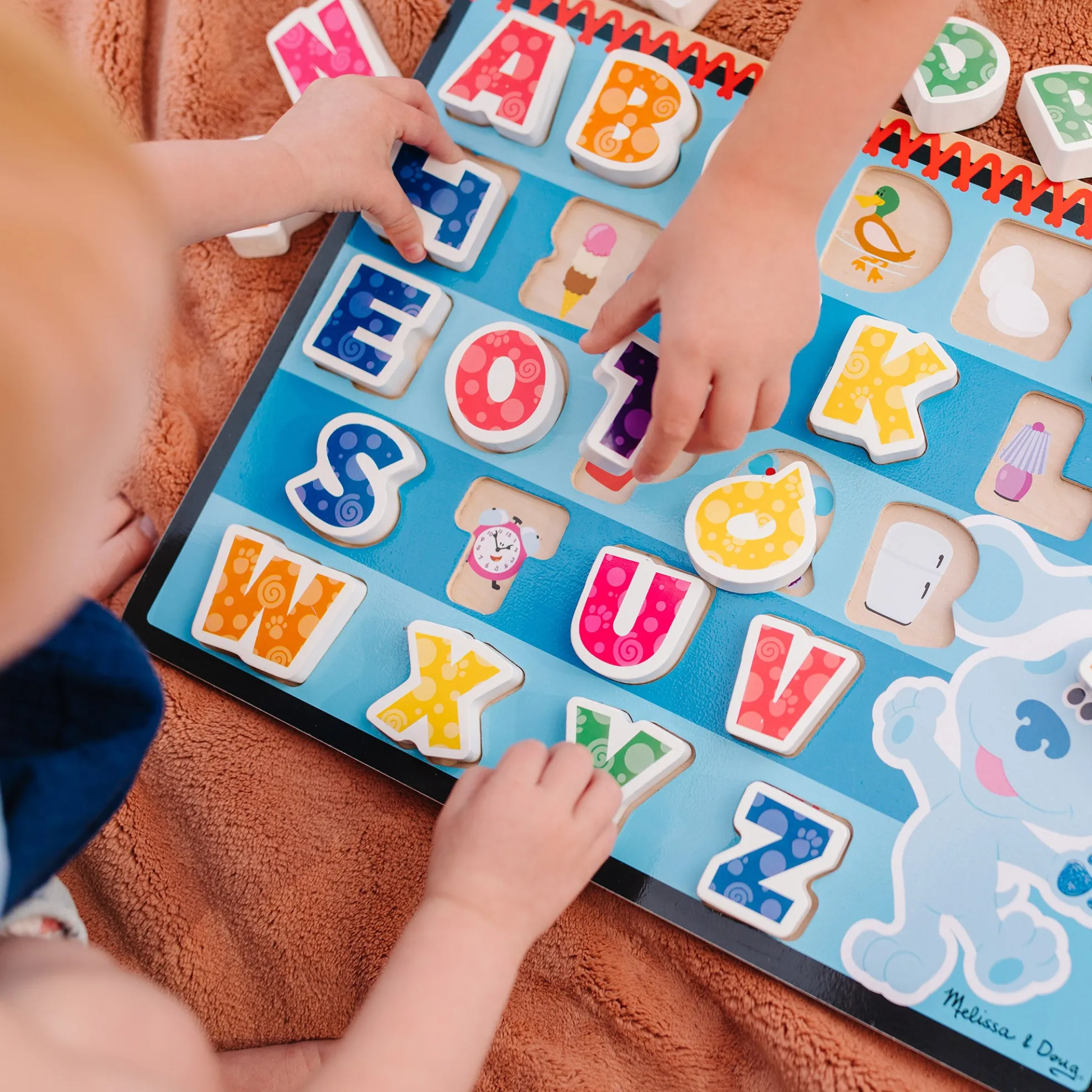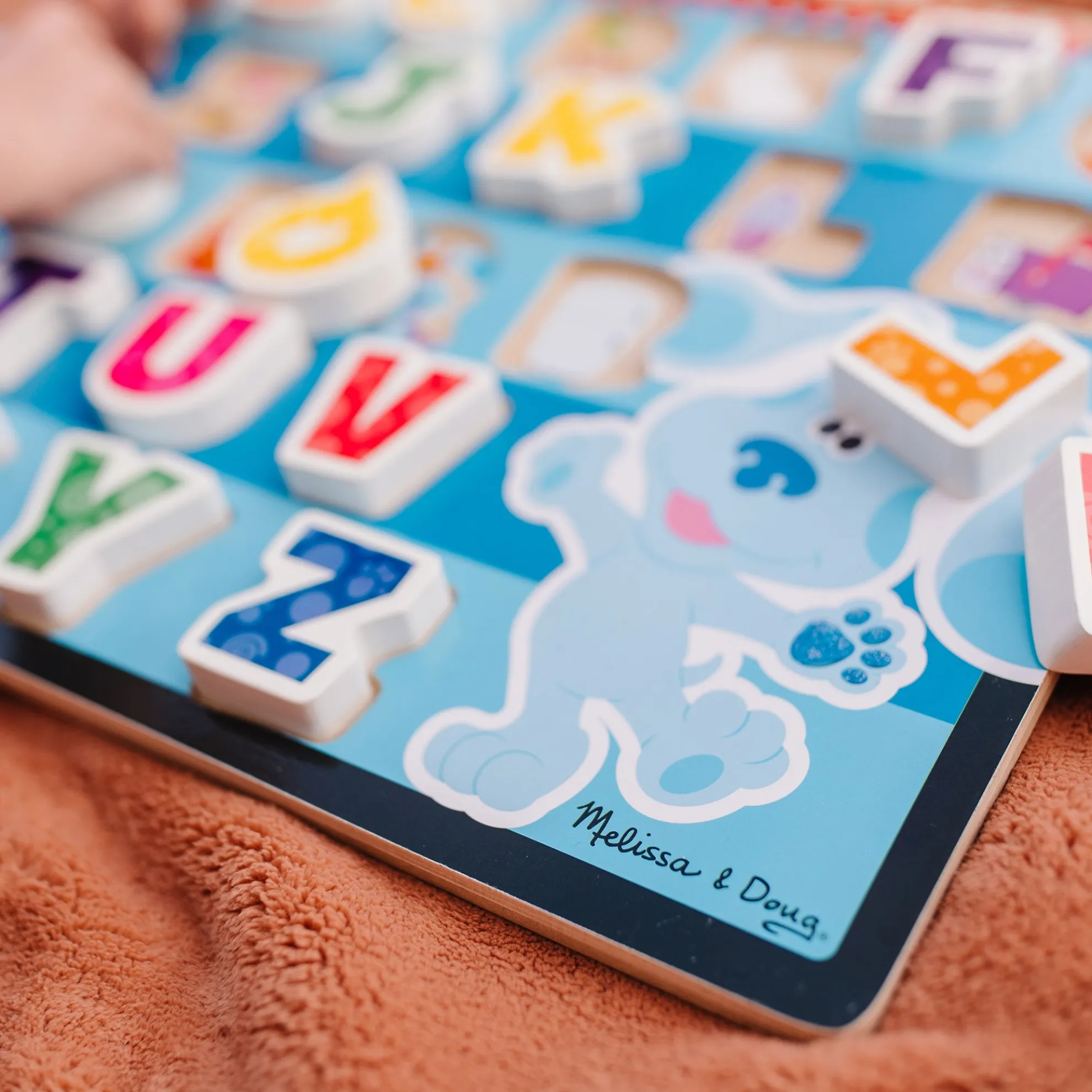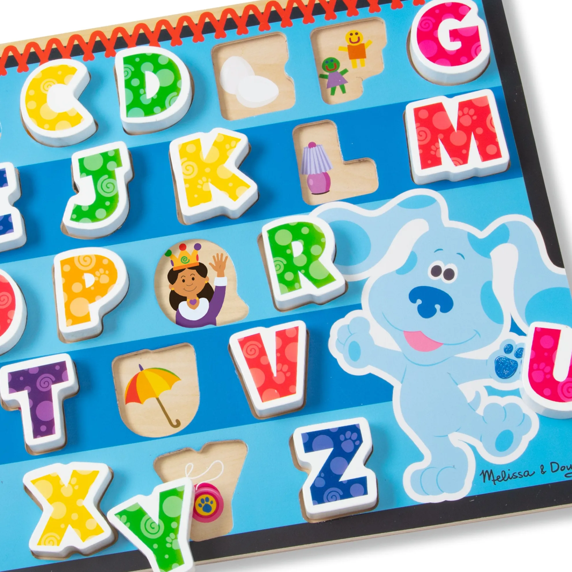 - 26-piece wooden chunky puzzle with letters A-Z and a sturdy wooden puzzle board with Blue’s Clues & You! friends and elements
