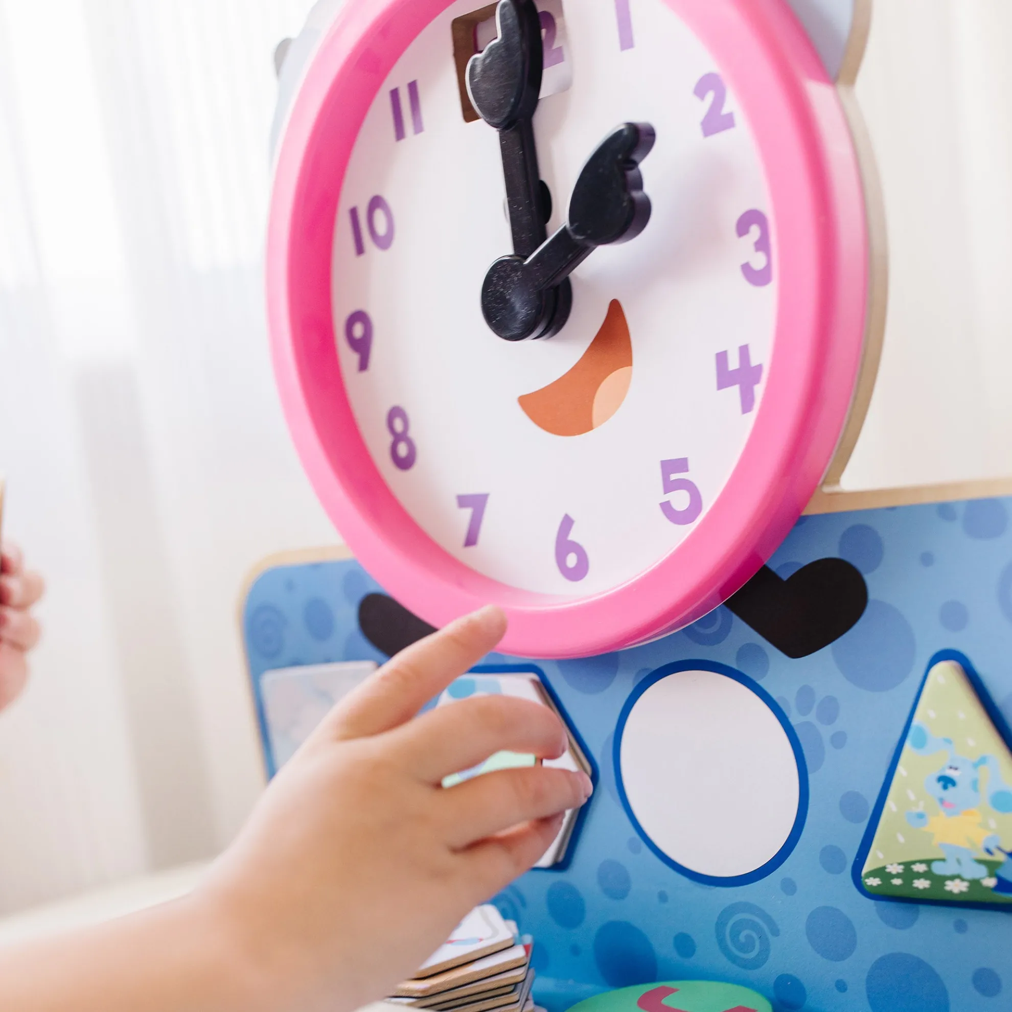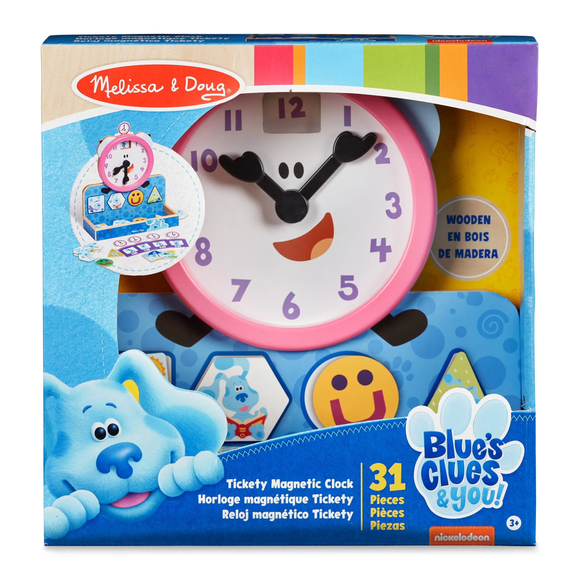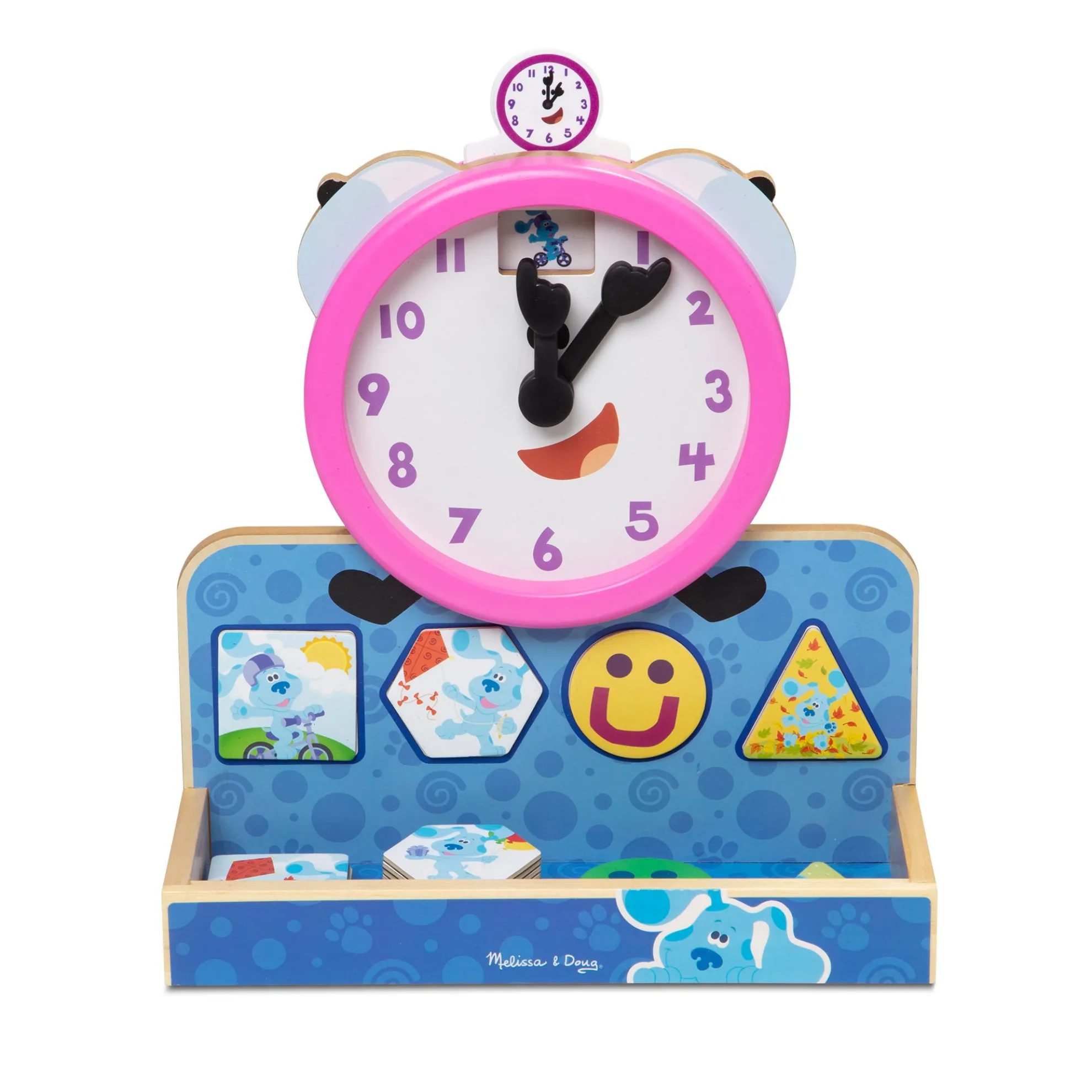 - Learn to tell time, match shapes, and identify activities, feelings, and more with the wooden Tickety Tock Clock from Blue’s Clues & You!