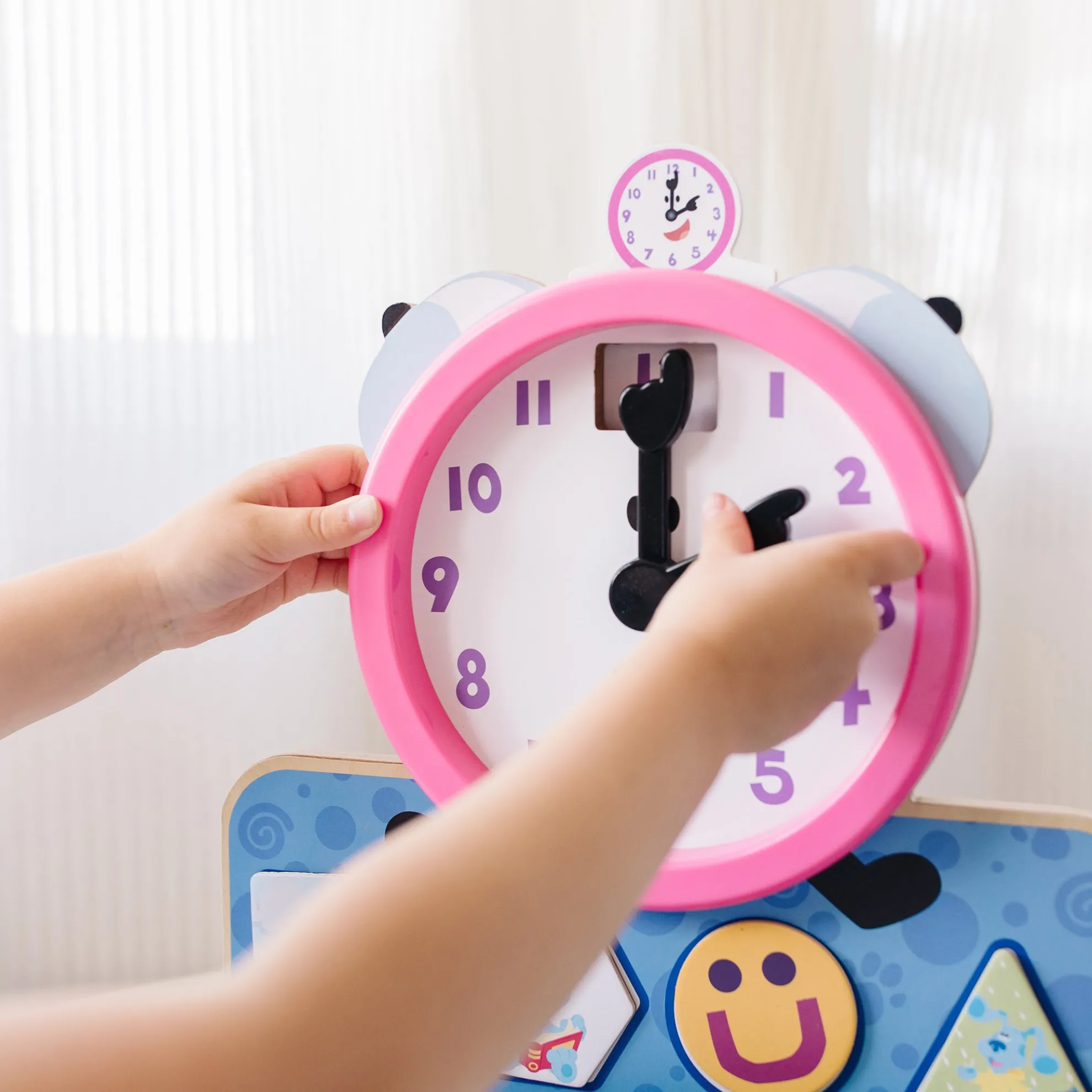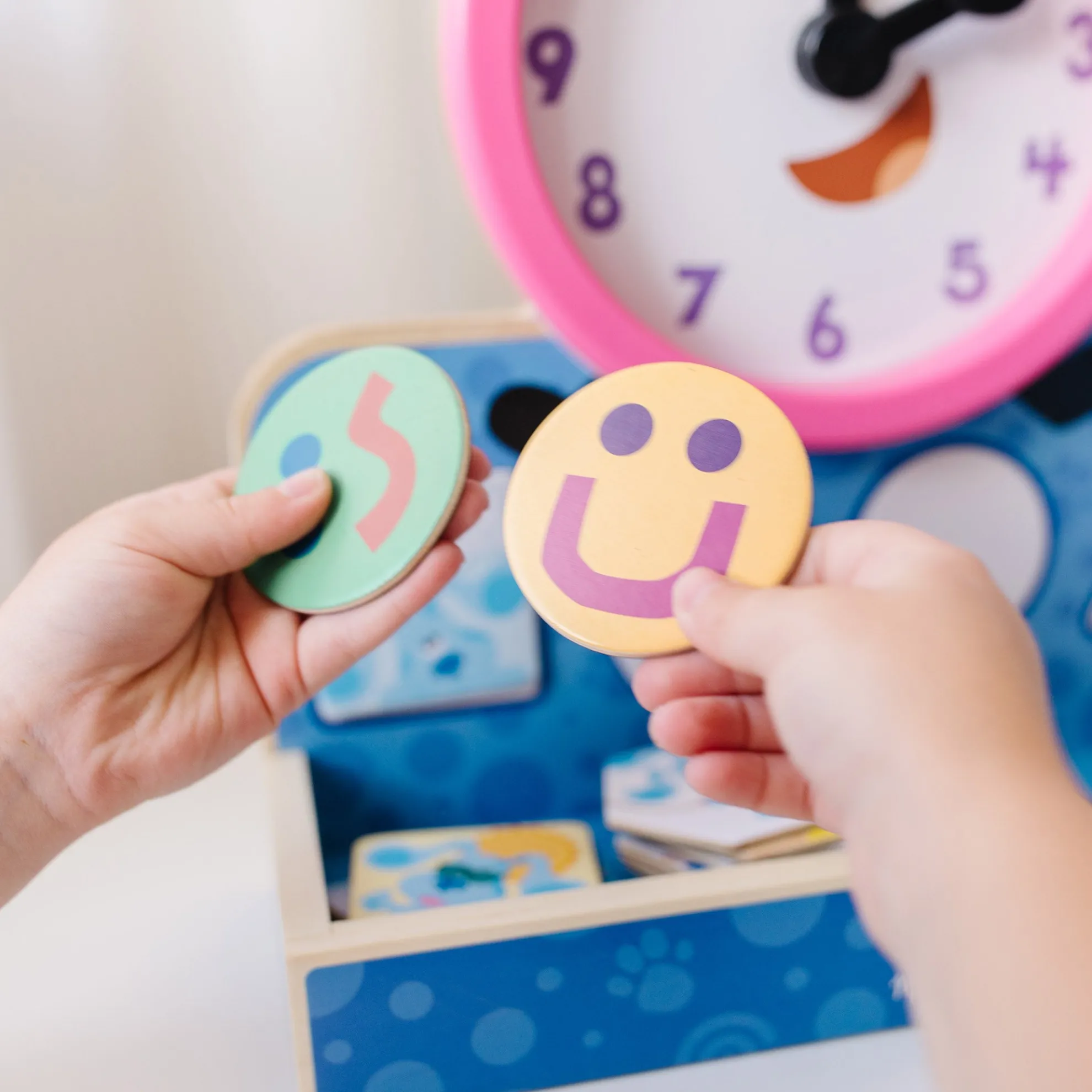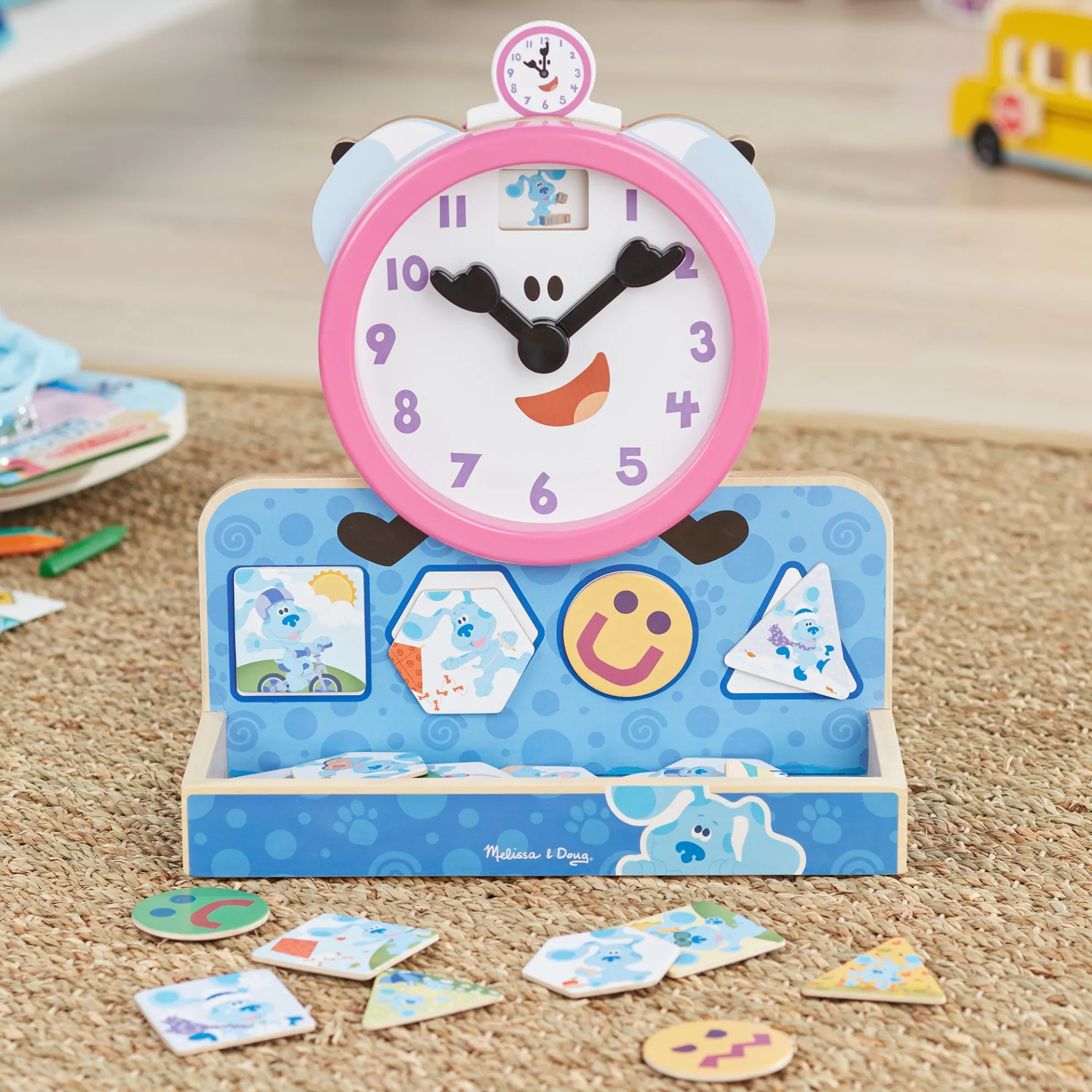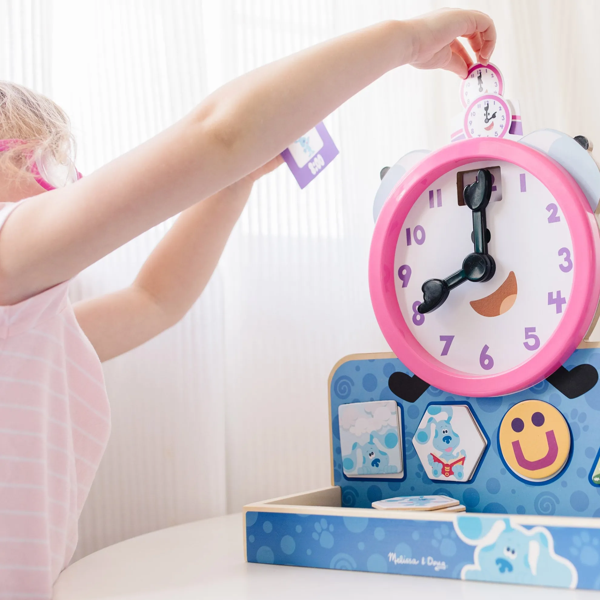 - Learn to tell time, match shapes, and identify activities, feelings, and more with the wooden Tickety Tock Clock from Blue’s Clues & You!