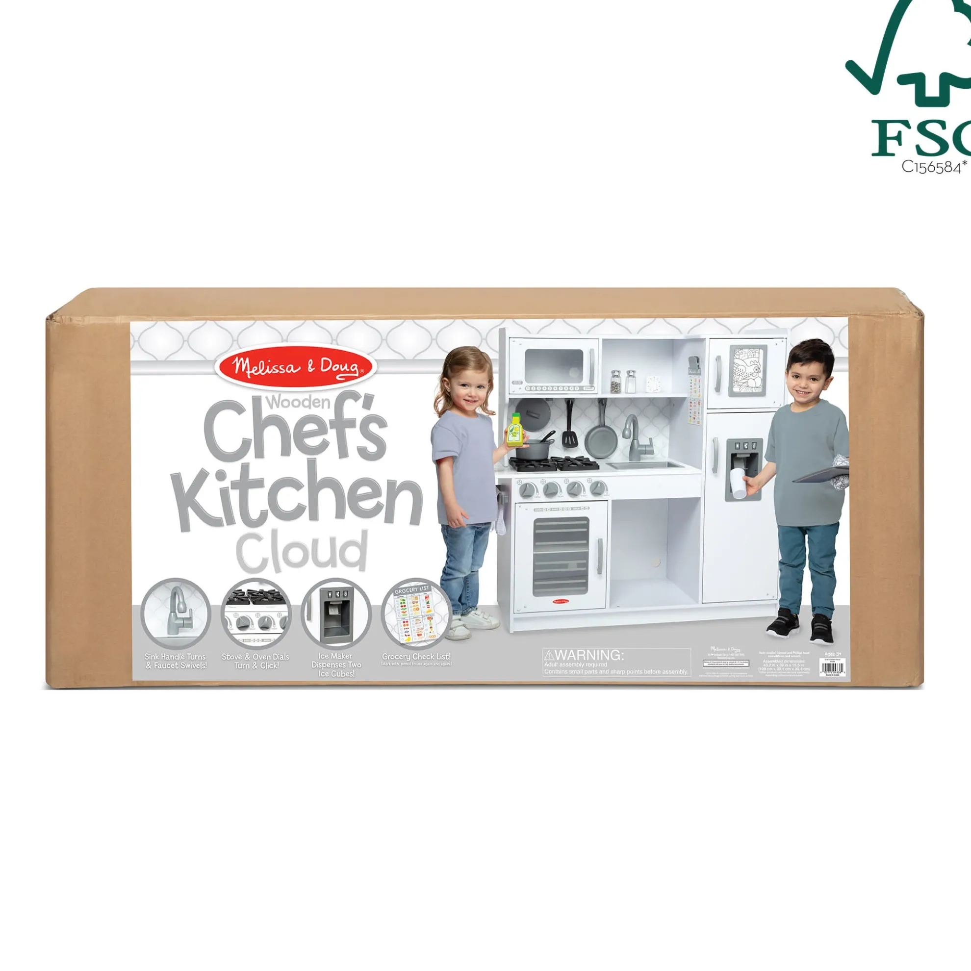 Budding young chefs can hone their craft in this beautifully designed, white marble-colored modern play kitchen! The easy to assemble chef’s kitchen includes a refrigerator/freezer with innovative working ice maker that dispenses two included “ice cubes,” an oven and stovetop with dials that turn, microwave with turning plate, sink with moving faucet and handle, grocery check list, movable hooks, and ample shelving and storage for easy cleanup. Detailed, illustrated instructions make this kitchen simple to put together. Assembled, it stands approximately 3.5 feet (1 meter) long and more than three feet (0.9 meters) high, roomy enough for multiple kids to play at once. Sturdy, top-quality wooden construction means it will stand up to years of creative make-believe meal-making! This product is certified by the Forest Stewardship Council. FSC certification ensures that products come from responsibly managed forests that provide environmental, social, and economic benefits, and that forests are protected for future generations. Please note that FSC certification applies to new inventory only (FSC C156584)
