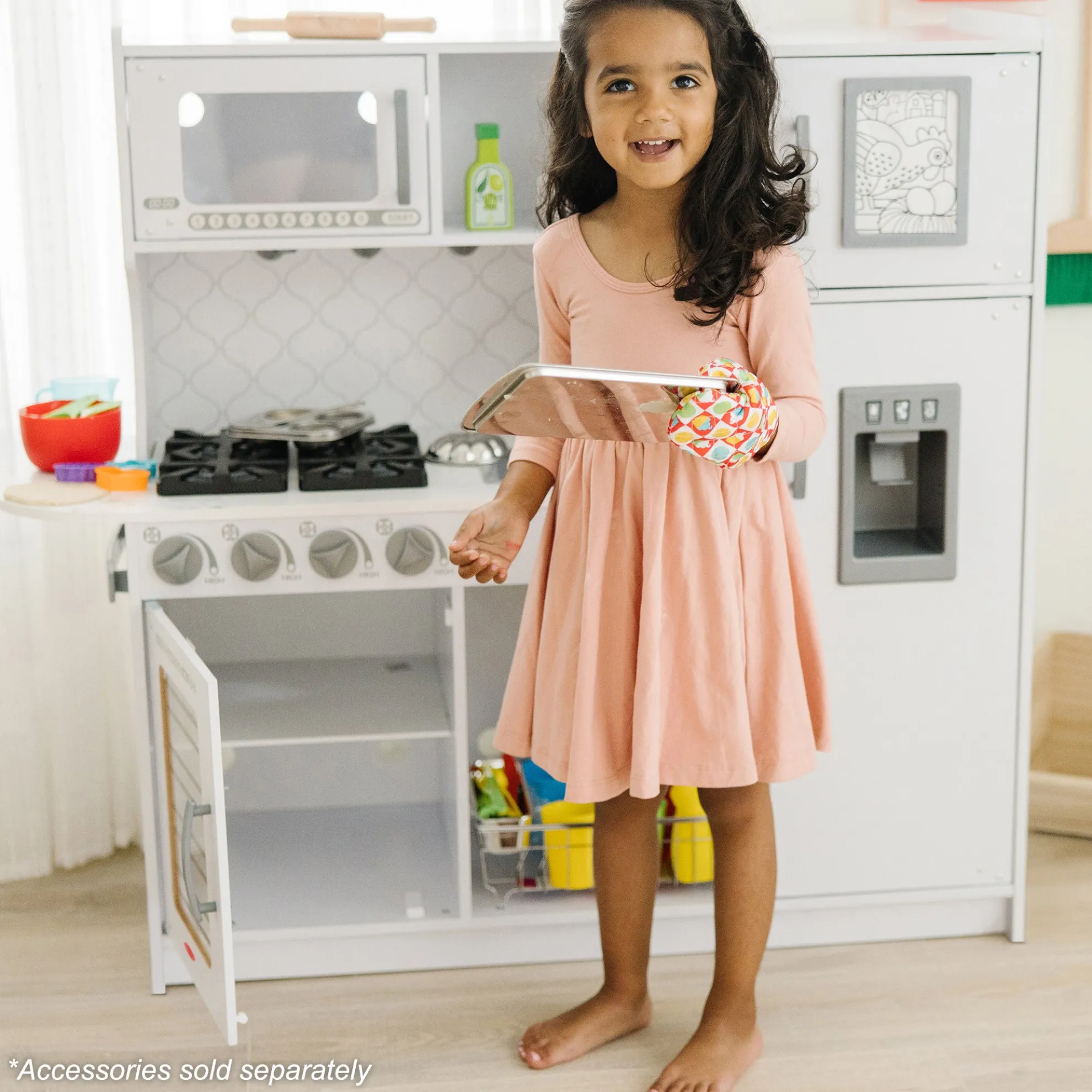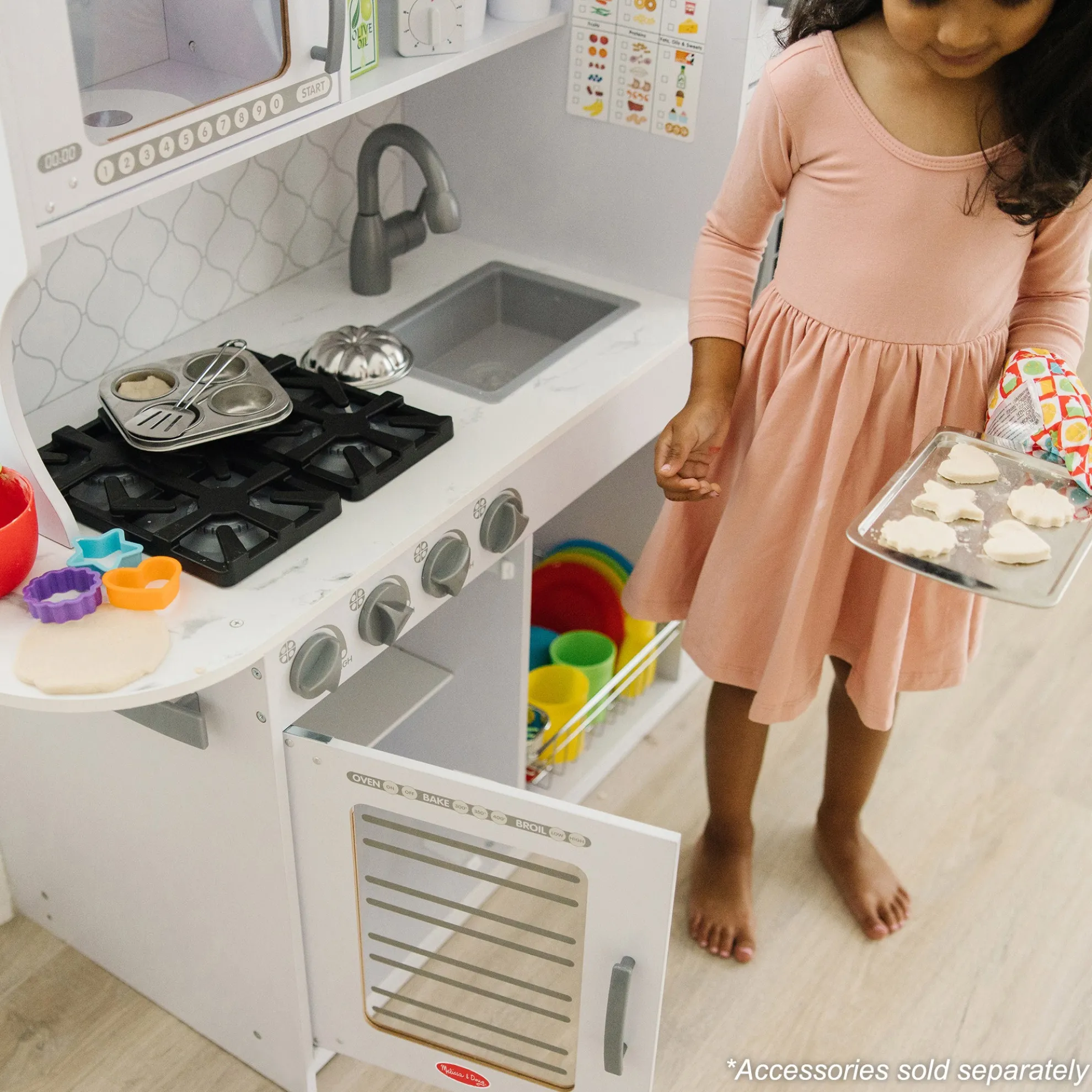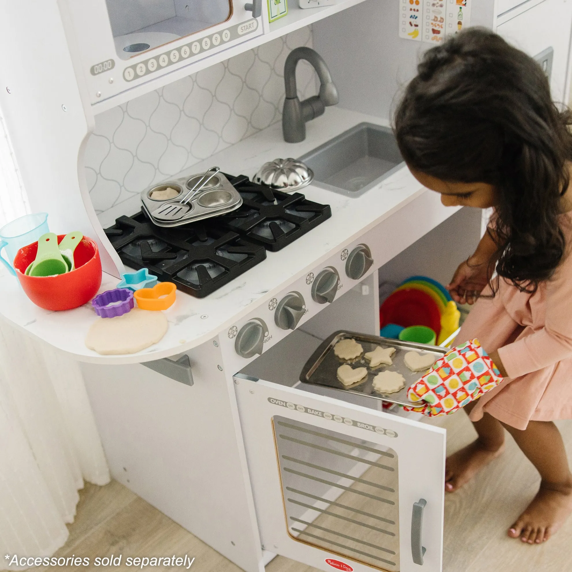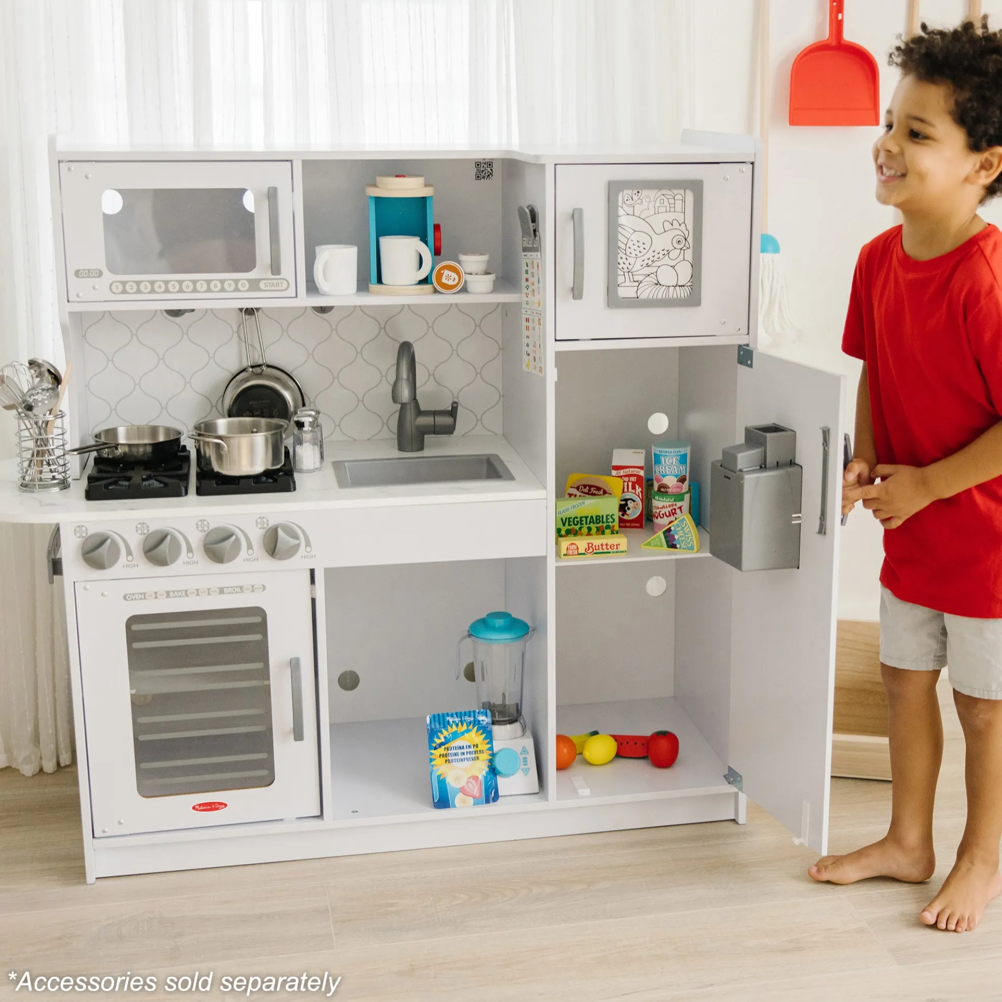 - Easy to assemble white marble-colored wooden modern play kitchen–roomy enough for multiple kids to play at once