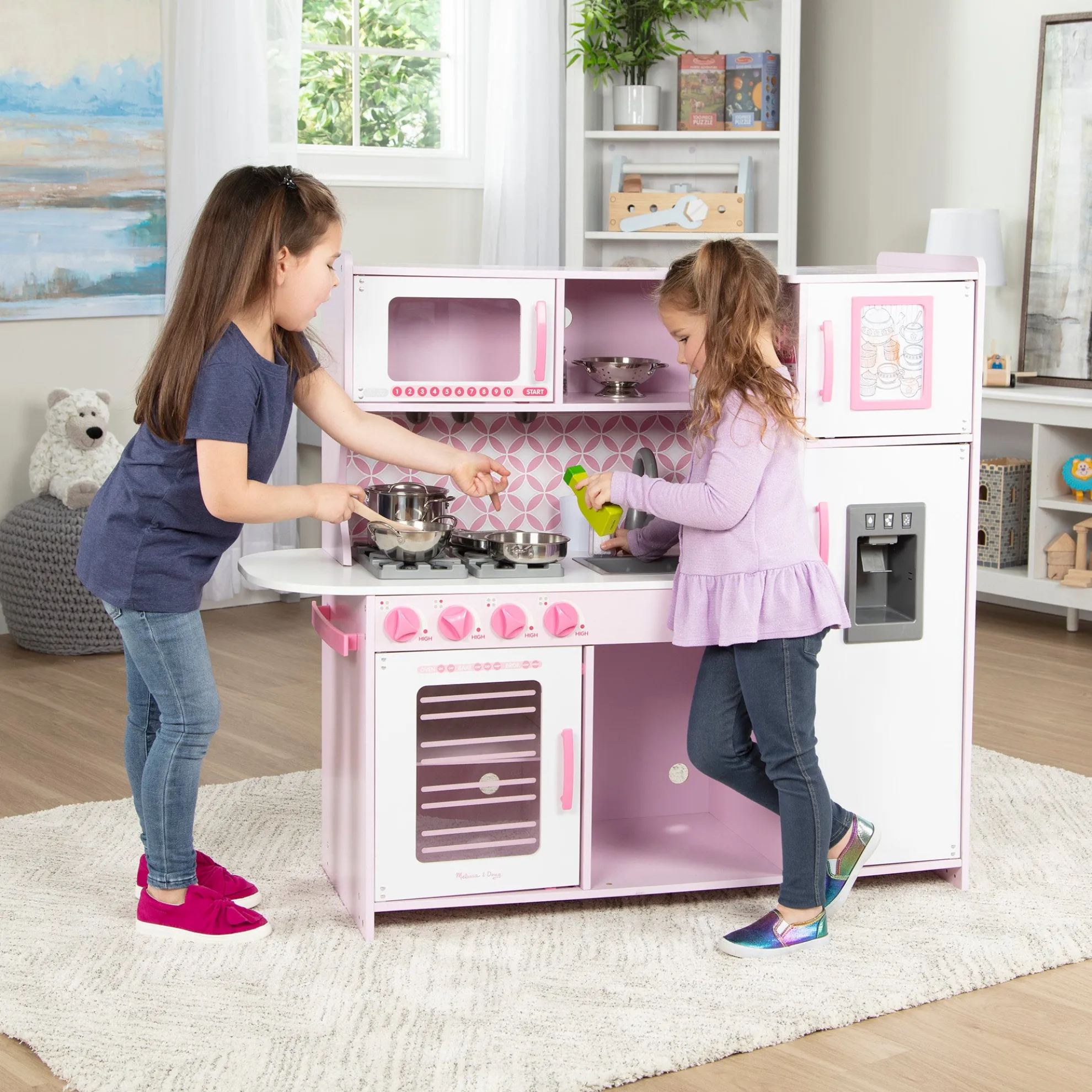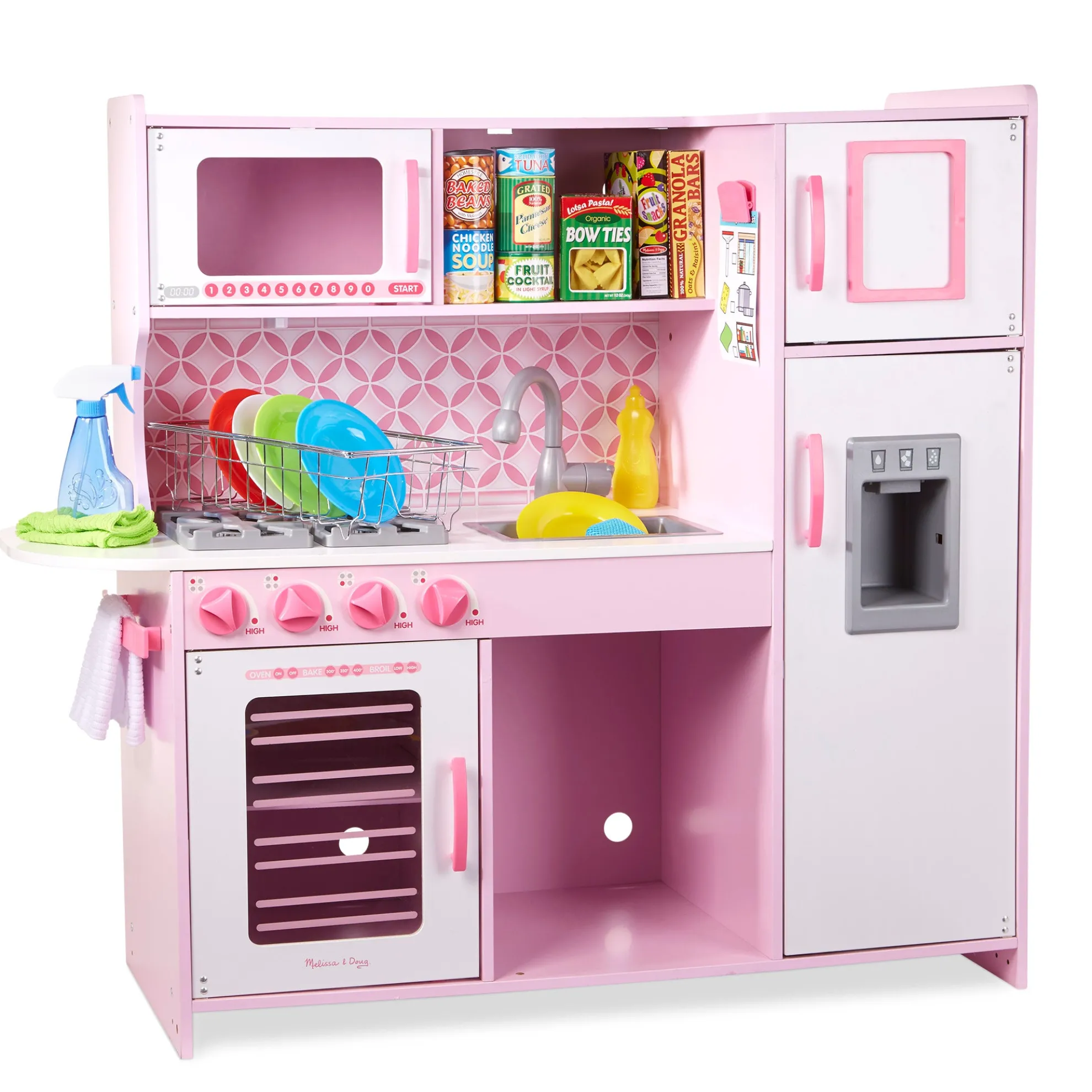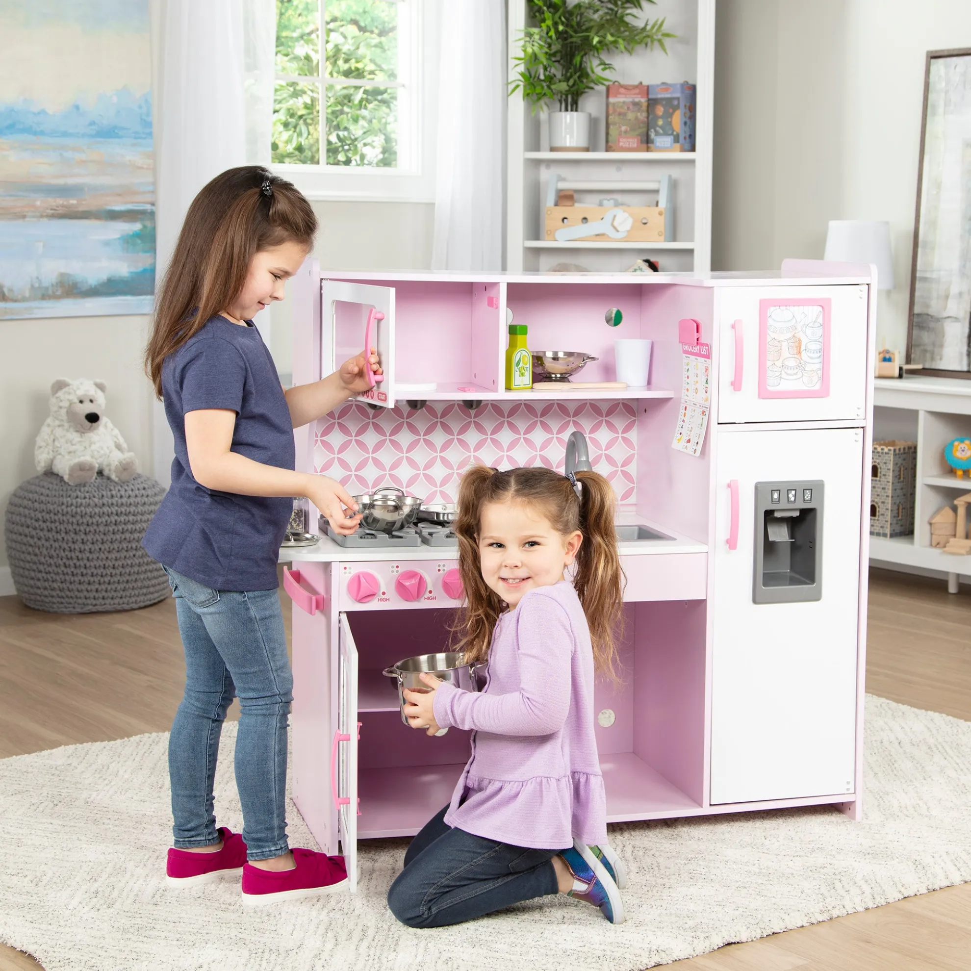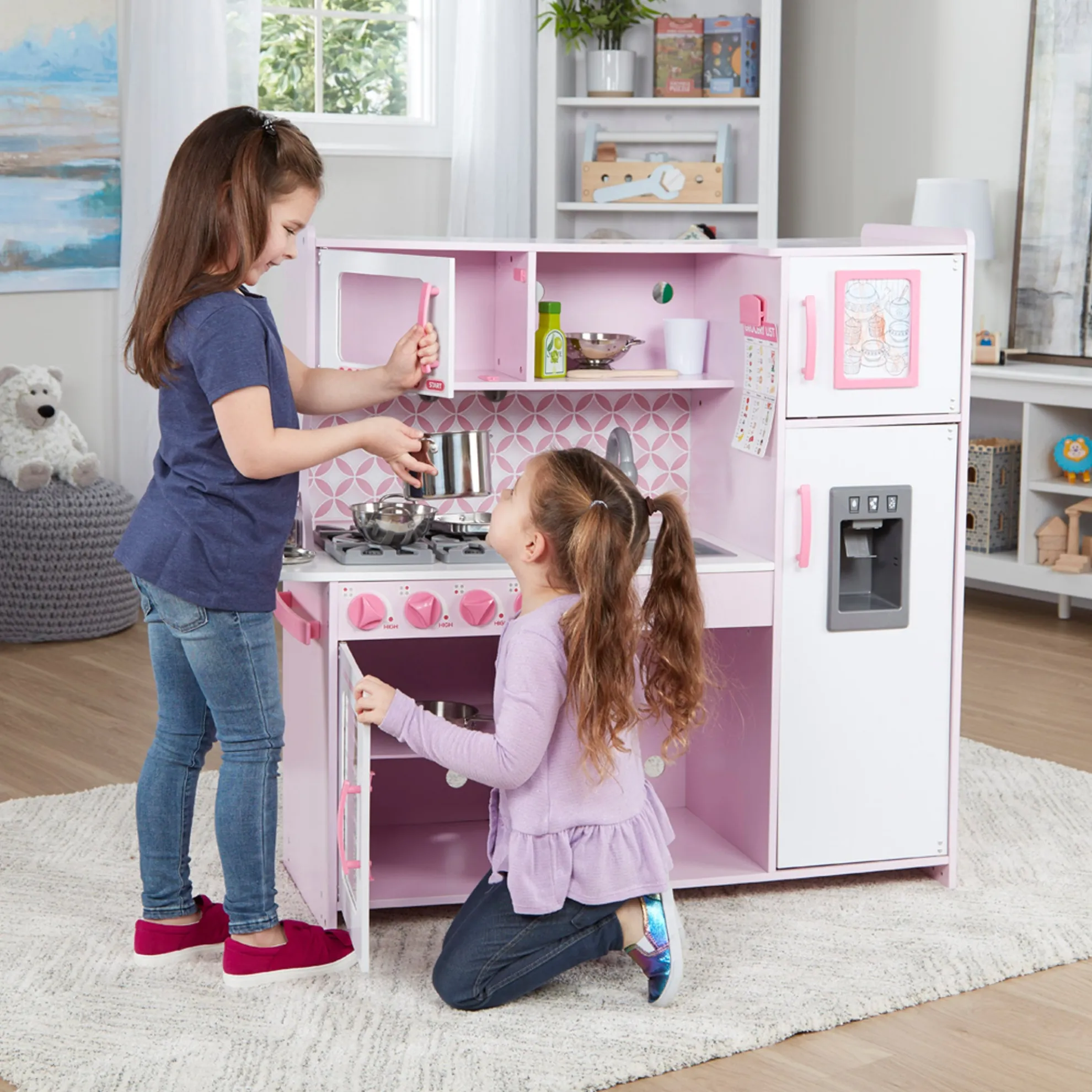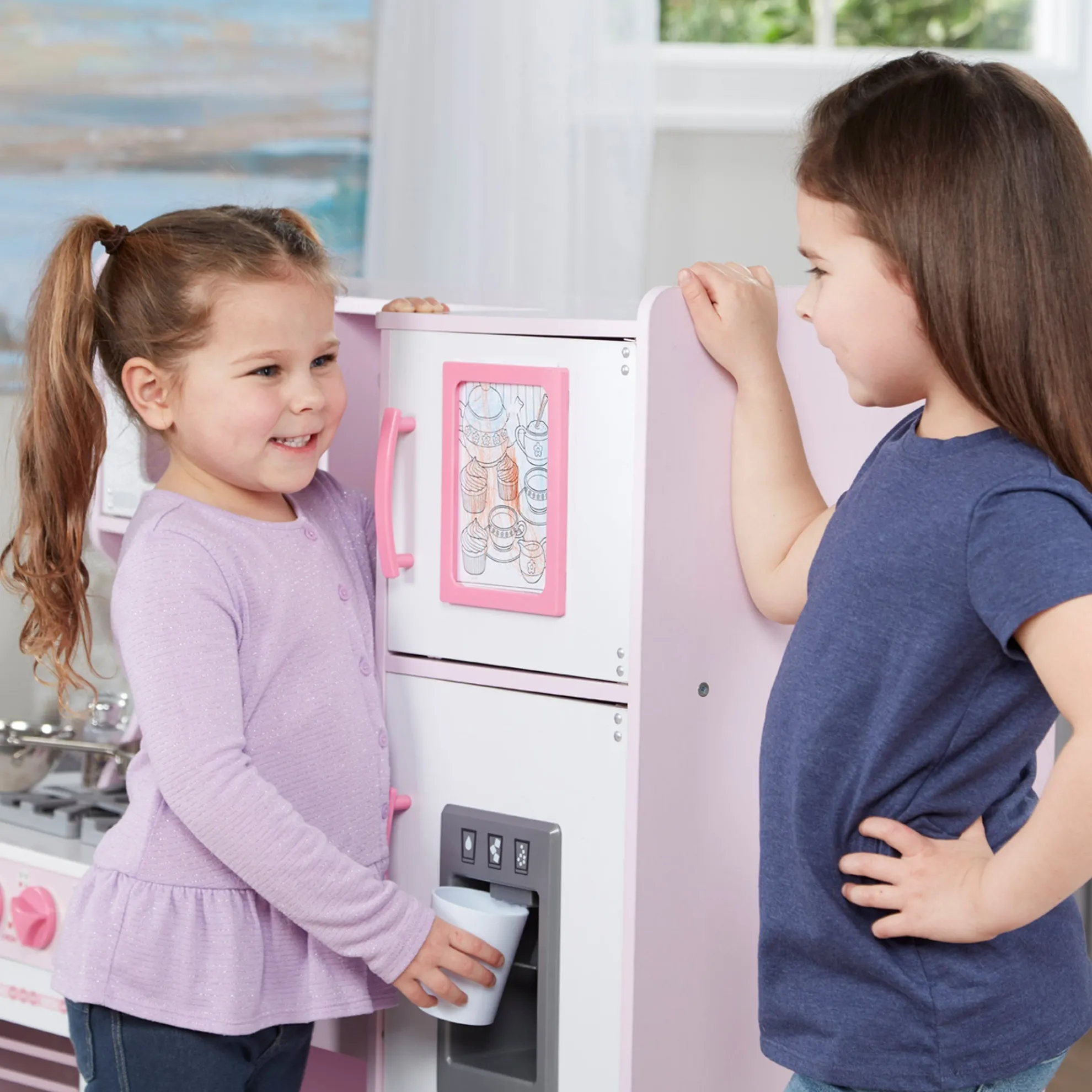 - Easy to assemble pink wooden modern play kitchen–roomy enough for multiple kids to play at once