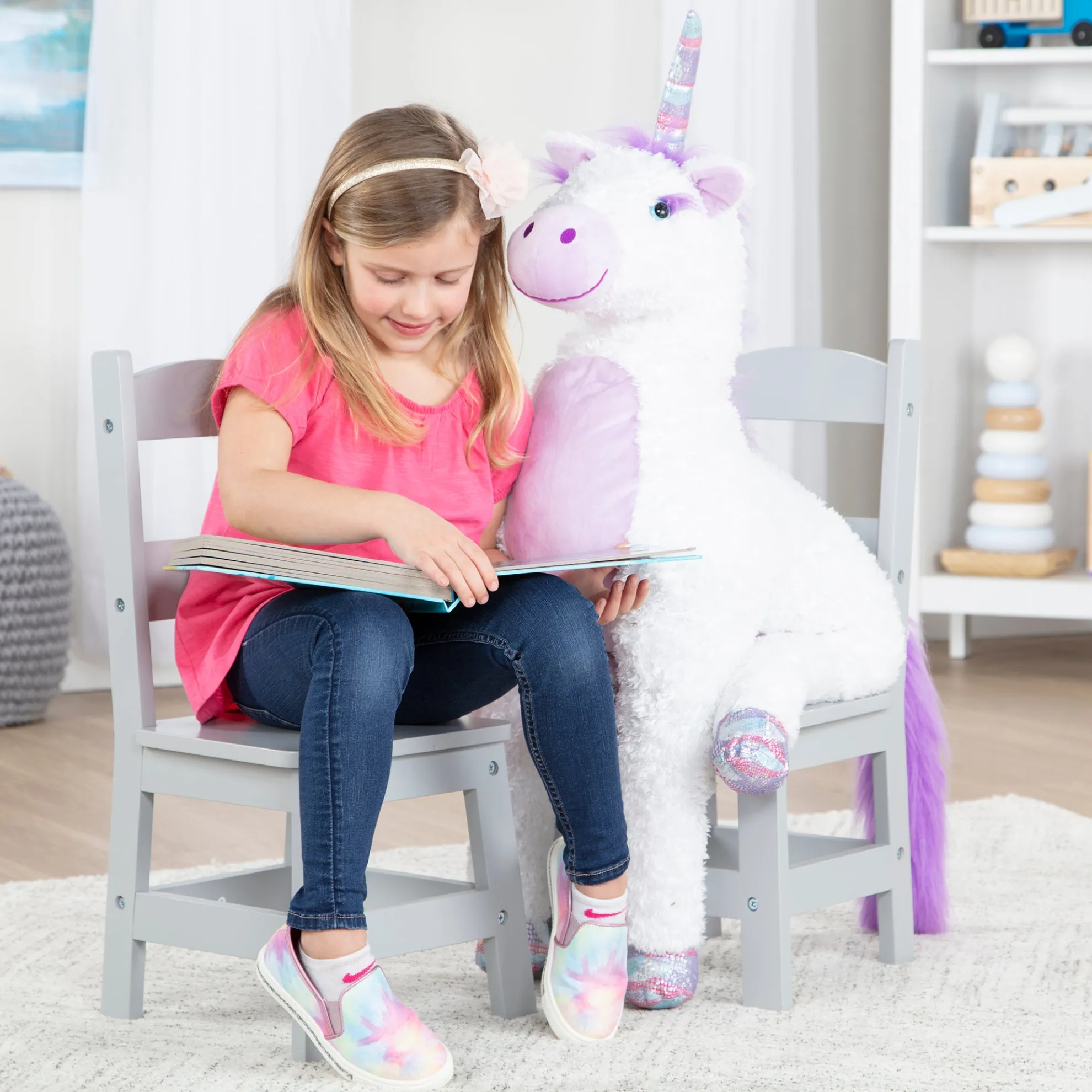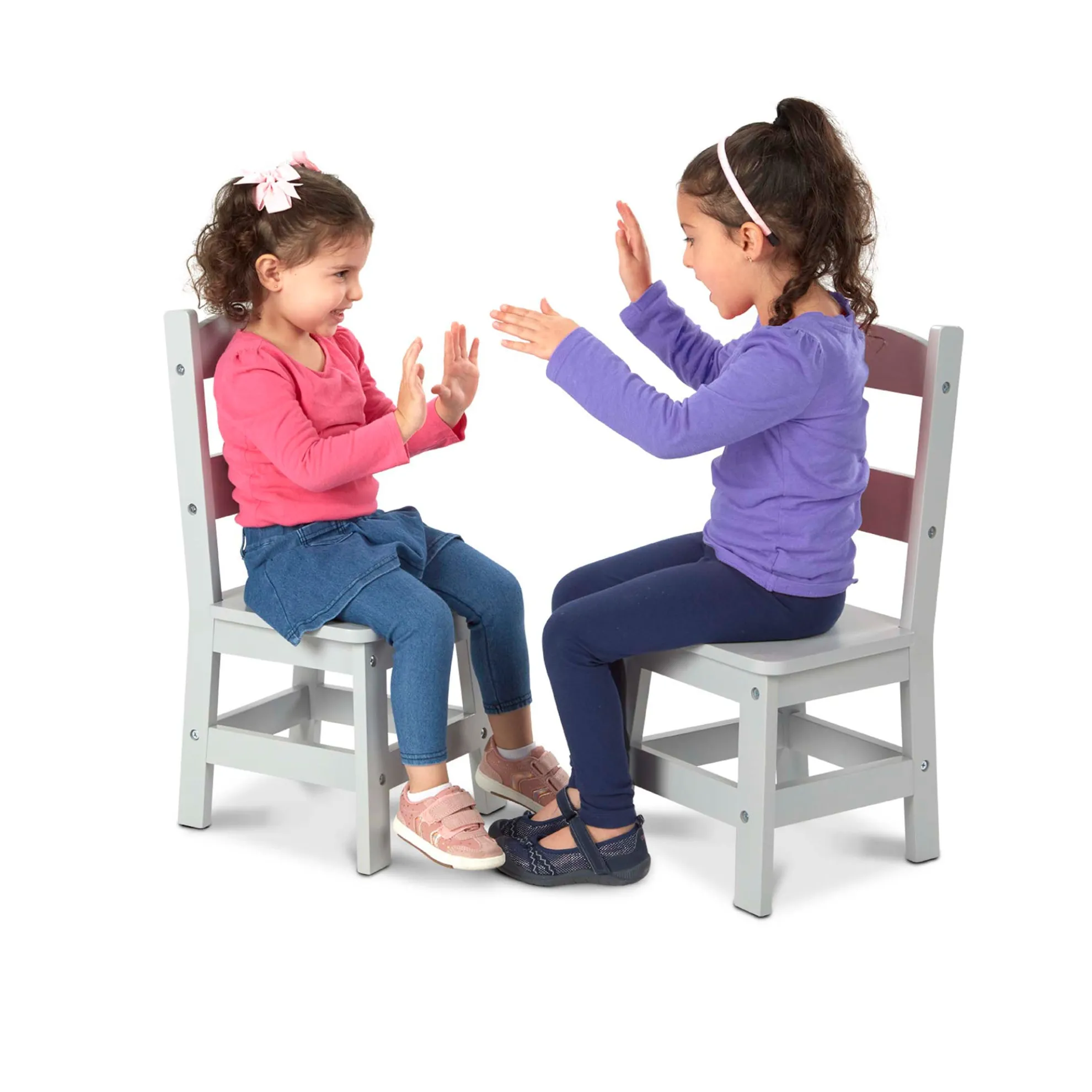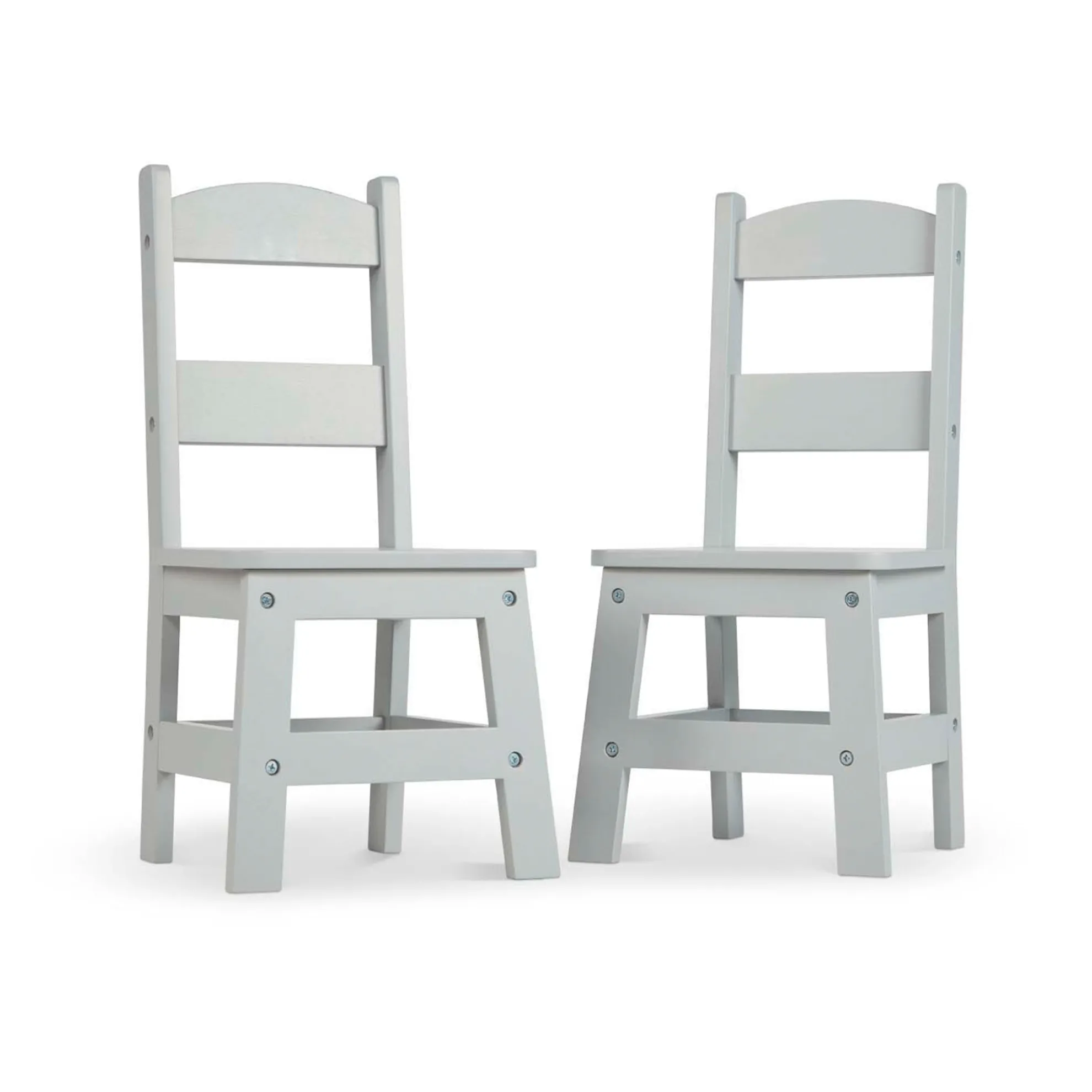 These two easy-to-assemble hardwood chairs have an 11-inch seat height that’s comfy for kids and holds up to 100 pounds! The chairs have a modern cool gray finish to fit with any home décor, and wipe clean to stay looking crisp and clean. Add them to the Melissa & Doug Table & 2 Chairs Set to make room for a foursome, or use them on their own to create a child-friendly seating nook for two! Detailed illustrated instructions make it easy to assemble with just a Phillips-head screwdriver (not included). Chairs are tested to the most stringent of children’s furniture standards.