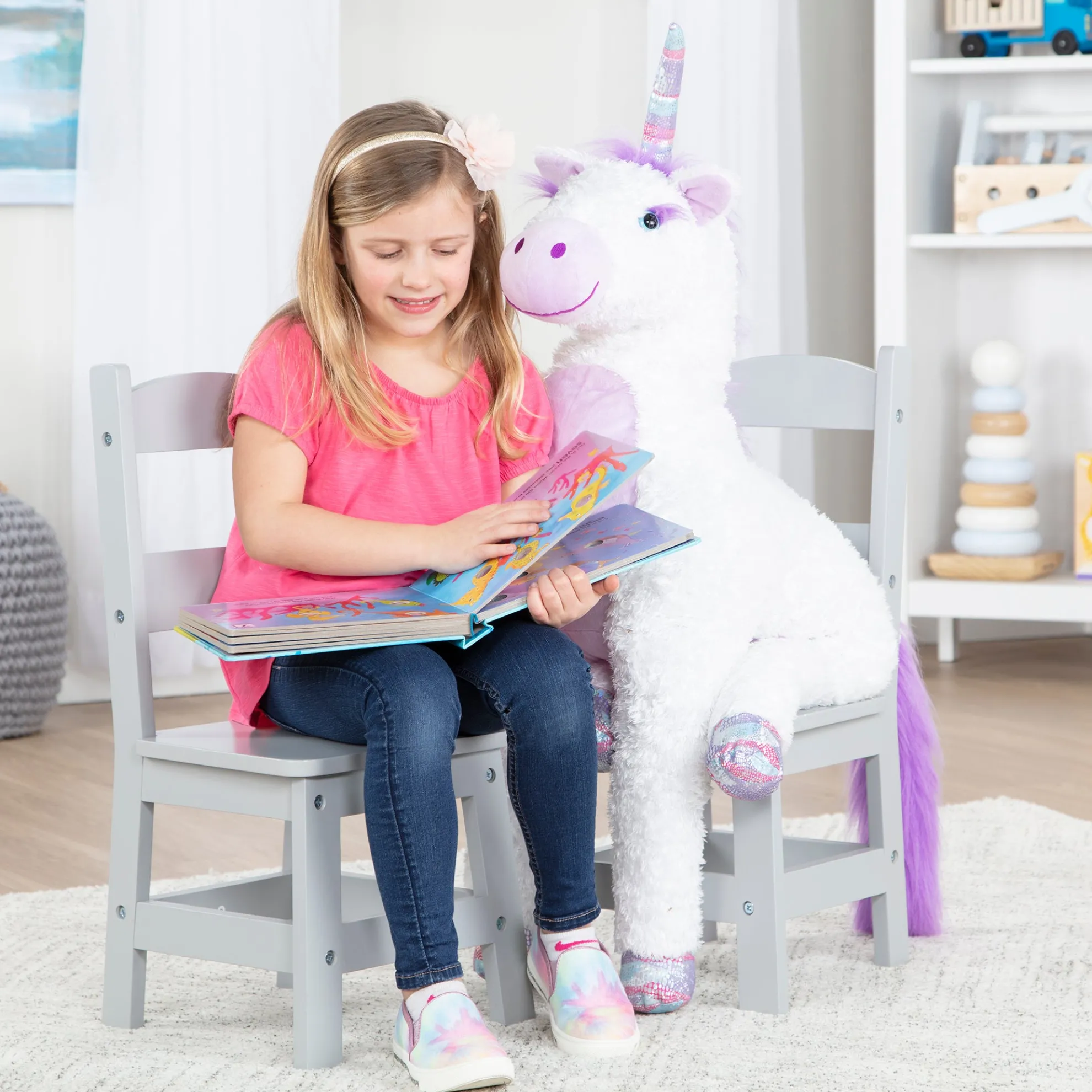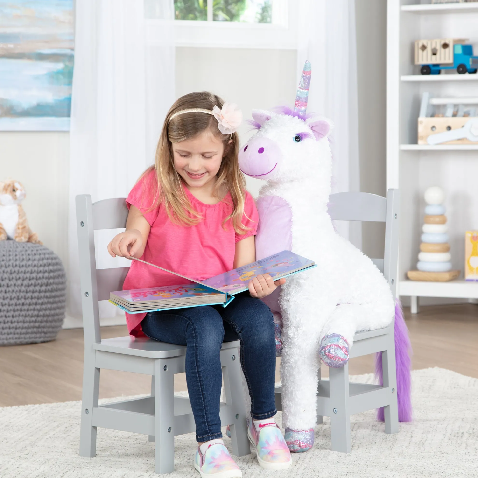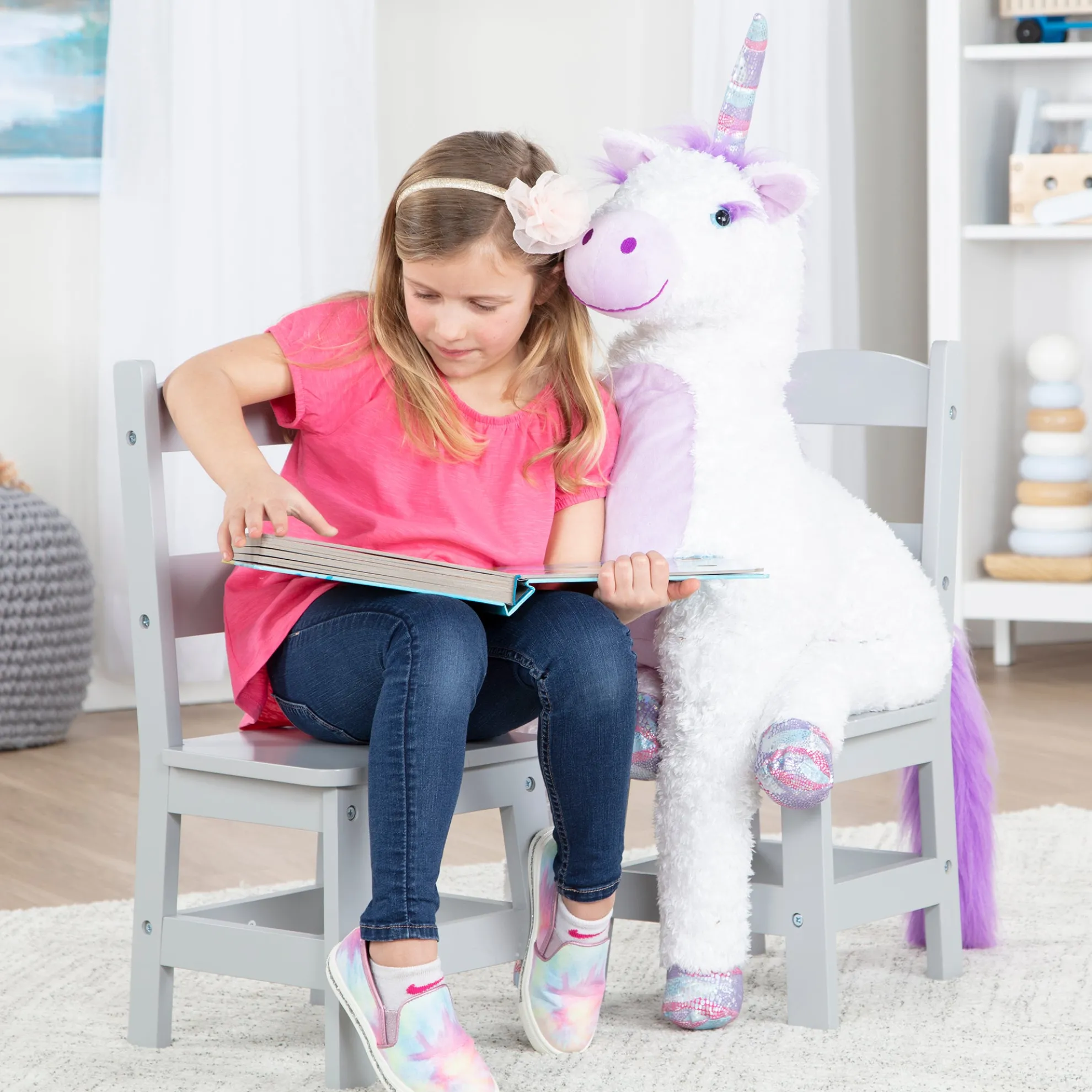 These two easy-to-assemble hardwood chairs have an 11-inch seat height that’s comfy for kids and holds up to 100 pounds! The chairs have a modern cool gray finish to fit with any home décor, and wipe clean to stay looking crisp and clean. Add them to the Melissa & Doug Table & 2 Chairs Set to make room for a foursome, or use them on their own to create a child-friendly seating nook for two! Detailed illustrated instructions make it easy to assemble with just a Phillips-head screwdriver (not included). Chairs are tested to the most stringent of children’s furniture standards.
