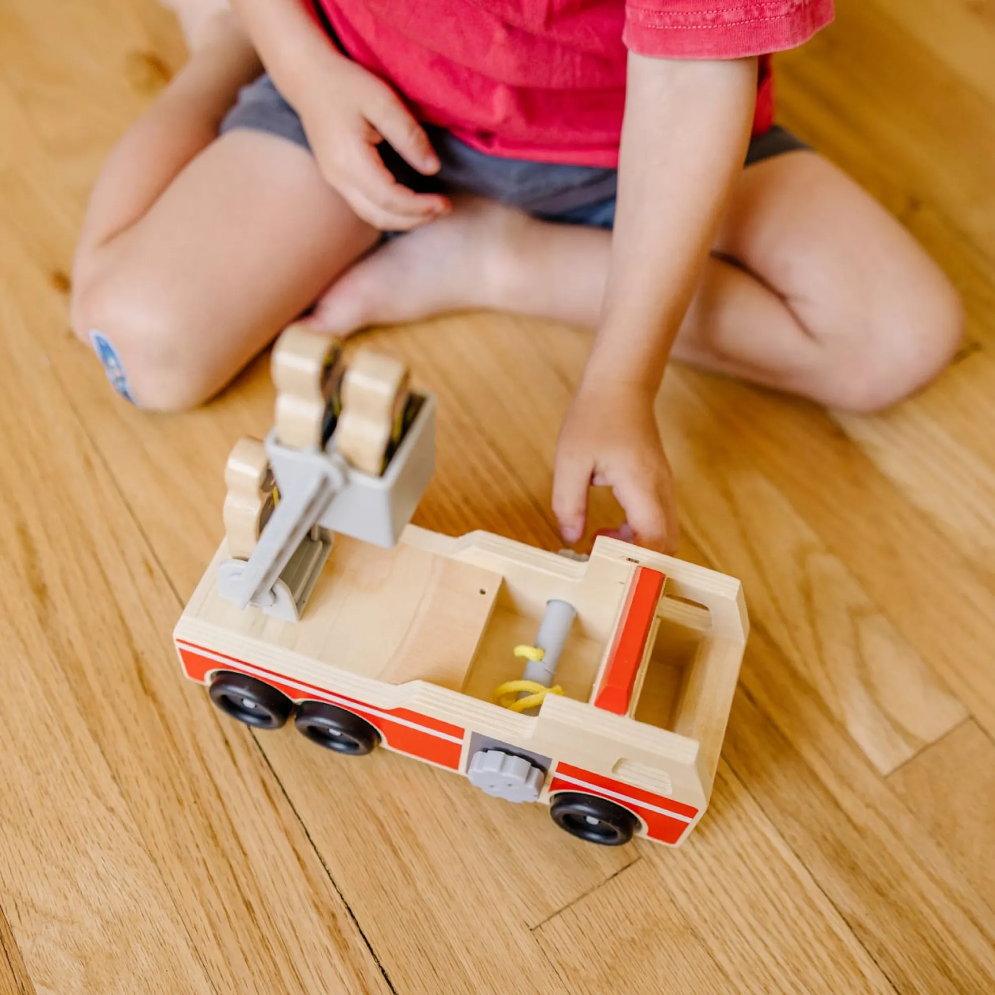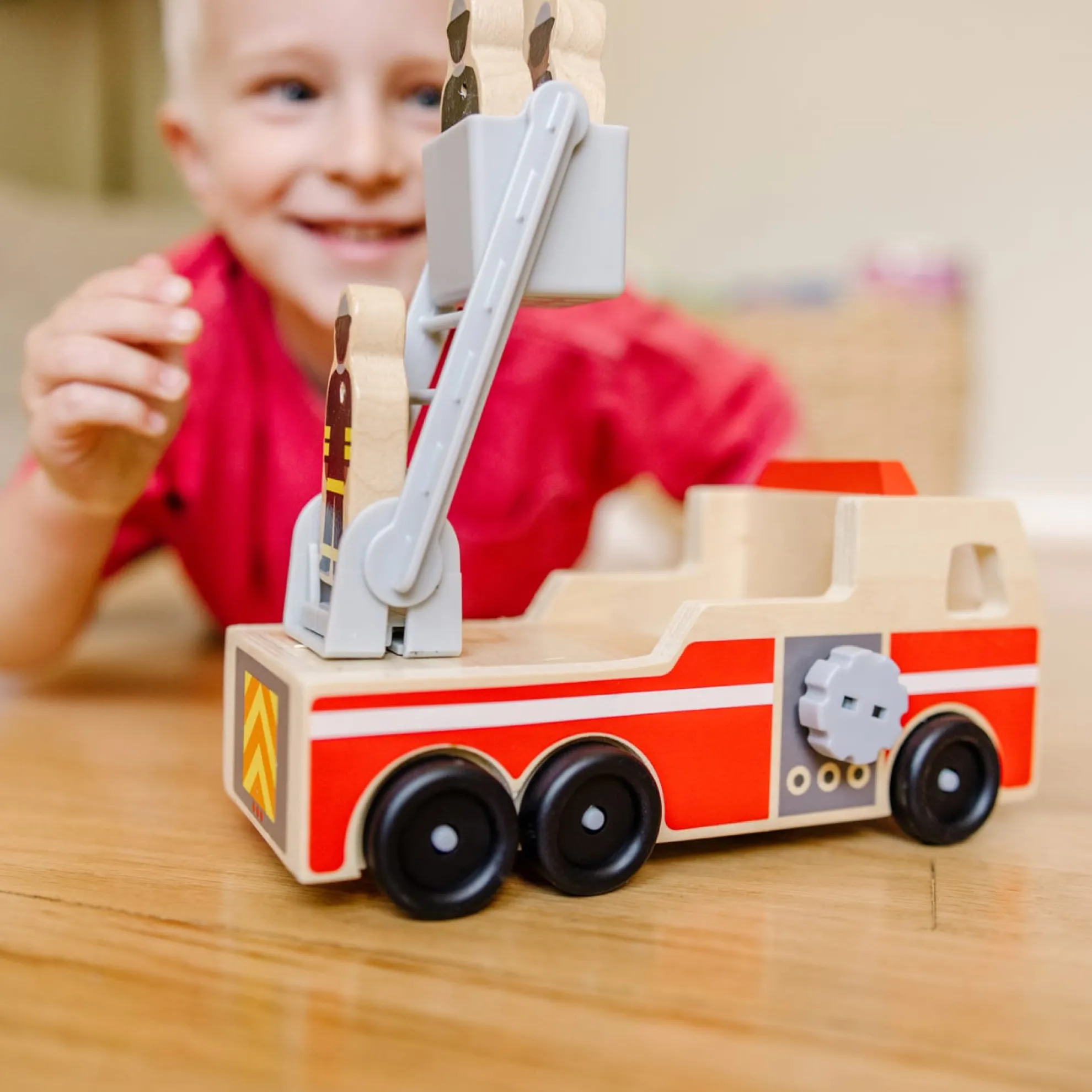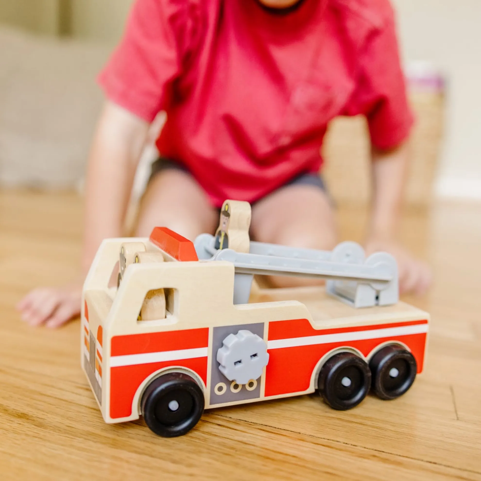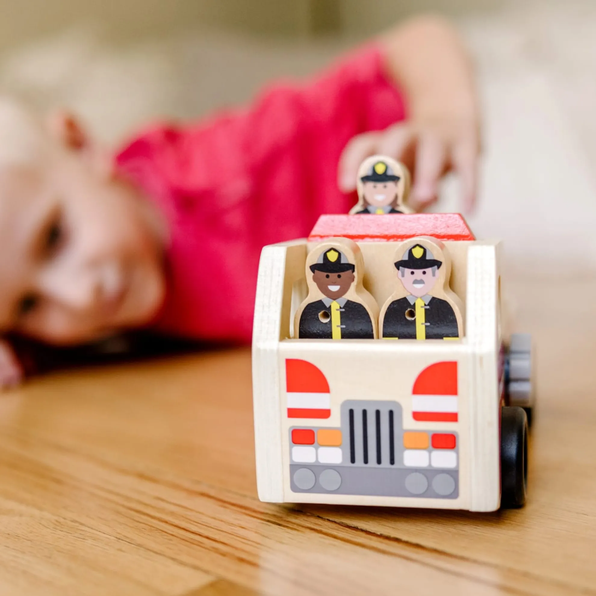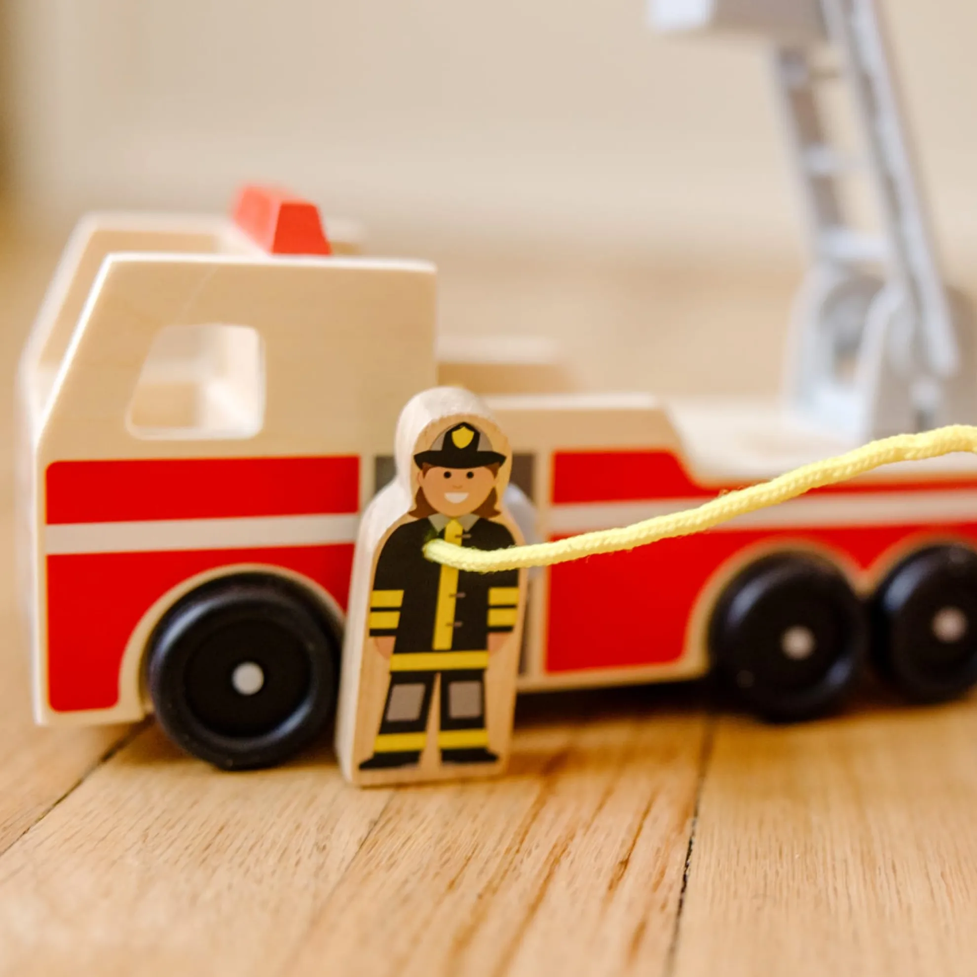 - Includes 4 high-quality wooden pieces–fire truck and 3 firefighters.