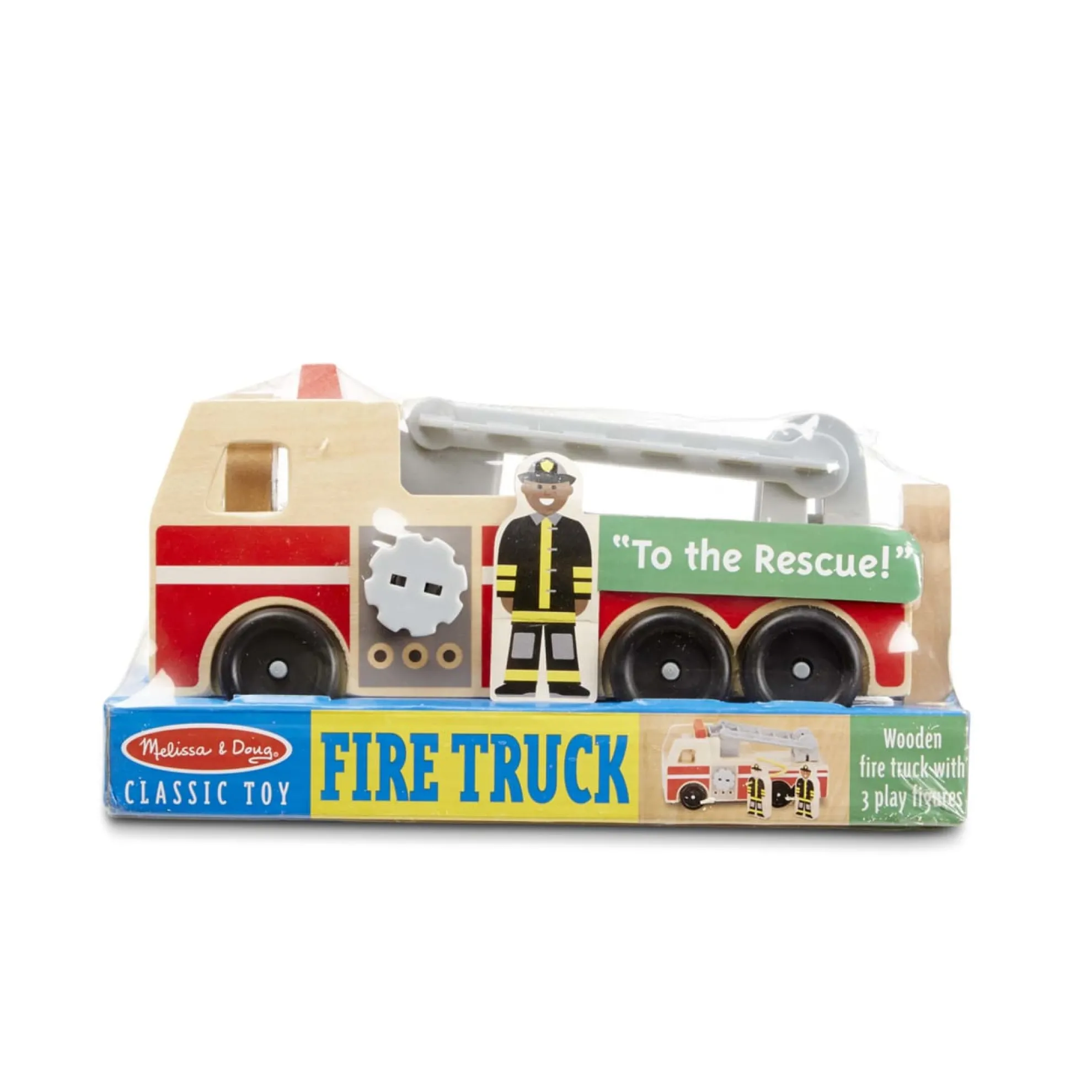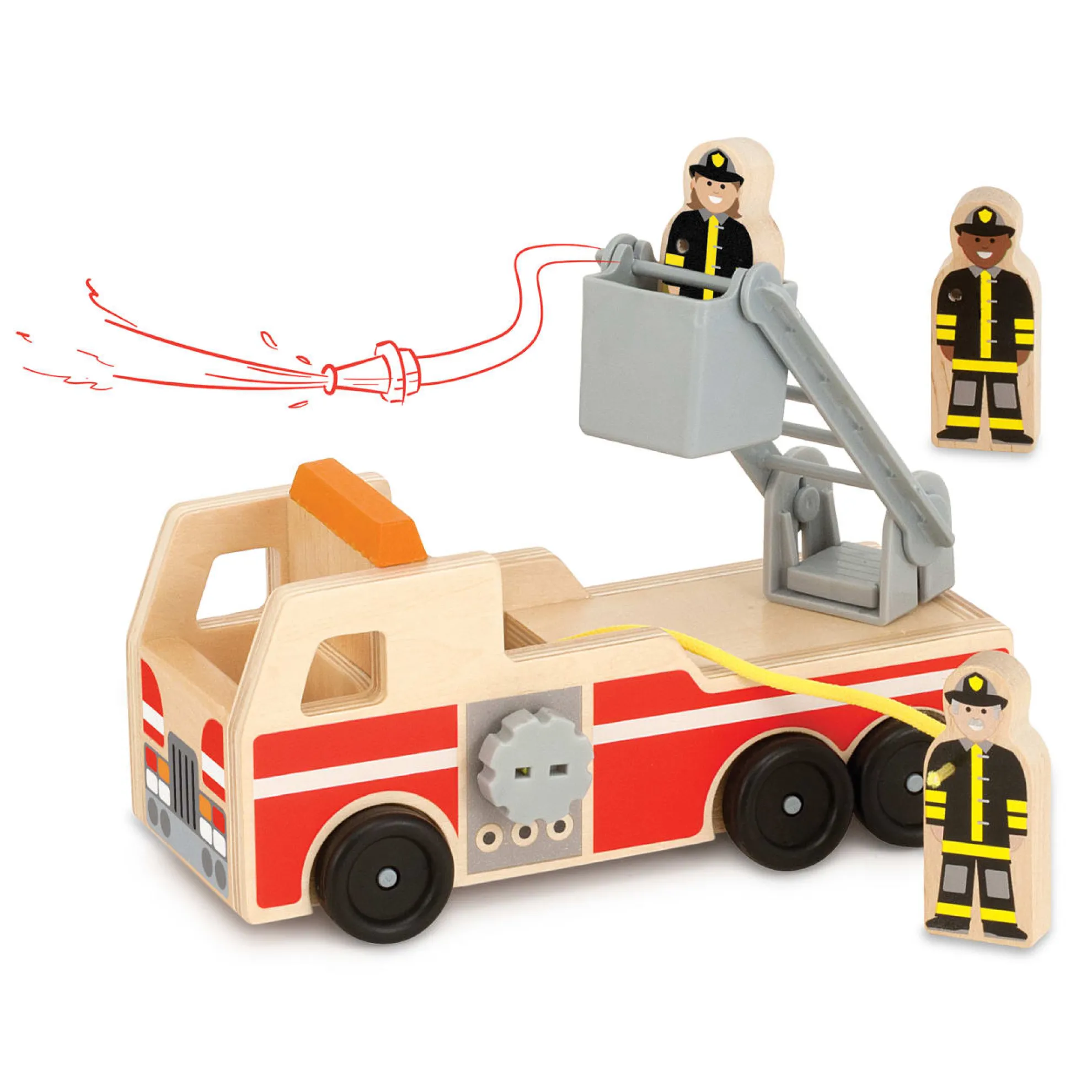 Young heroes will love helping the firefighters lift the ladder, unroll the hose, and save the day! This play set includes a wooden fire truck with roll-up hose and lifting bucket ladder, plus three solid-wood play figures who can ride in the front, stand in the bucket, and even hold the hose. Durable wooden construction and classic styling mean this sturdy play set will be rescuing playtimes for years to come!