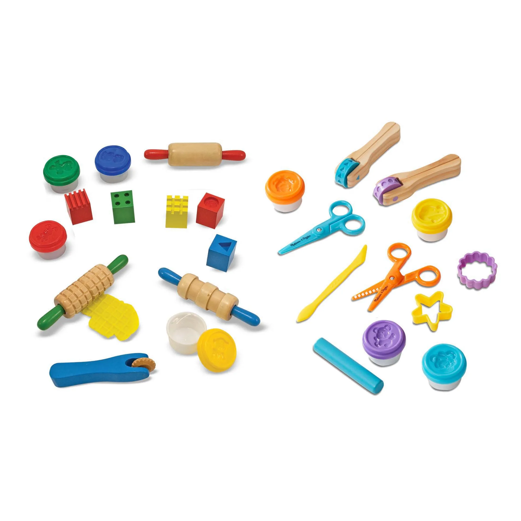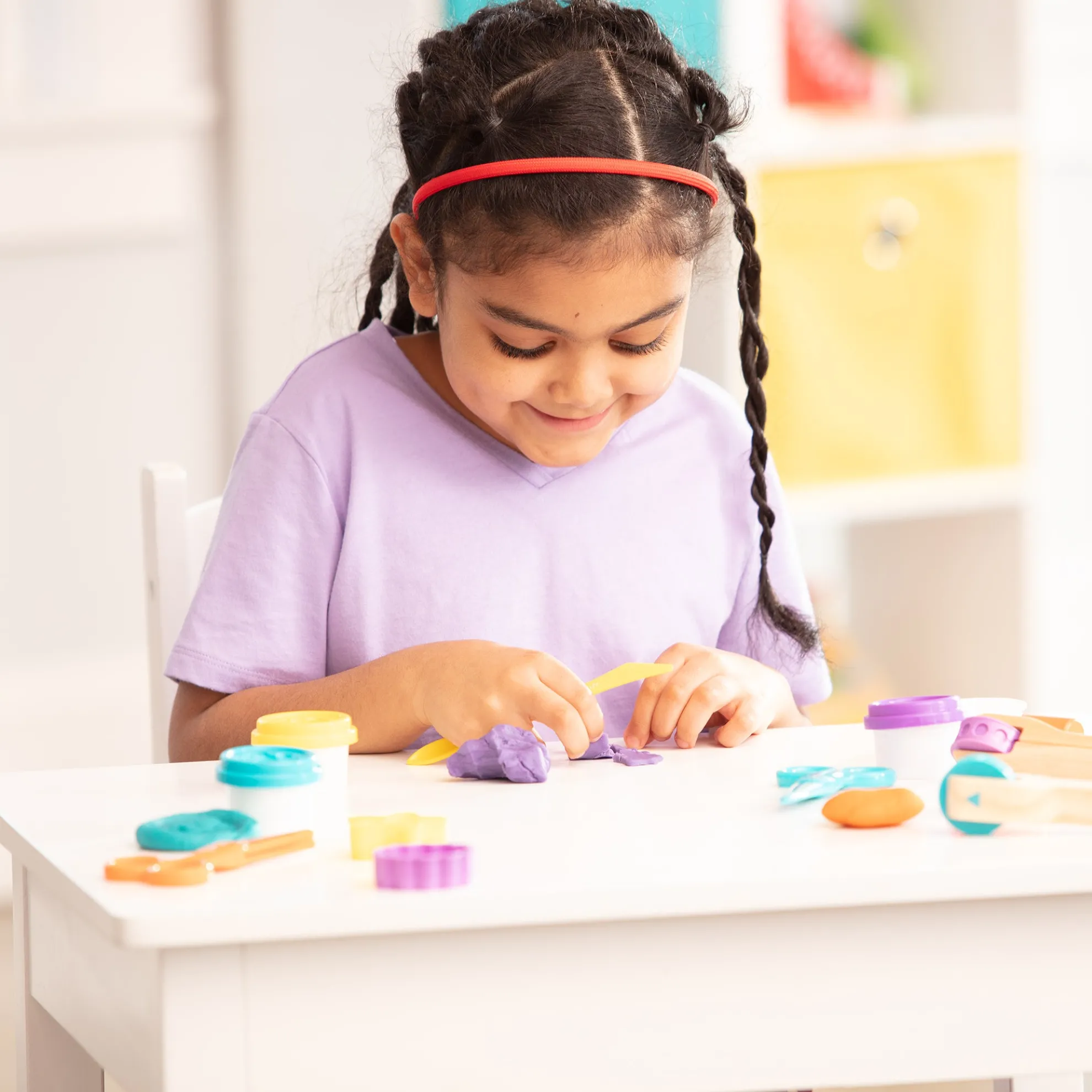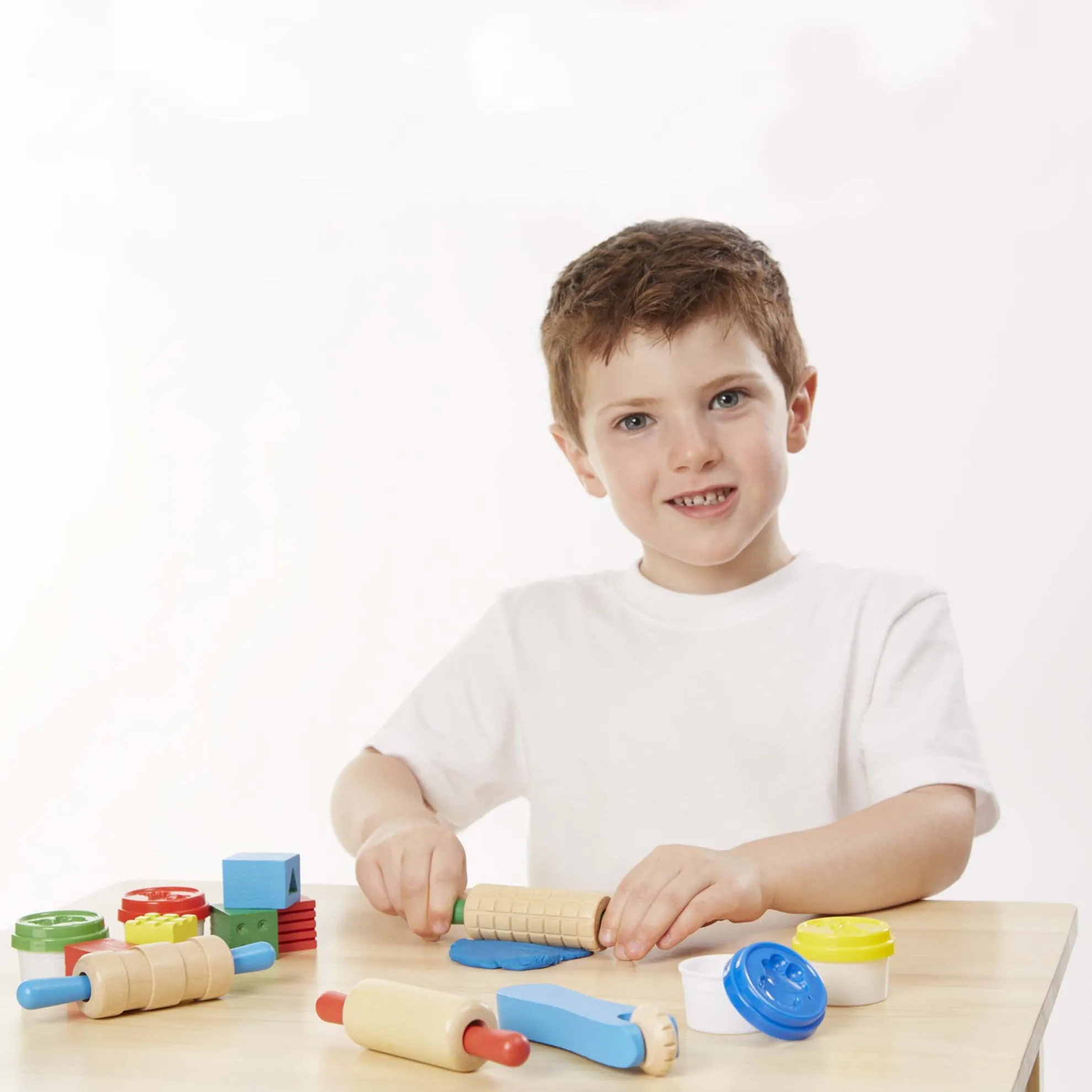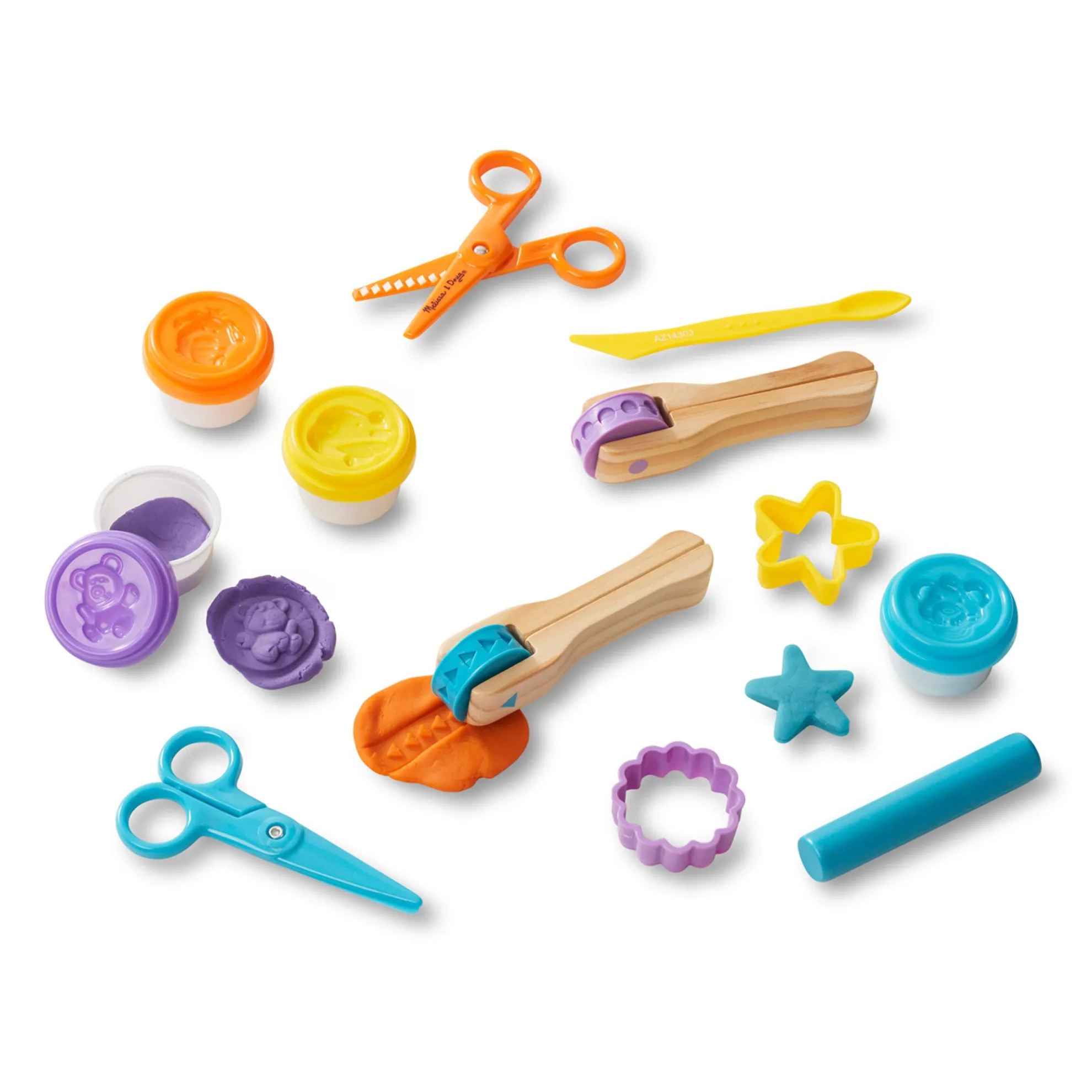 Let the good times roll! Featuring exciting tools and vibrantly colored modeling dough, these two sets invite children to cut different shapes with zigzag and straight scissors, sculpt circles and triangles with pattern wheels and patterned rolling pins, and mold adorable figures by turning over the covered tubs and pressing. Each set comes with four tubs of dough (red, yellow, blue, and green in one and purple, orange, yellow, and blue in the other) with different patterns on all the lids. There are eight sculpting tools in one set and nine in the other for endless way to sculpt, shape, mold, and more!