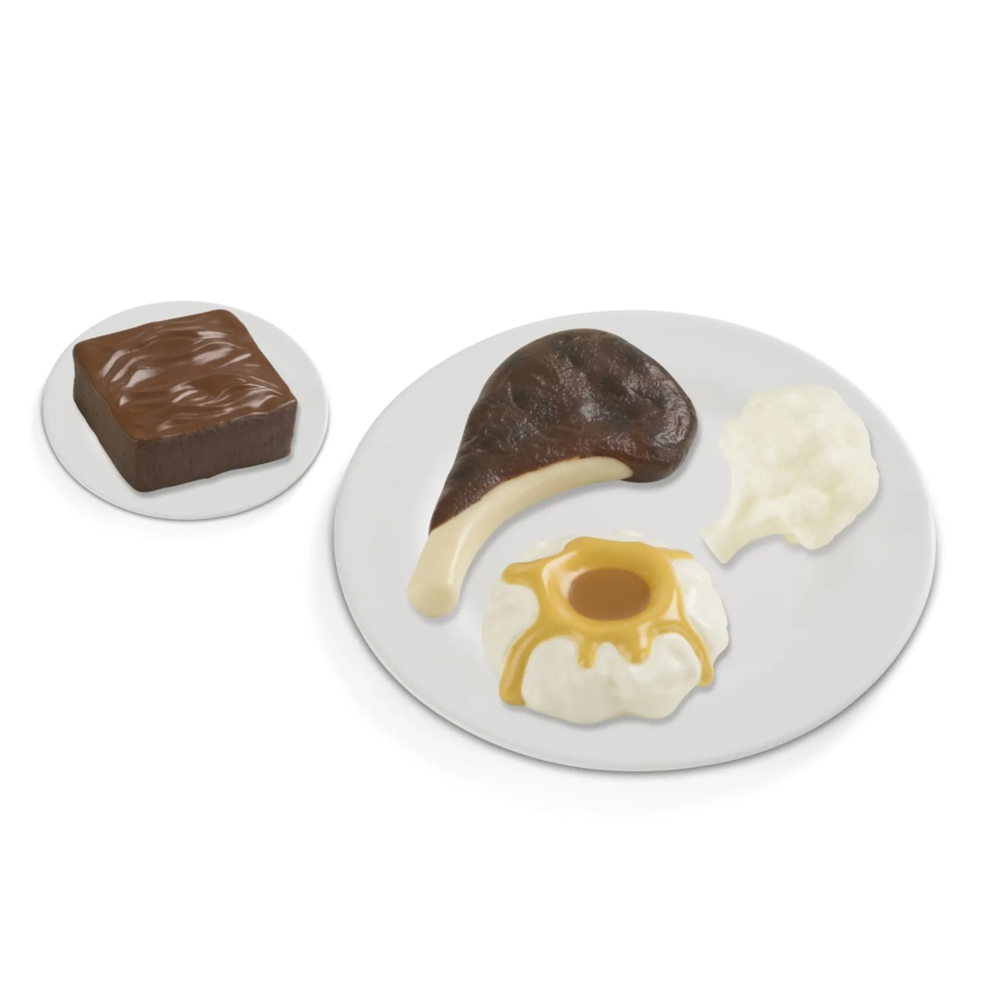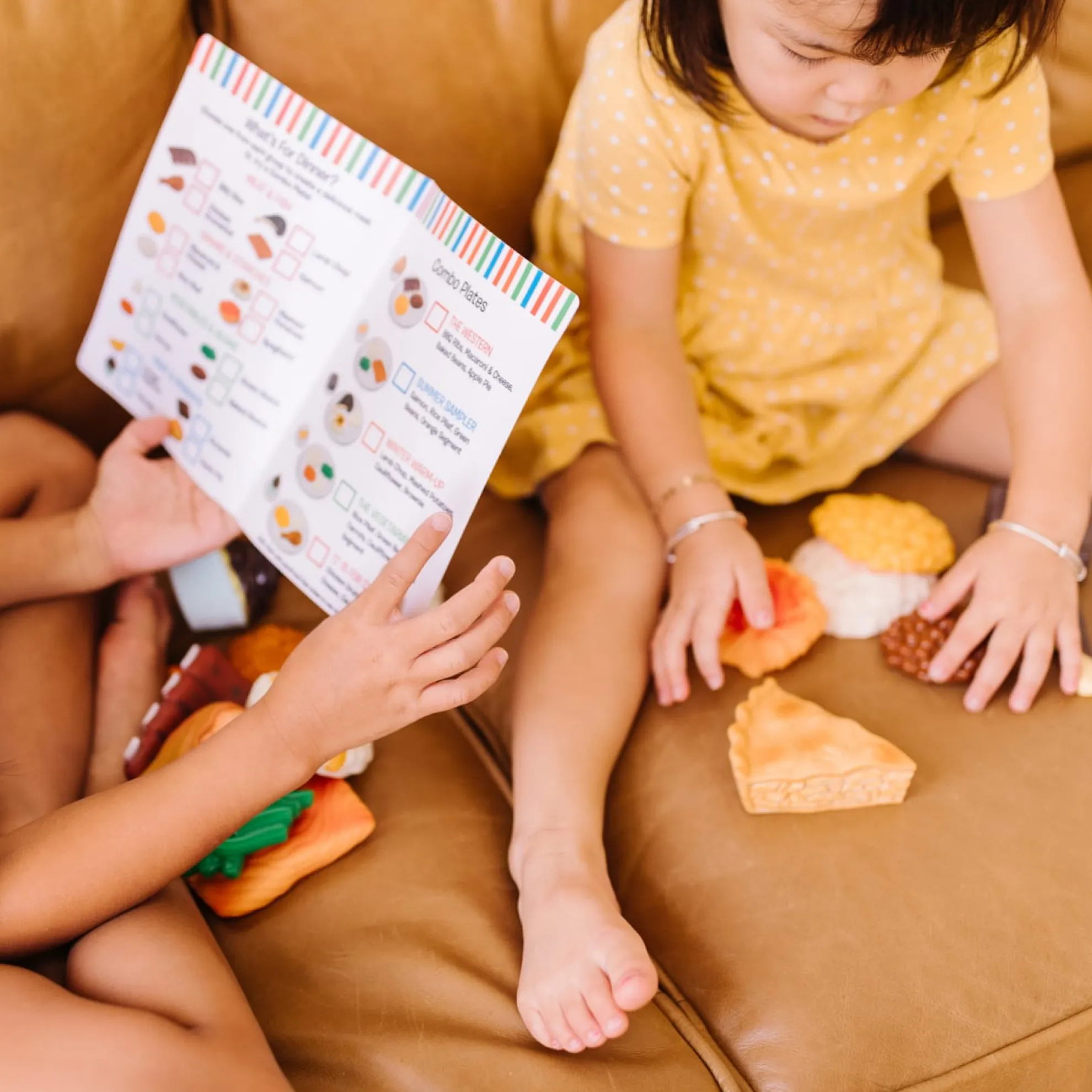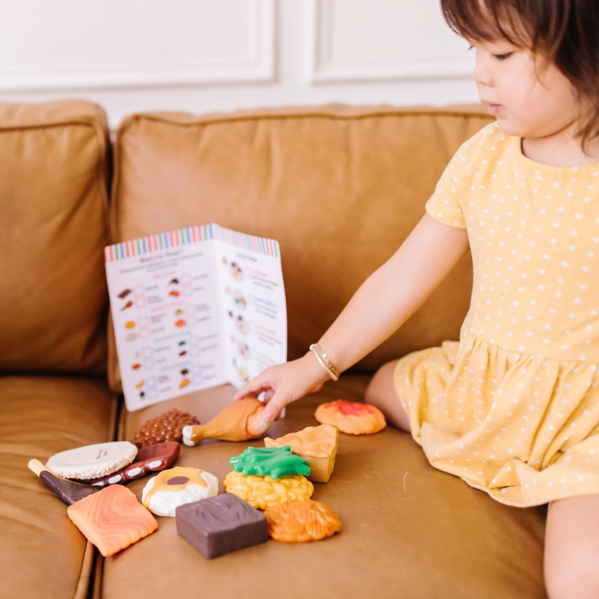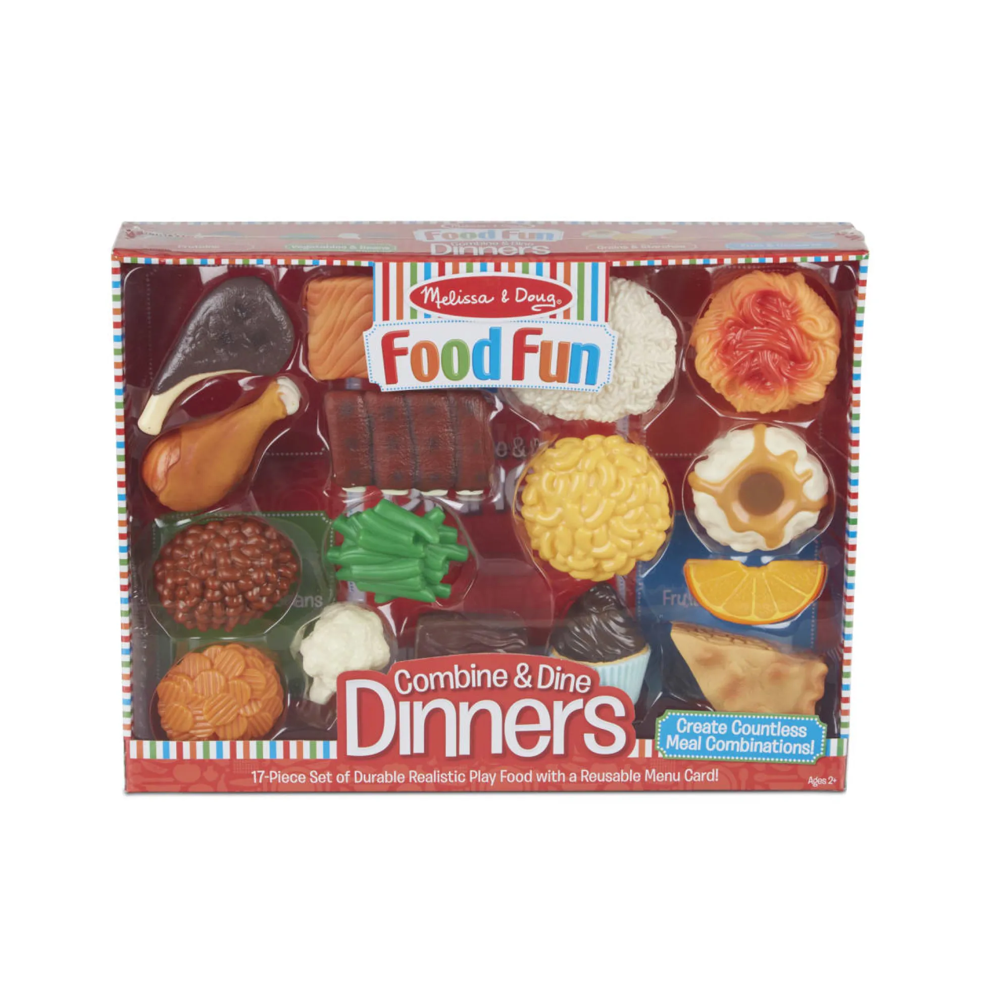 Satisfy hungry imaginations with this 17-piece set of durable realistic play food! Kids three and older will make memorable make-believe meals with the solid, realistically detailed food pieces, while also learning about nutrition and the importance of making and eating balanced meals. Combine & Dine includes proteins (BBQ ribs, a chicken drumstick, lamb chop, salmon filet), grains and starches (mac and cheese, mashed potatoes, spaghetti, rice pilaf), vegetables and beans (cauliflower, green beans, baked beans, and sliced carrots), and desserts (cupcake, orange segment, brownie, apple pie), as well as a four-sided menu and information card. This playful food set lets young foodies create countless combinations to serve well-balanced fun!