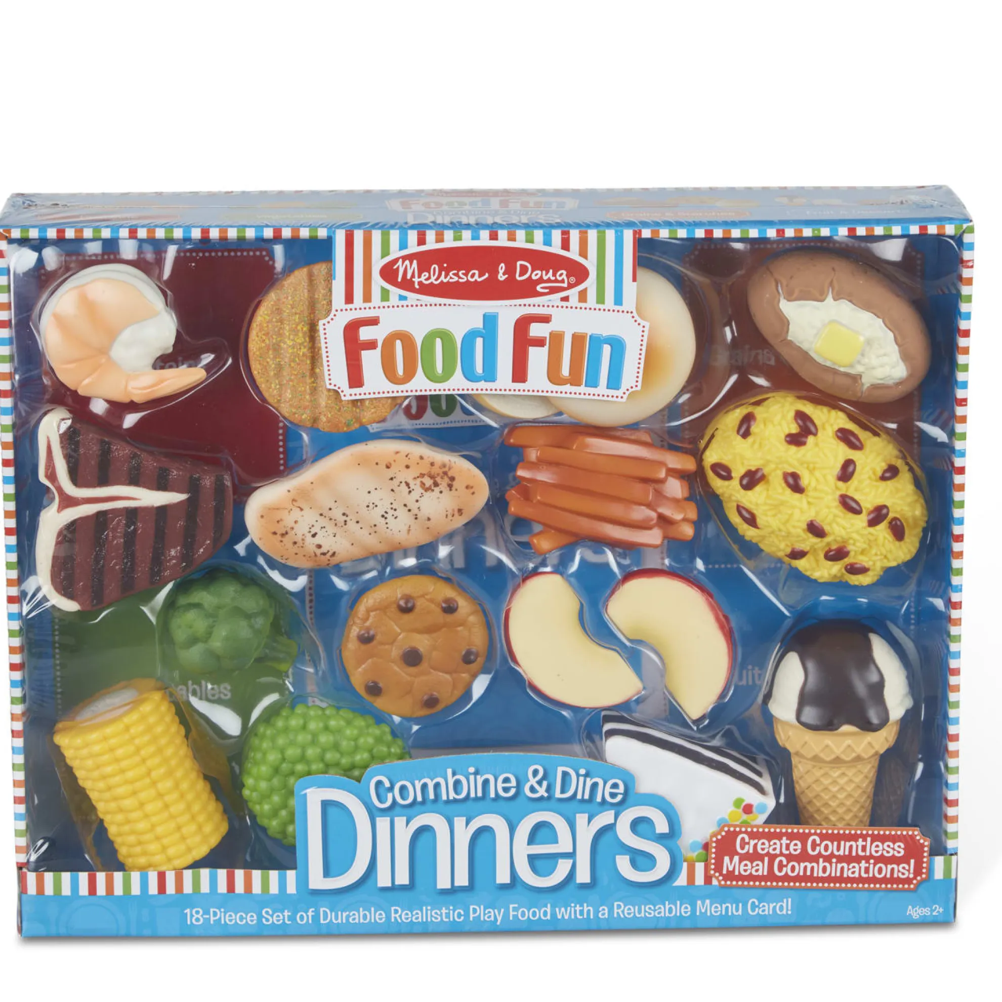 Satisfy hungry imaginations with this 18-piece set of durable realistic play food! Kids three and older will make memorable make-believe meals with the solid, realistically detailed food pieces, while also learning about nutrition and the importance of making and eating balanced meals. Combine & Dine includes proteins (steak, veggie patty, chicken breast, shrimp), grains and starches (rice and beans, 2-part burger bun, sweet potato fires, baked potato), vegetables (peas, broccoli, corn on the cob), and desserts chocolate cake, 2 apple slices, chocolate chip cookie, ice cream cone), as well as a four-sided menu and information card. This playful food set lets young foodies create countless combinations to serve well-balanced fun!