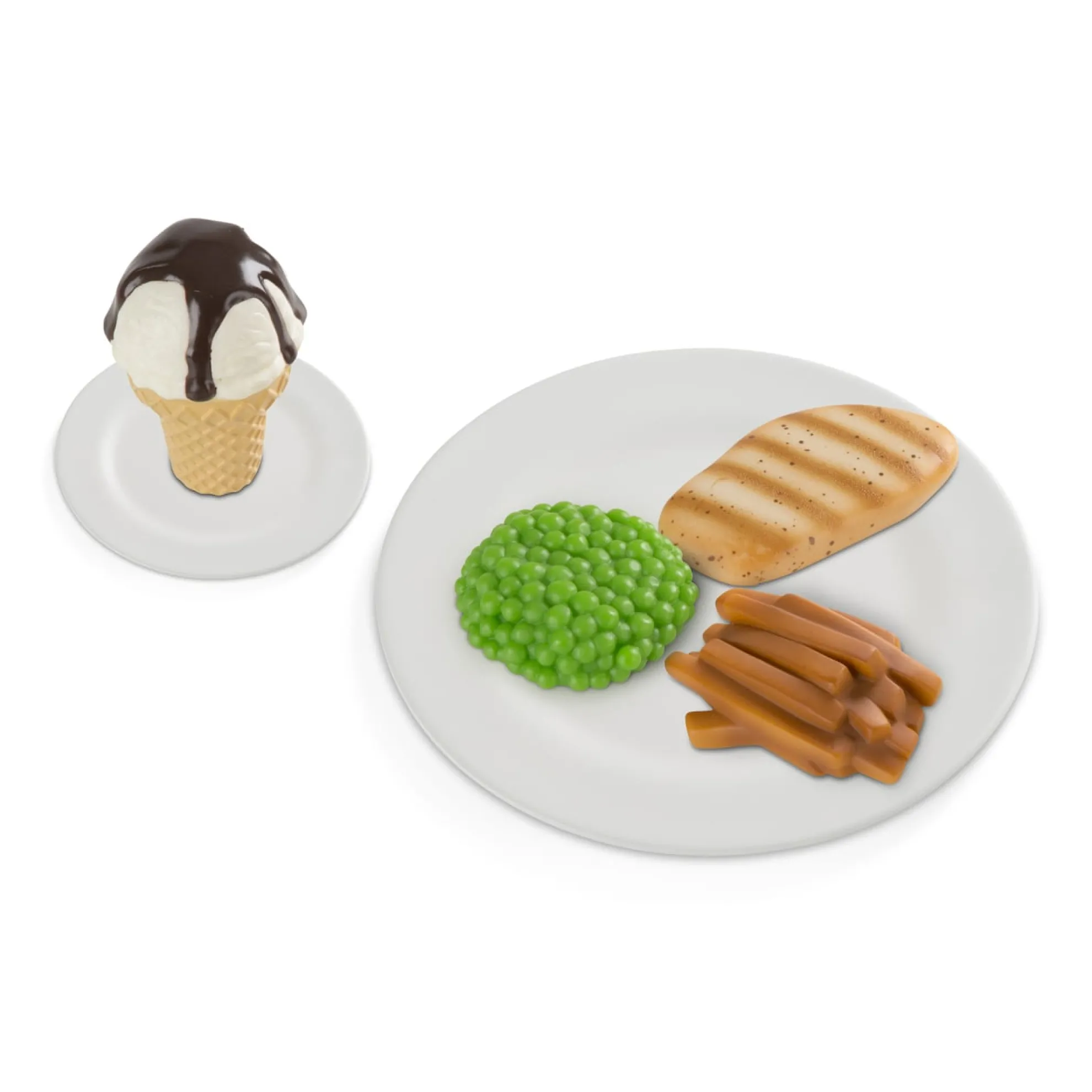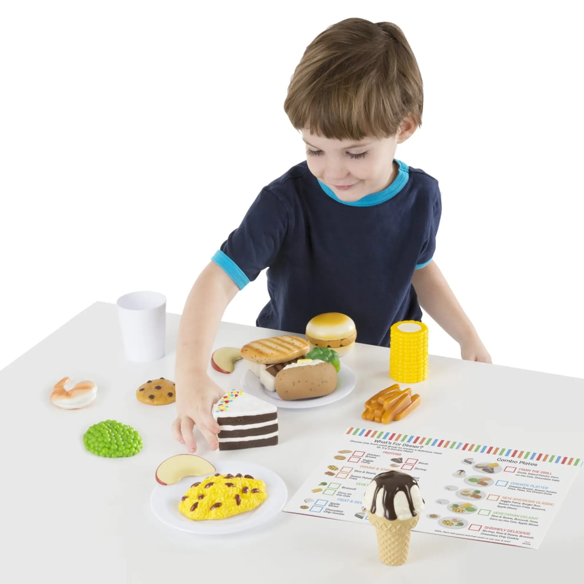 - Includes steak, veggie patty, salmon, chicken, peas, broccoli, corn on the cob, rice and beans, burger bun, sweet potato fries, baked potato, cake, apple slices, cookie, ice cream cone, reusable menu card