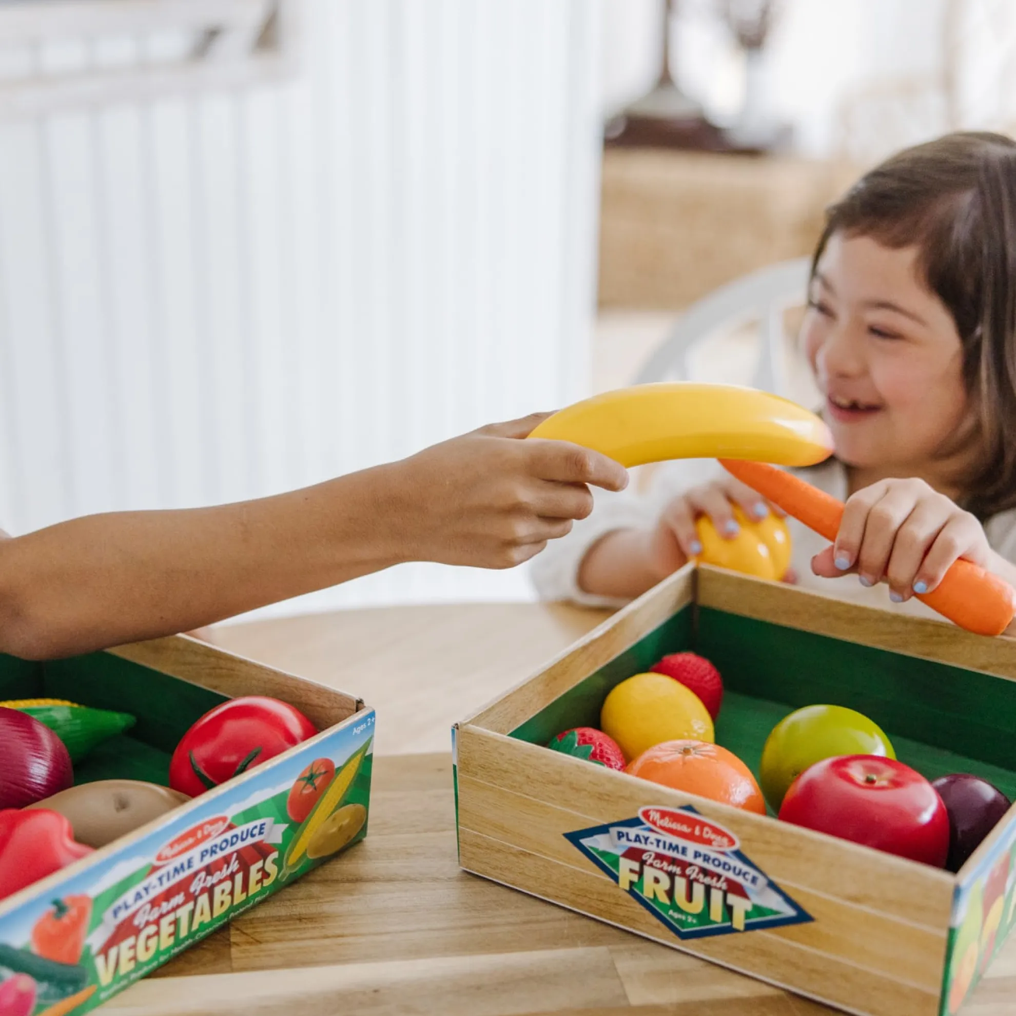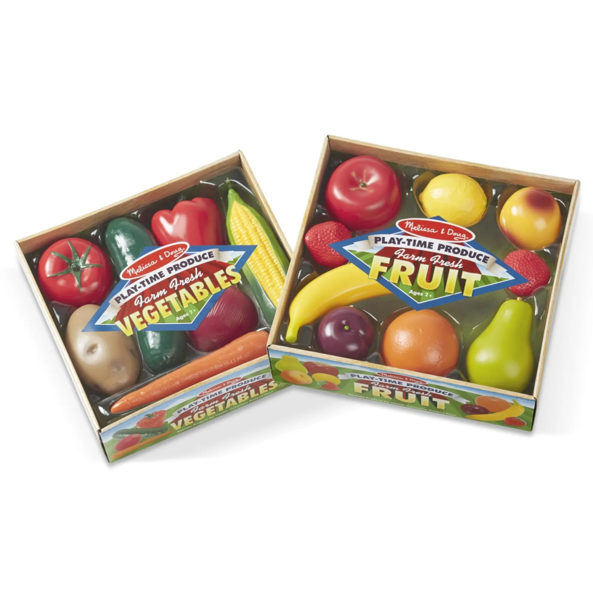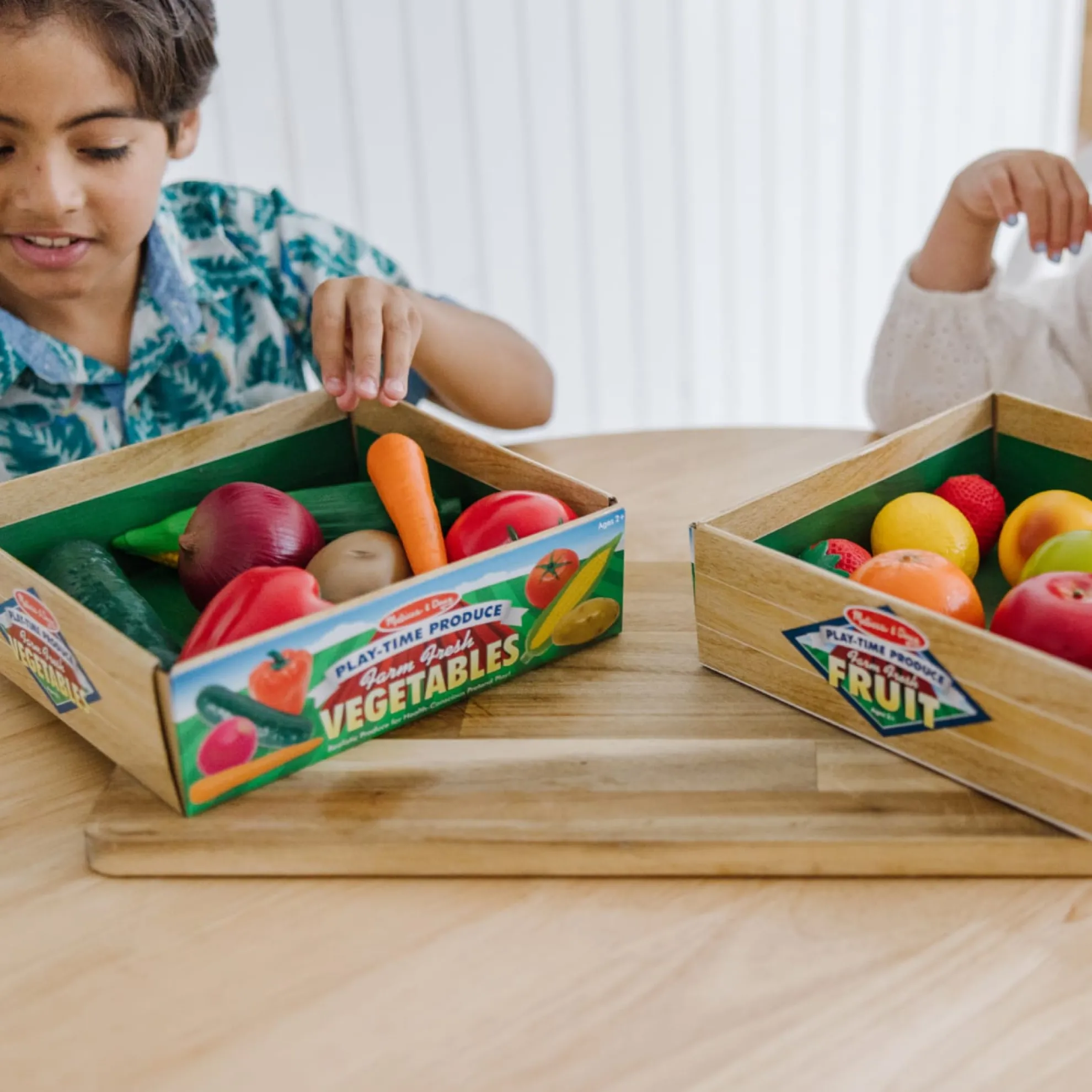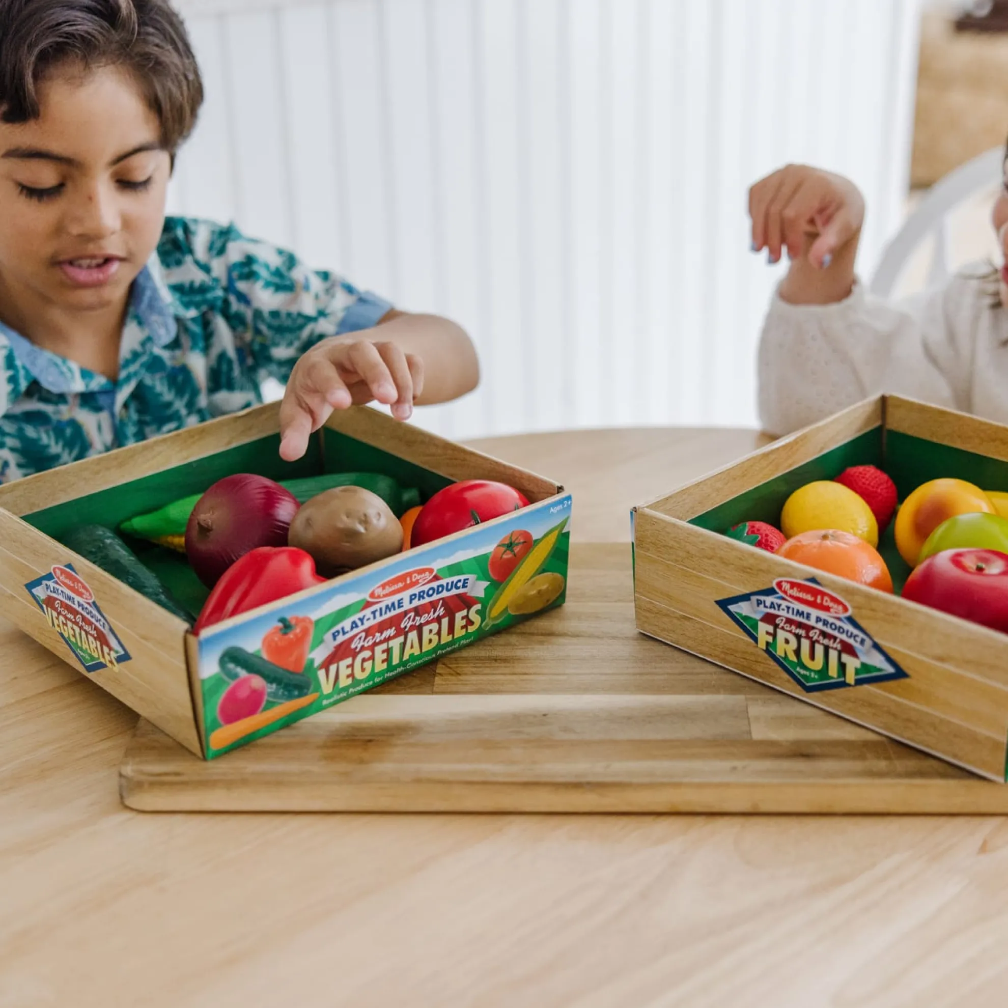 The Melissa & Doug Combo Fruit & Veggies Set features pretend produce that looks like it’s fresh off the farm! The Playtime Produce combo includes a set of veggies and a set of fruits, each packed in a sturdy wooden crate. The pretend food is realistically sized, colored, and designed to look like the real thing. The toy fruit and vegetable set is just ripe for pretend play. Kids can imagine grocery shopping, visiting the farmers’ market, cooking in the kitchen, and many more fun activities. The vegetable set has 7 pieces, and the fruit set includes 9 pieces, each made of durable, molded plastic. The produce features items that kids can recognize such as an ear of corn, a tomato, a potato, an apple, a pear, strawberries, and more. The Combo Fruit & Veggies set makes an exceptional gift for girls and boys ages three and over for hands-on, screen-free play.