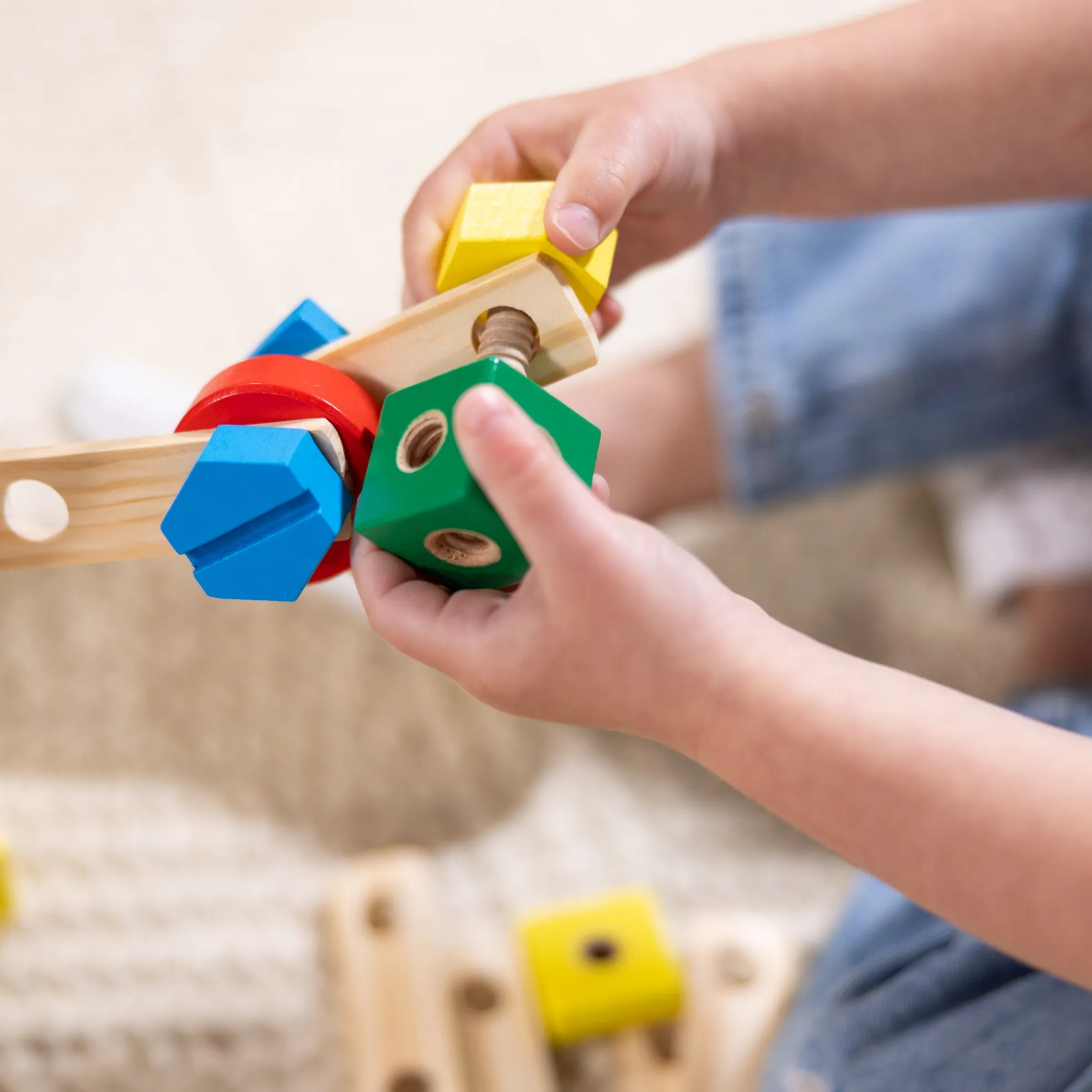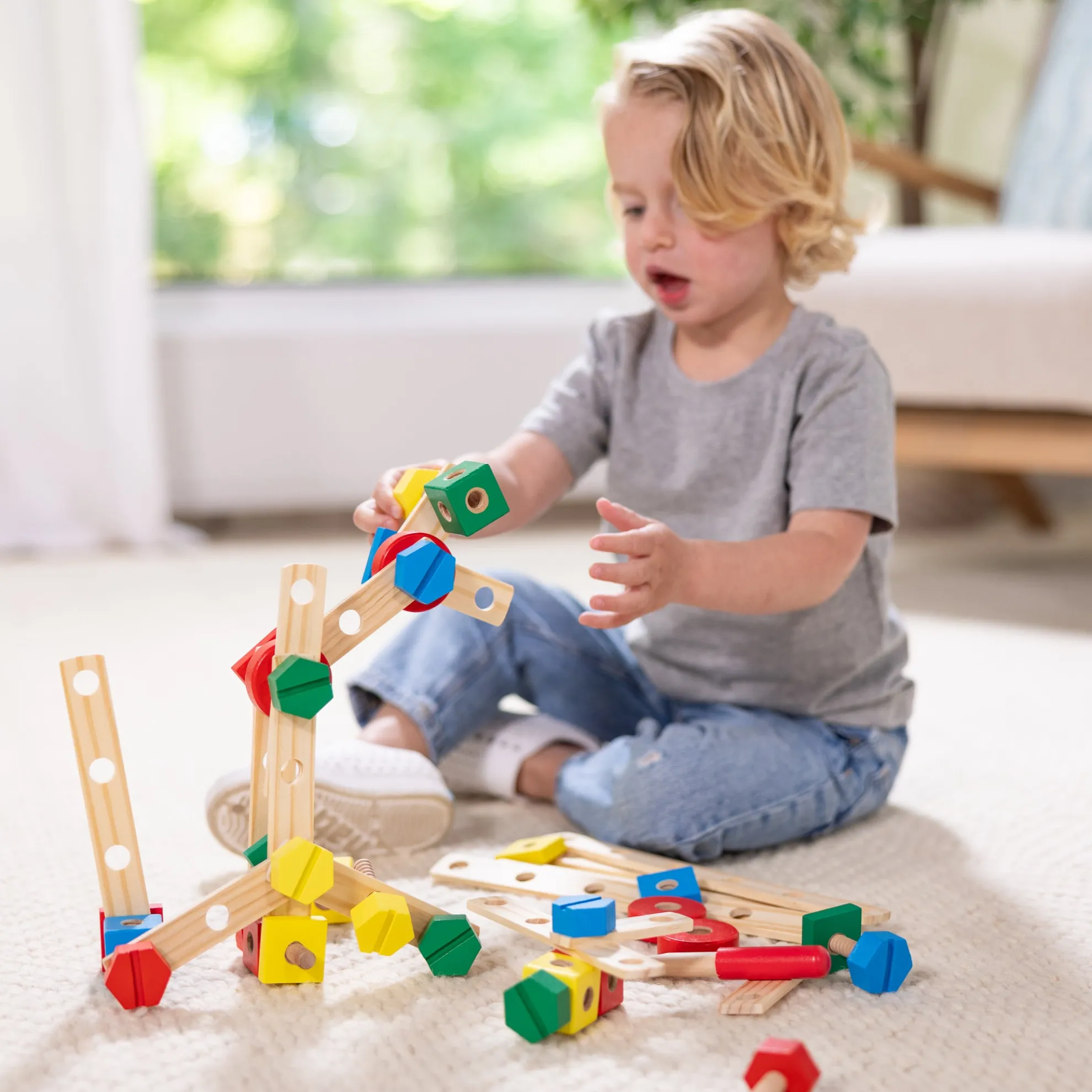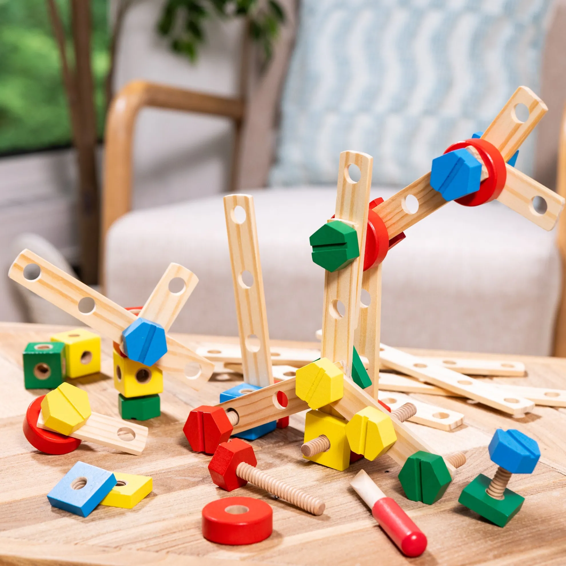 With 48 wooden pieces (including nuts, bolts, drilled bars to connect, and a child-size screwdriver), this classic building set gives kids all they need to tinker and build! Printed right on the sturdy storage box are building plans for a crane, motorcycle, airplane, and race car to get the fun started. With some imagination and a few creative twists and turns, kids can make hundreds more amazing structures too! Any time kids play with this durable set, they’ll be building fine motor skills, problem-solving skills, and hand-eye coordination. Included extension activities guide parents to educational activities that also build early math skills.
