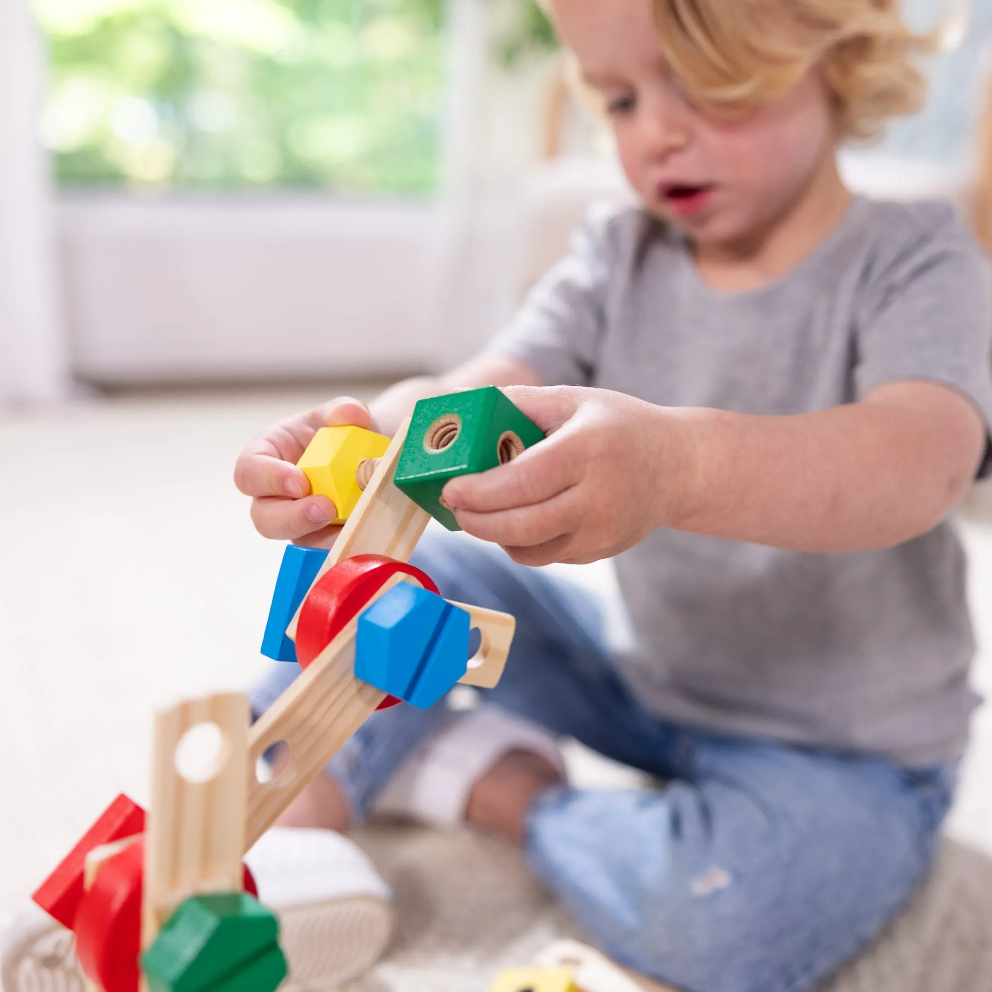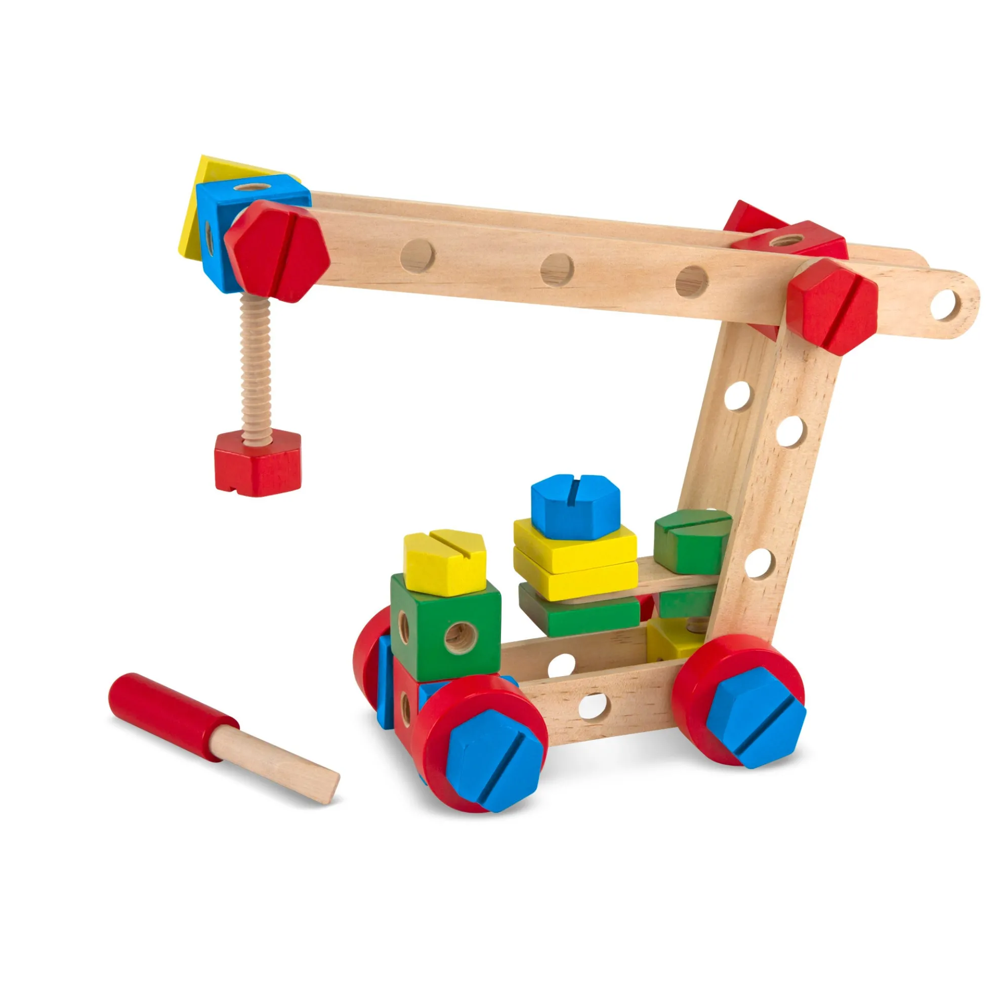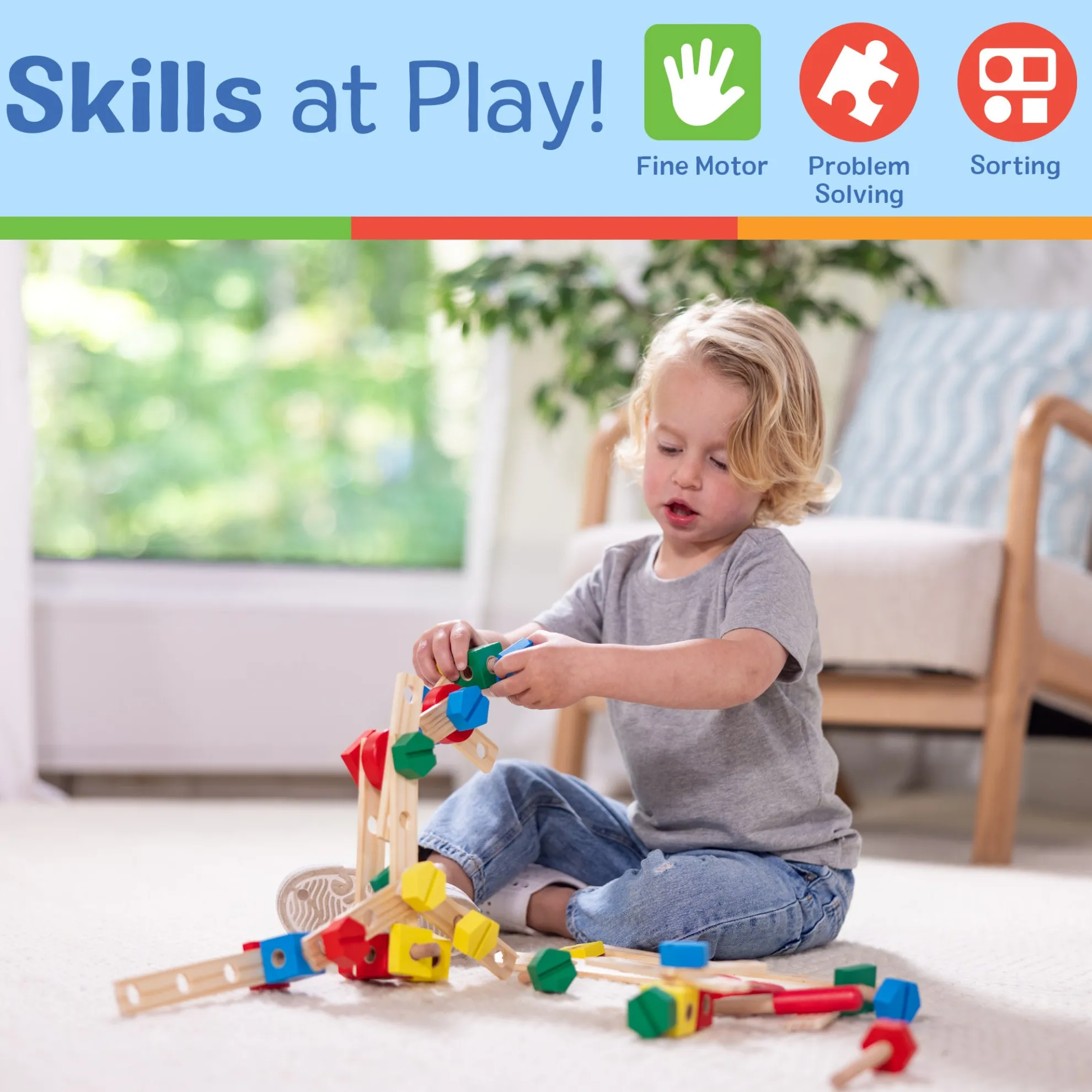 With 48 wooden pieces (including nuts, bolts, drilled bars to connect, and a child-size screwdriver), this classic building set gives kids all they need to tinker and build! Printed right on the sturdy storage box are building plans for a crane, motorcycle, airplane, and race car to get the fun started. With some imagination and a few creative twists and turns, kids can make hundreds more amazing structures too! Any time kids play with this durable set, they’ll be building fine motor skills, problem-solving skills, and hand-eye coordination. Included extension activities guide parents to educational activities that also build early math skills.